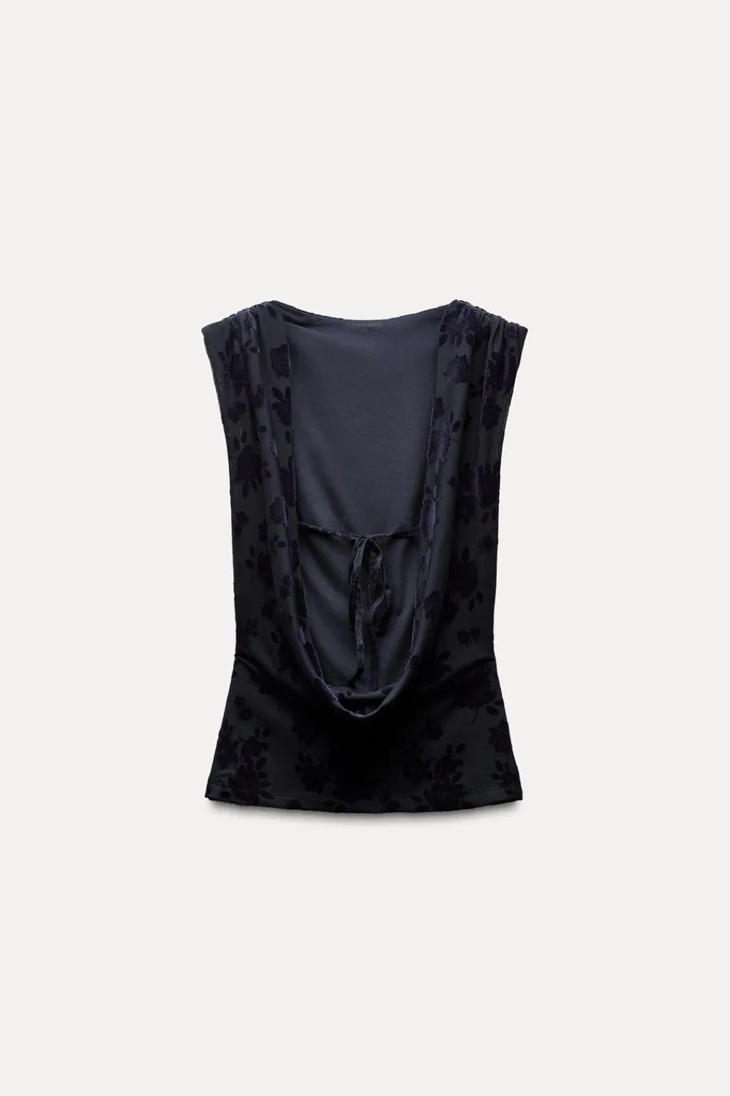 Top de cuello redondo y manga sisa con detalle de frunces en hombro. Espalda descubierta con tejido drapeado y detalle de lazada.