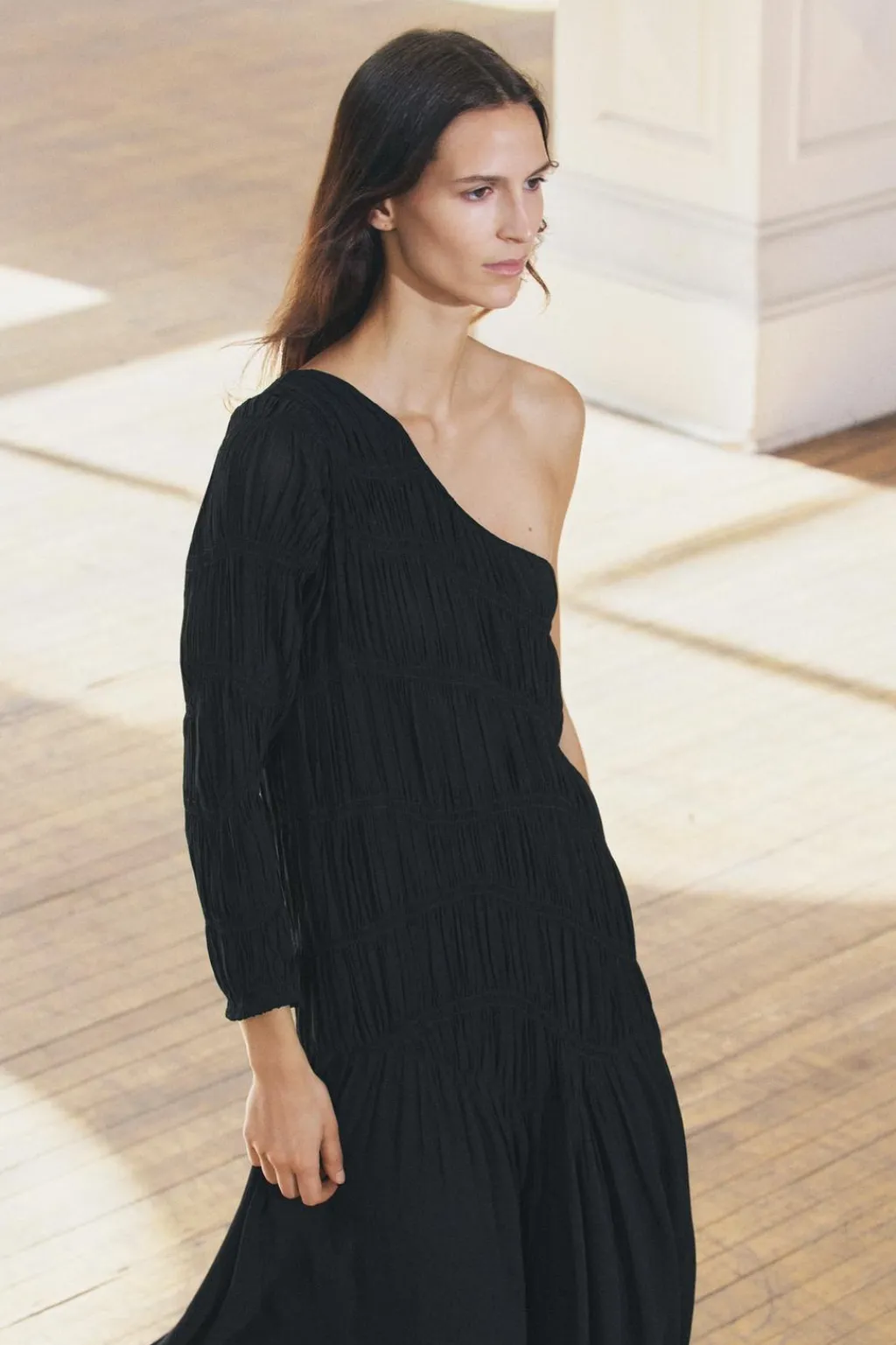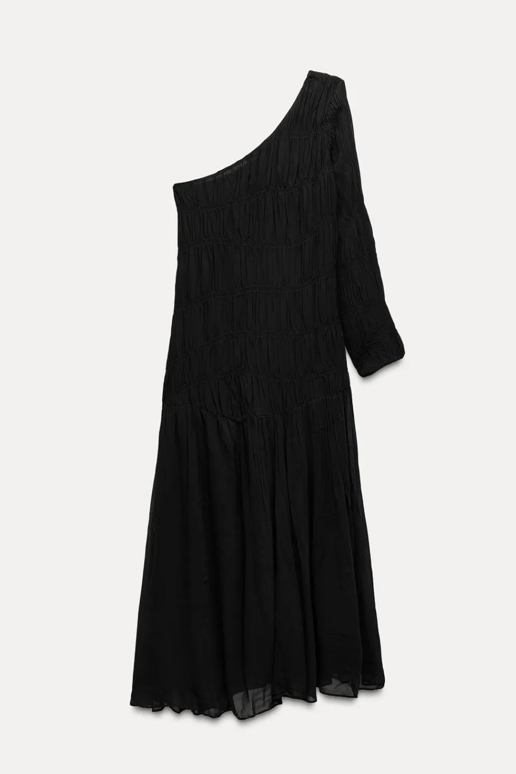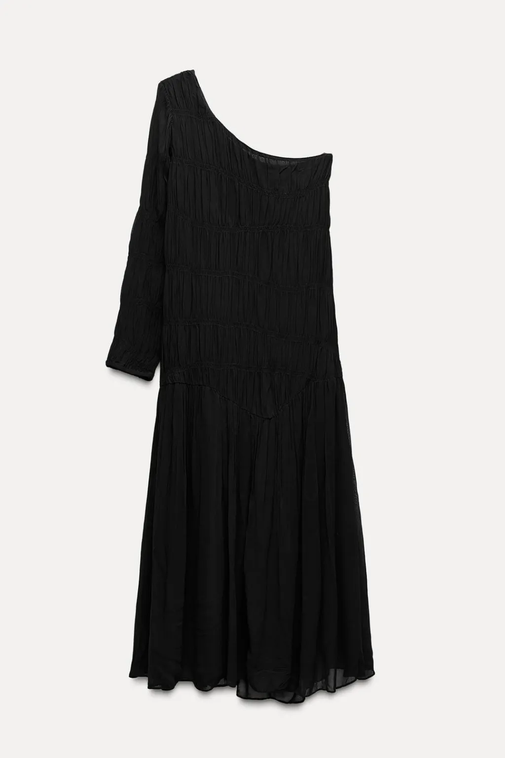 Vestido midi confeccionado en hilatura de viscosa. Escote asimétrico y manga larga. Detalle de tejido con frunces. Bajo asimétrico.