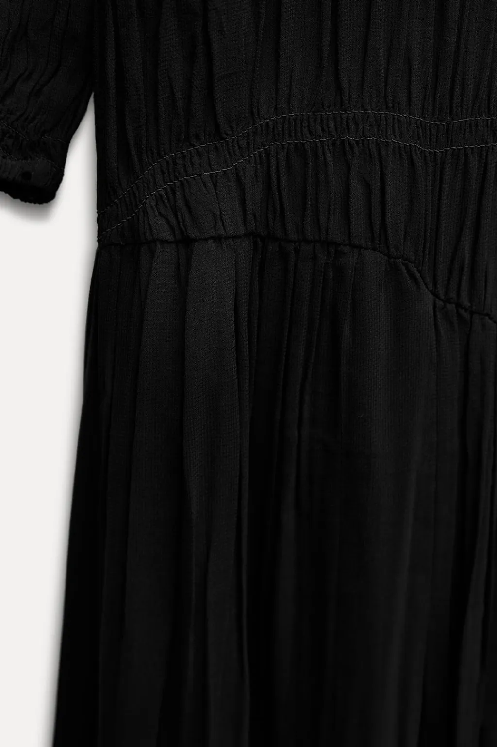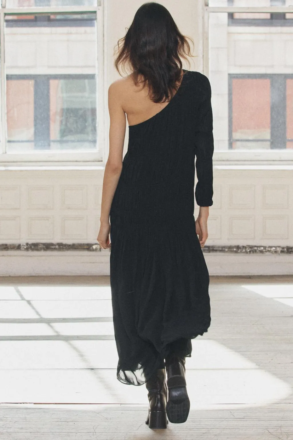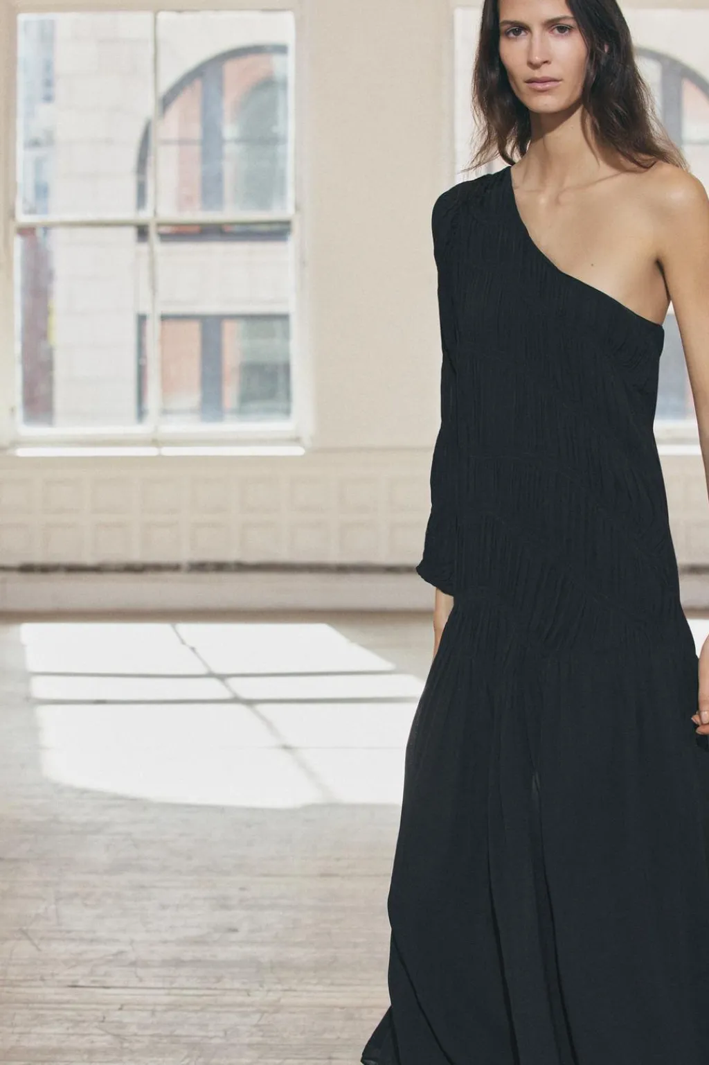 Vestido midi confeccionado en hilatura de viscosa. Escote asimétrico y manga larga. Detalle de tejido con frunces. Bajo asimétrico.