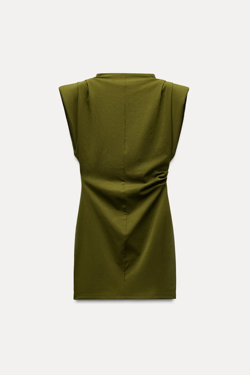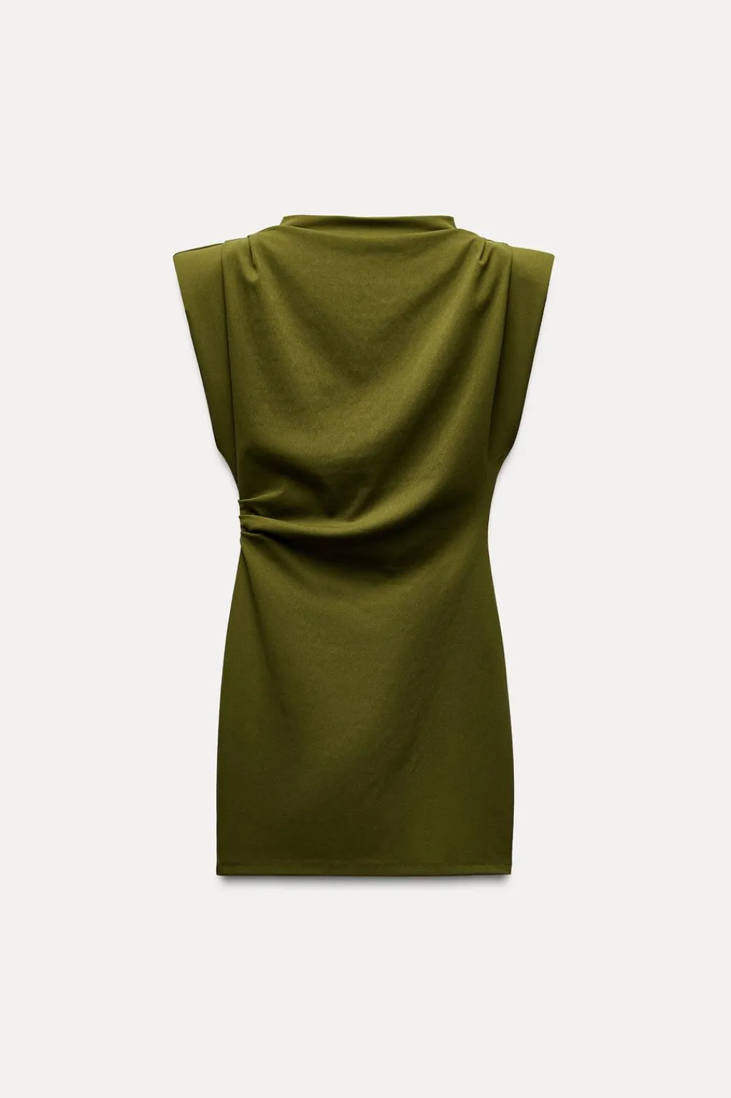 Vestido corto confeccionado en tejido elástico. Cuello subido y manga sisa con hombreras. Detalle de frunces.