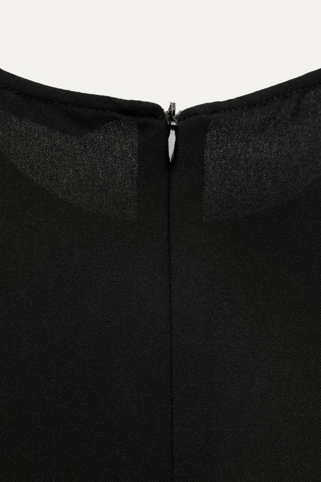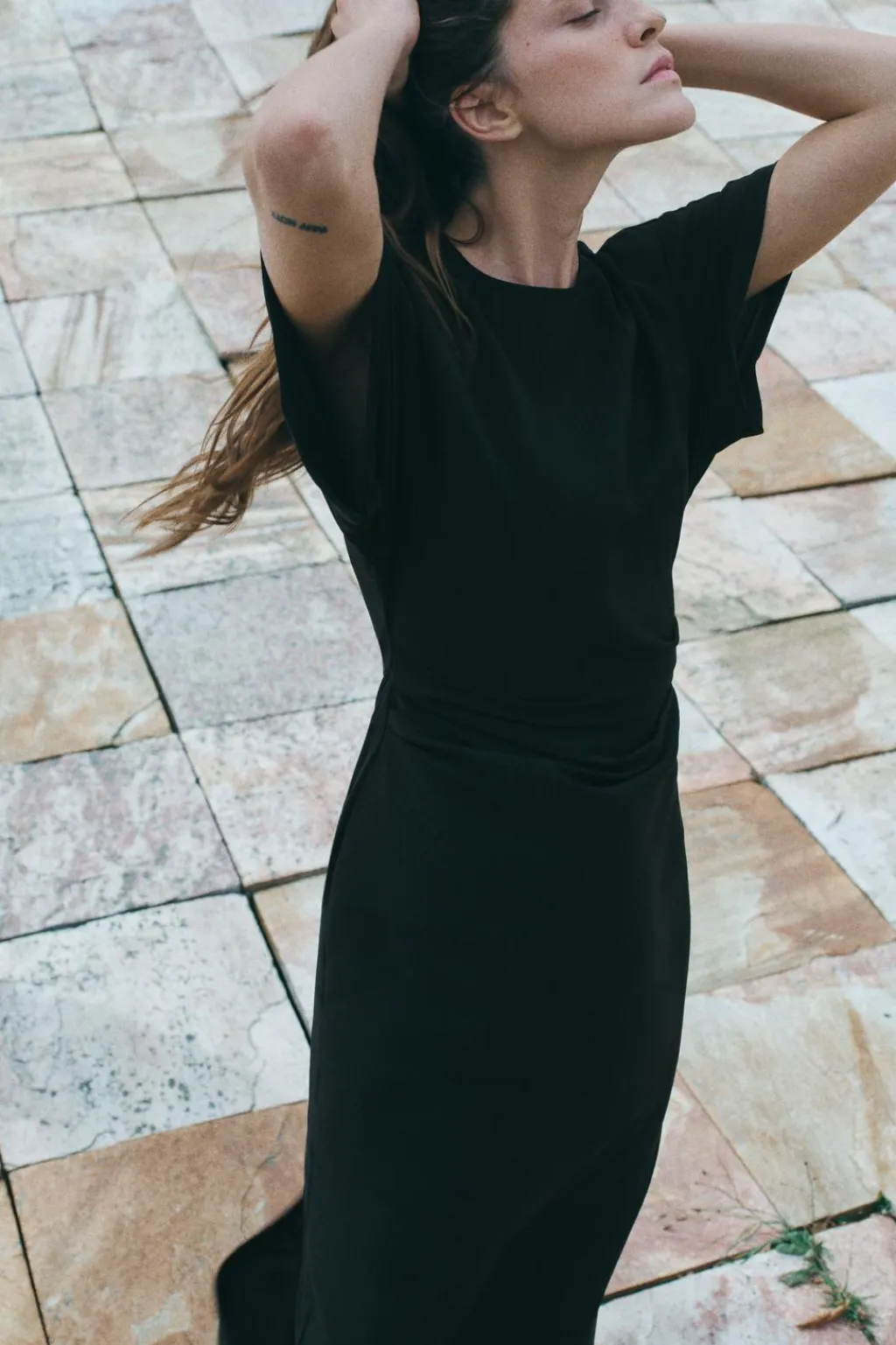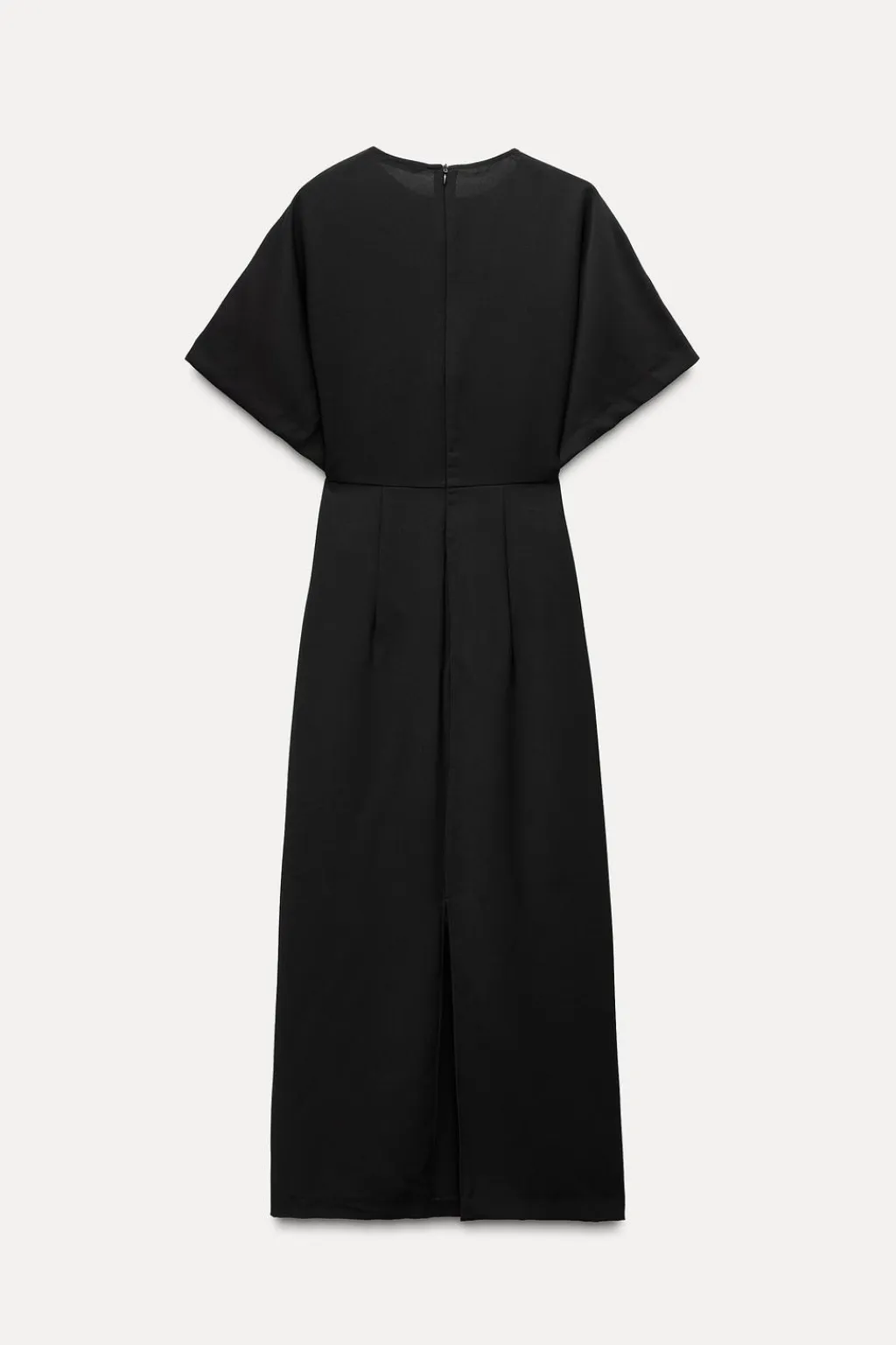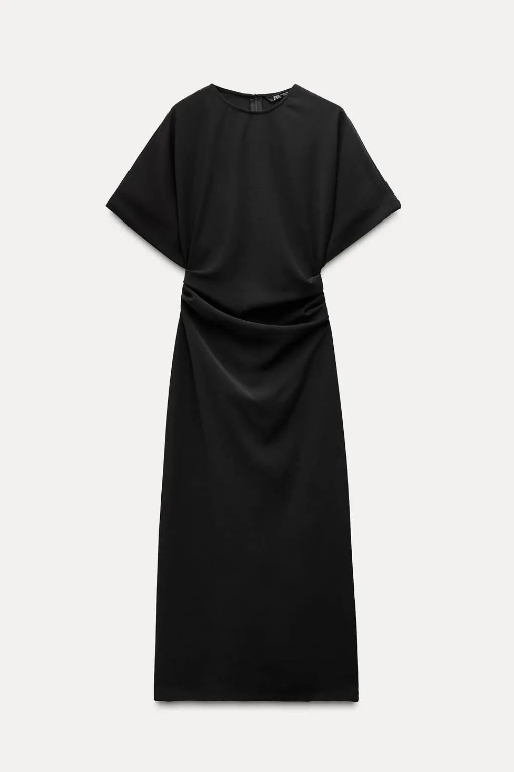 Vestido midi de cuello redondo y manga corta amplia. Detalle de tejido drapeado en cintura. Cierre en espalda con cremallera oculta en costura.
