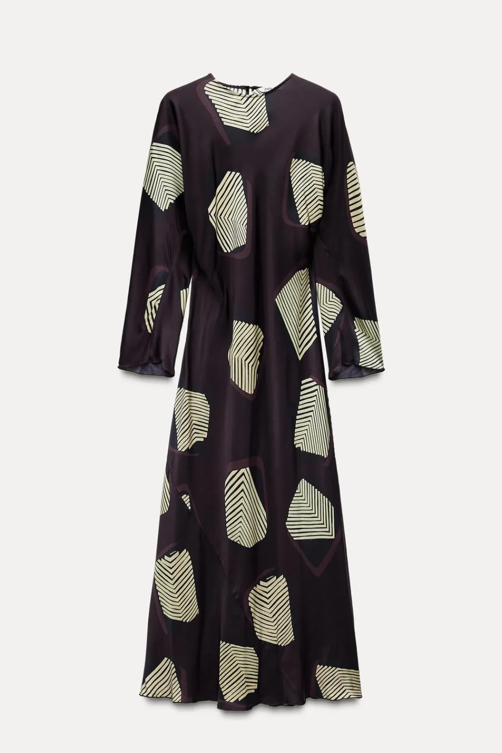 Vestido largo confeccionado en hilatura viscosa. Cuello redondo y manga larga. Bajo redondeado.
