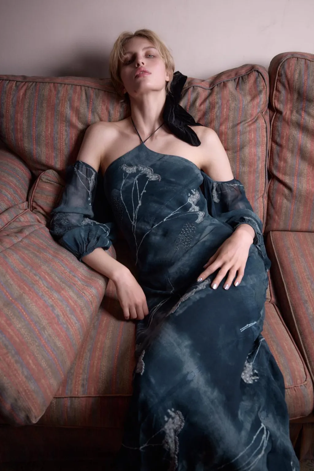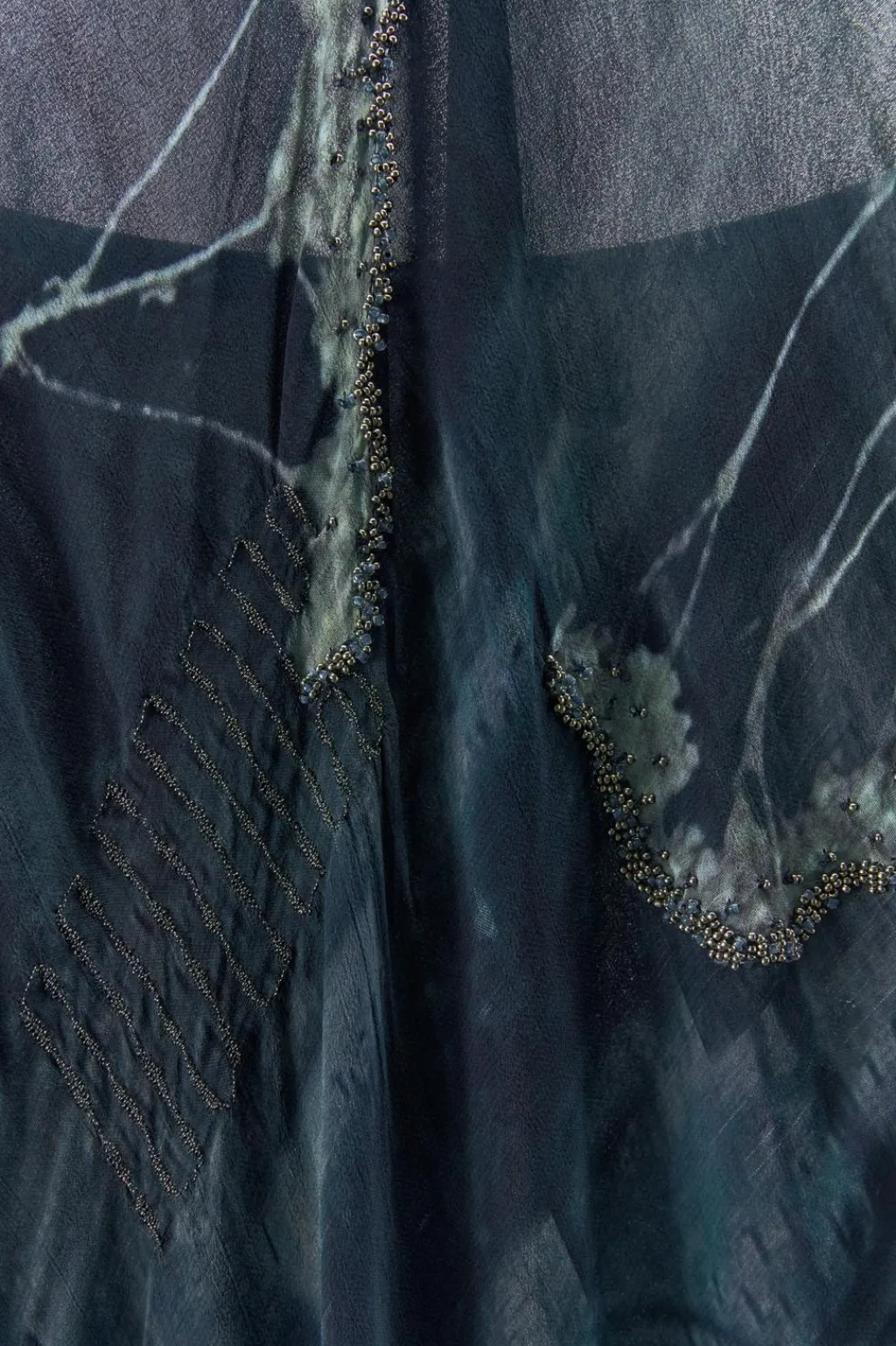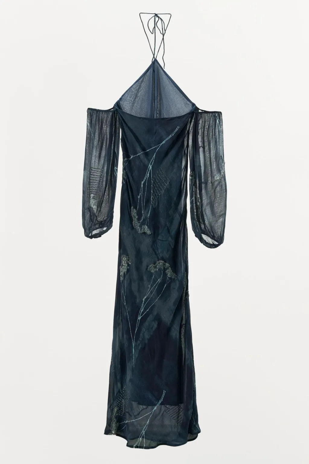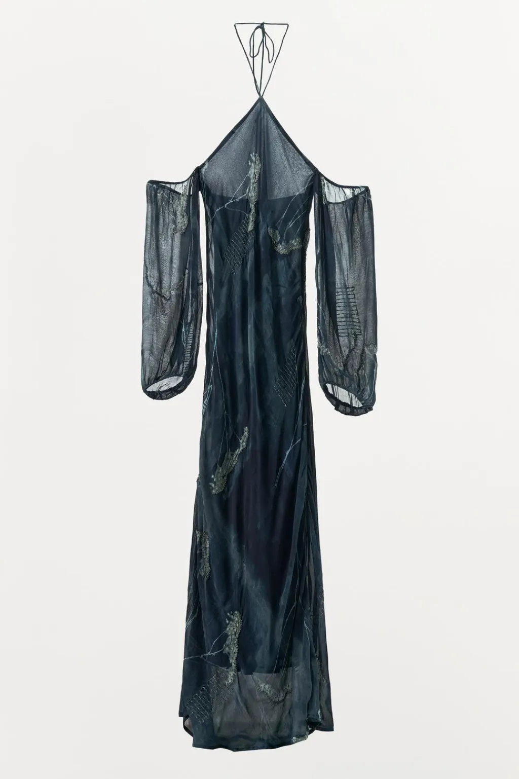 Vestido largo confeccionado en hilatura de viscosa 100%. Cuello halter ajustable con lazada. Manga larga abullonada acabada en elástico y hombros descubiertos. Detalle de bordados con hilo metalizado y aplicación de abalorios combinados a contraste. Forro interior.