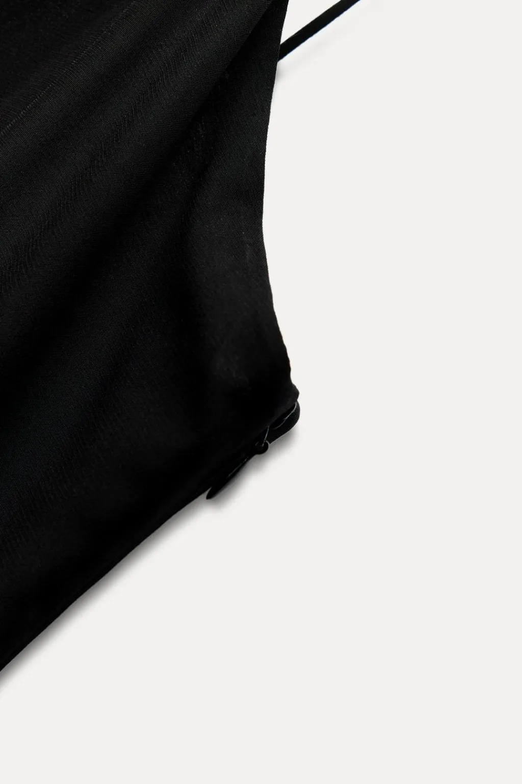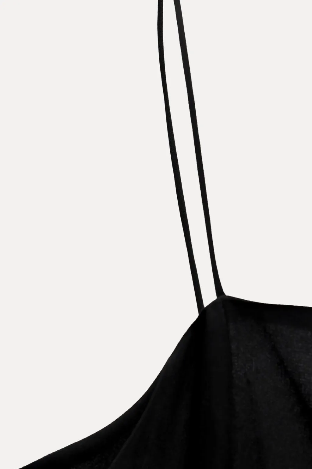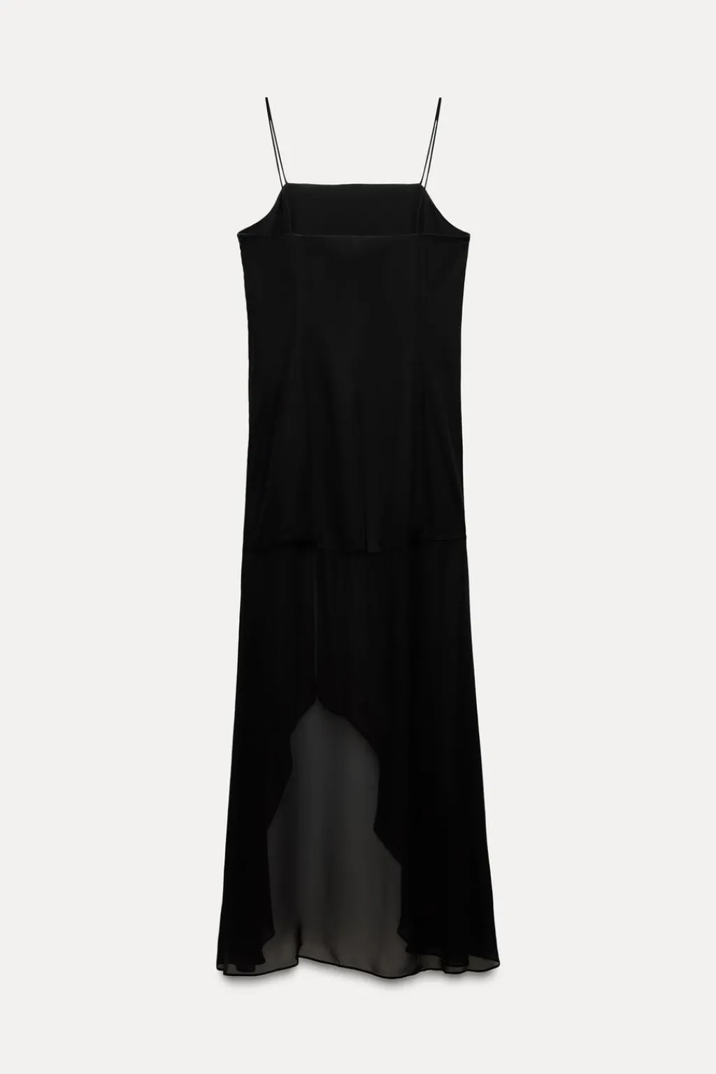 Vestido largo de escote recto y tirantes finos. Bajo asimétrico acabado en tejido a tono con abertura frontal. Cierre lateral con cremallera oculta en costura.