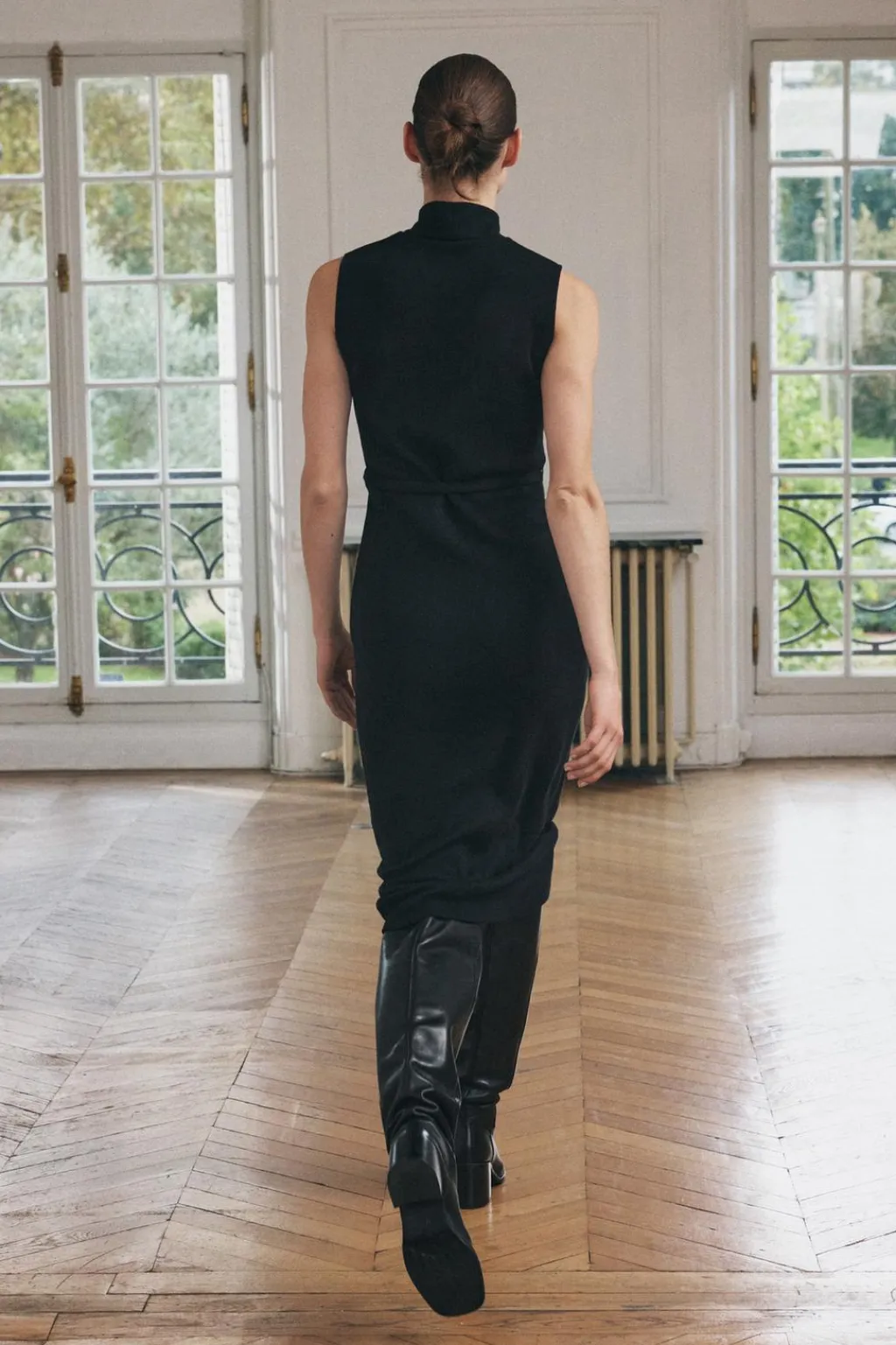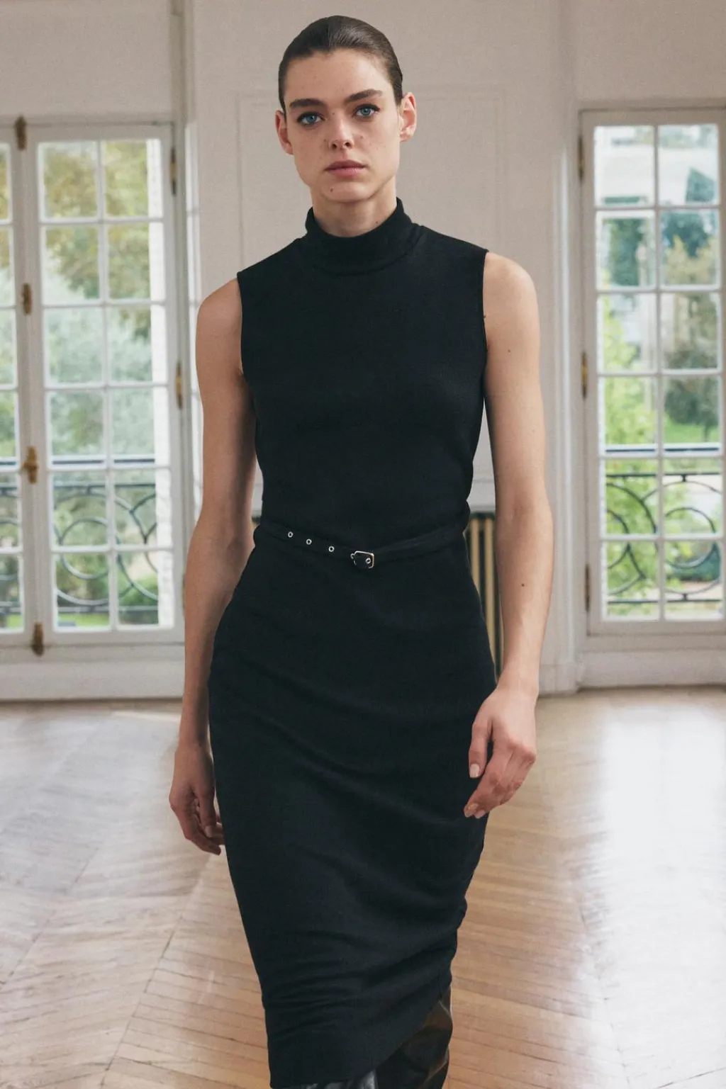 Vestido midi de cuello alto y manga sisa. Cinturón en mismo tejido ajustable con hebilla metálica.