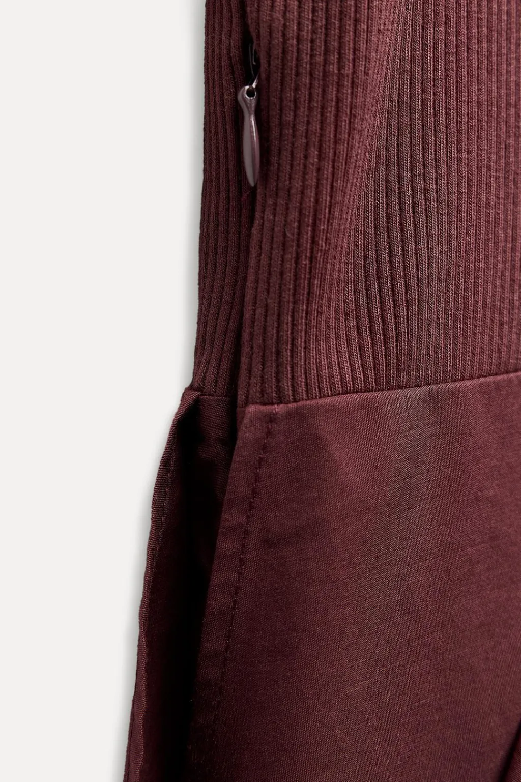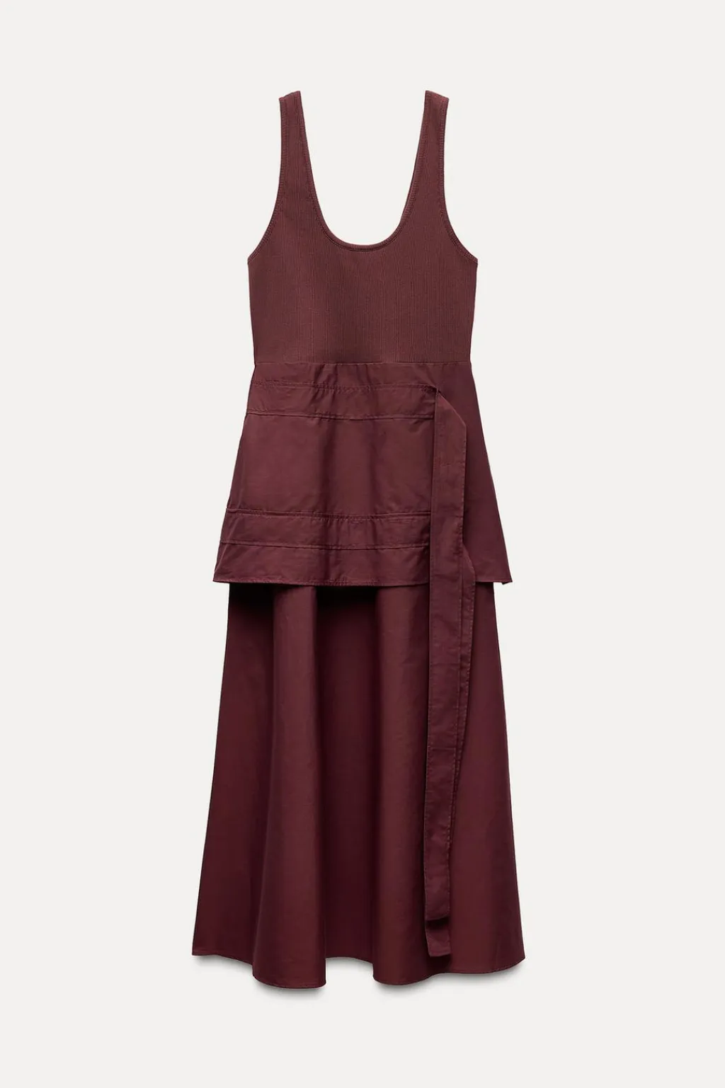 Vestido midi de escote redondo y tirantes anchos. Detalle de combinación de tejidos a tono y cinta en mismo tejido. Bajo acabado en volumen.
