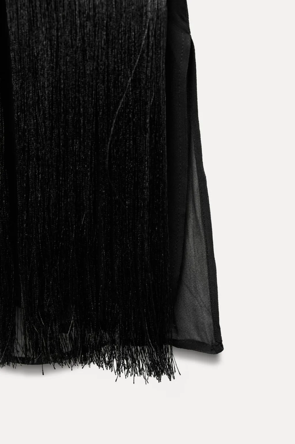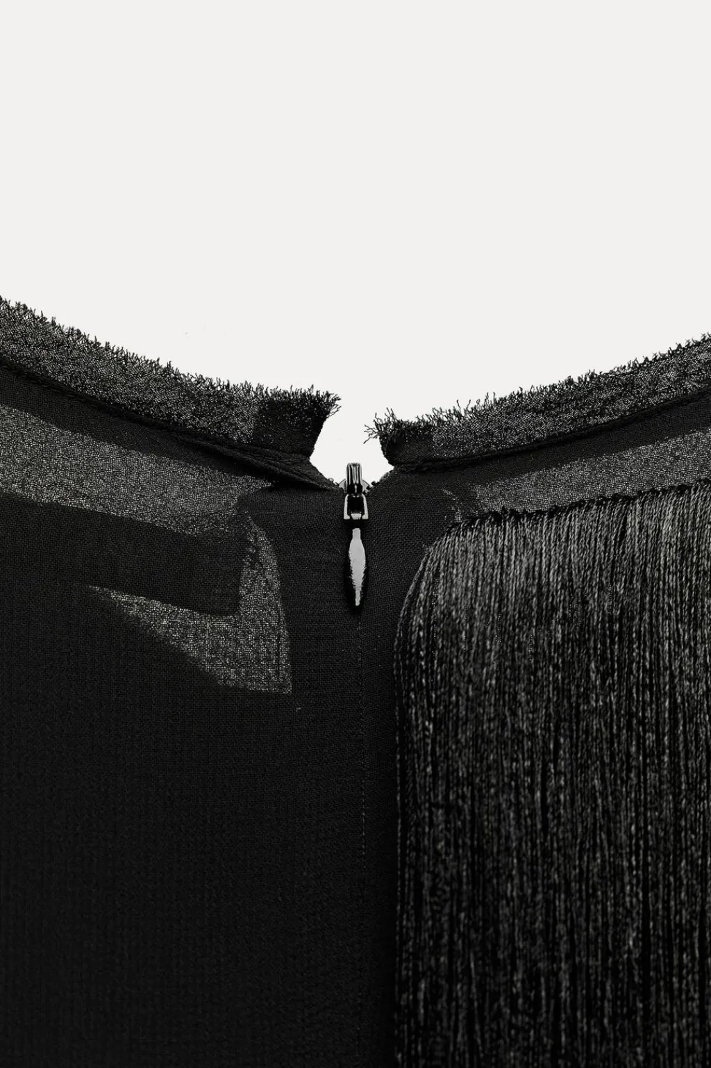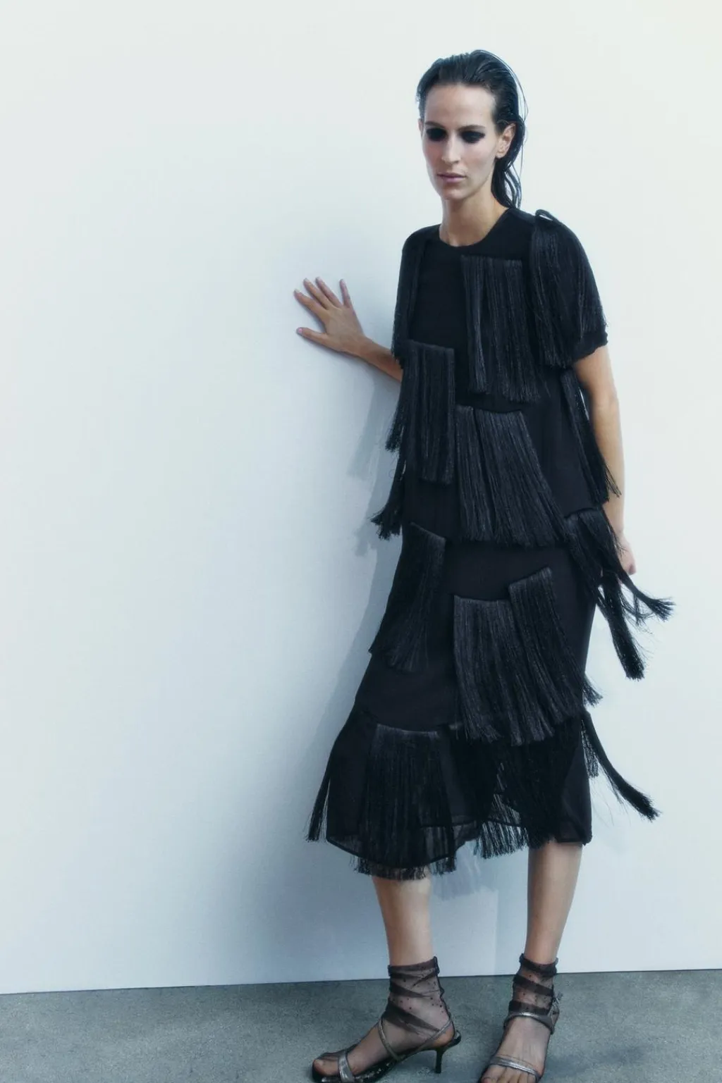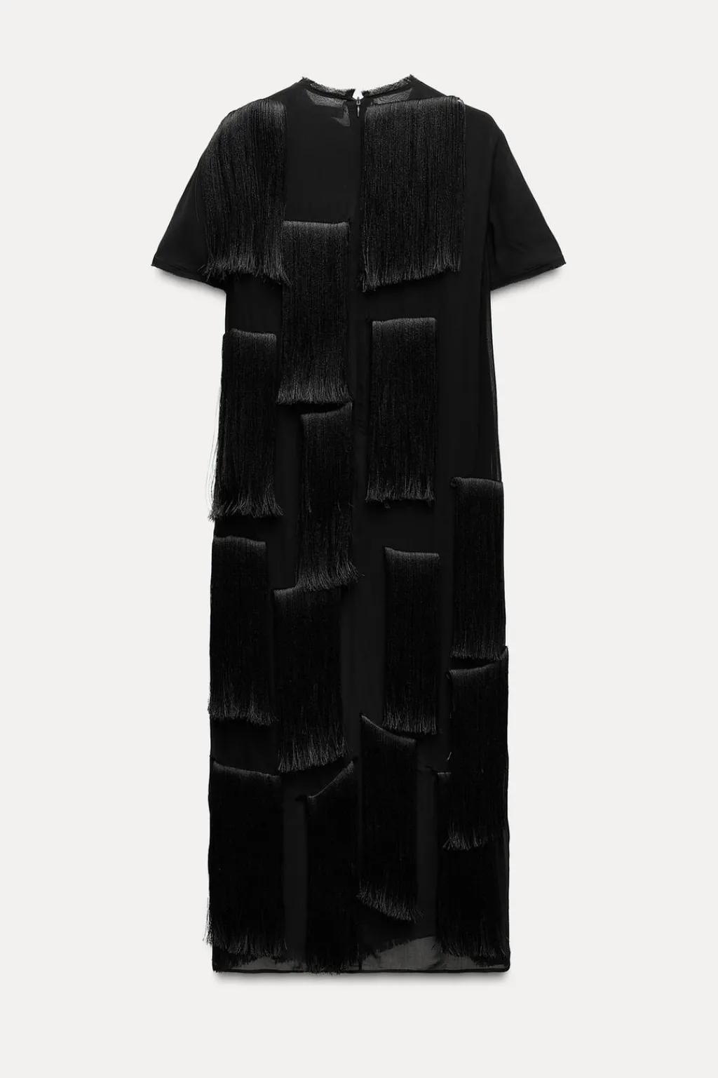 Vestido midi de cuello redondo y manga corta. Detalle de flecos a tono. Cierre en espalda con cremallera oculta en costura.