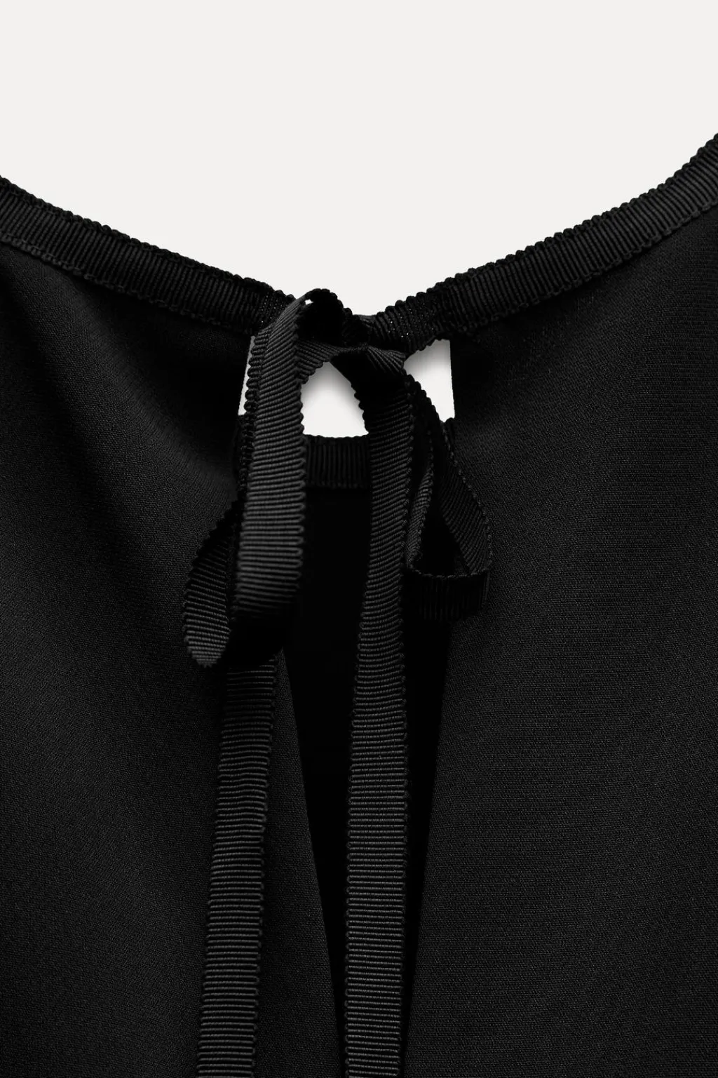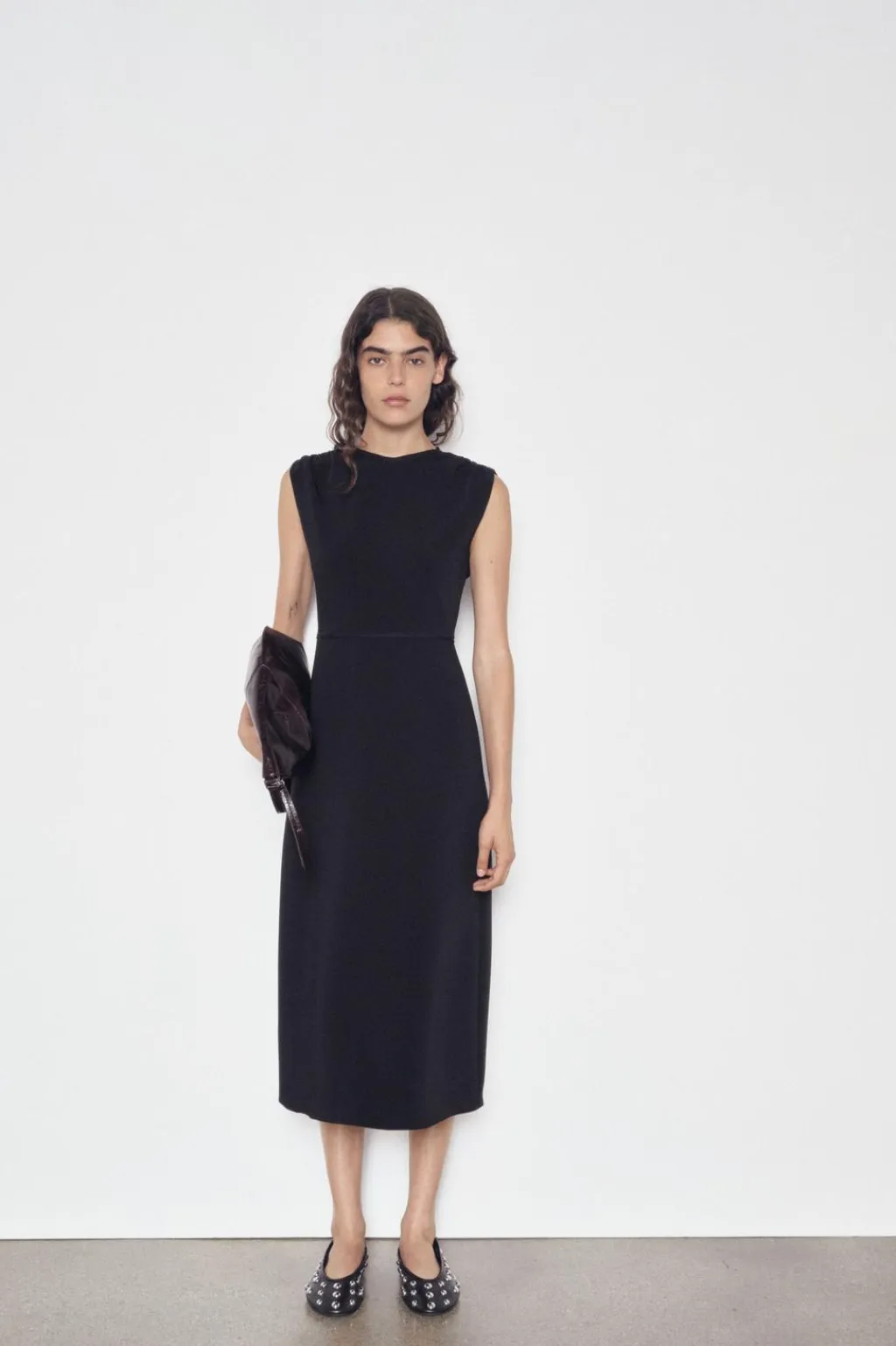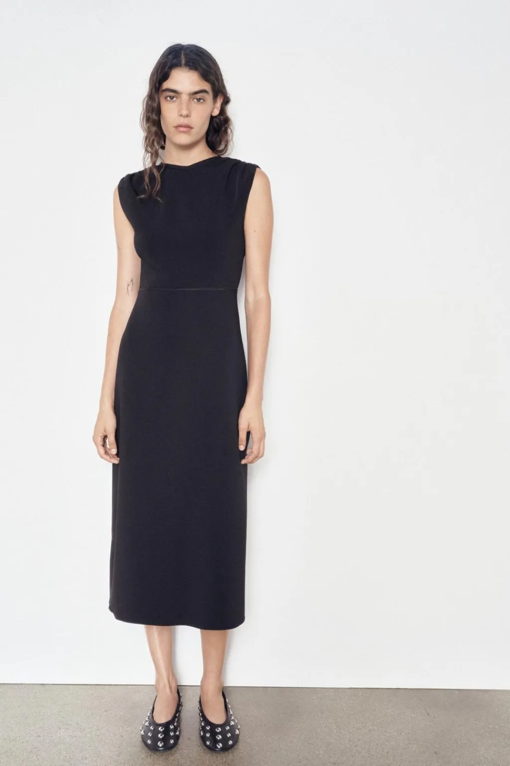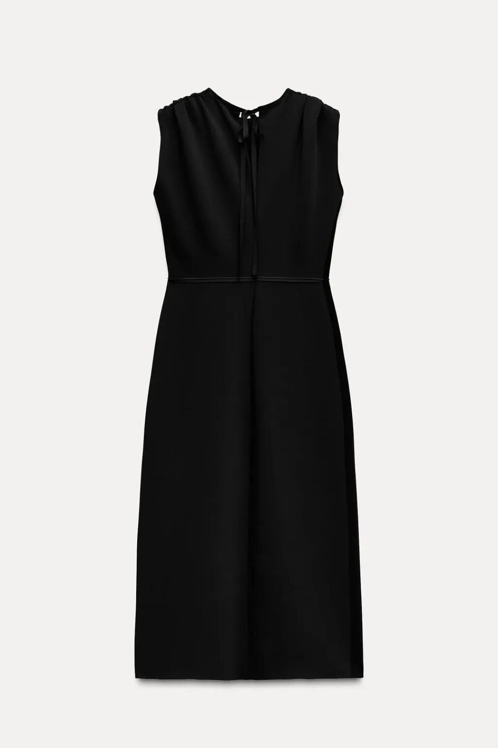 Vestido midi de cuello redondo y manga sisa. Detalle de frunces en hombros. Cierre en espalda con lazadas.