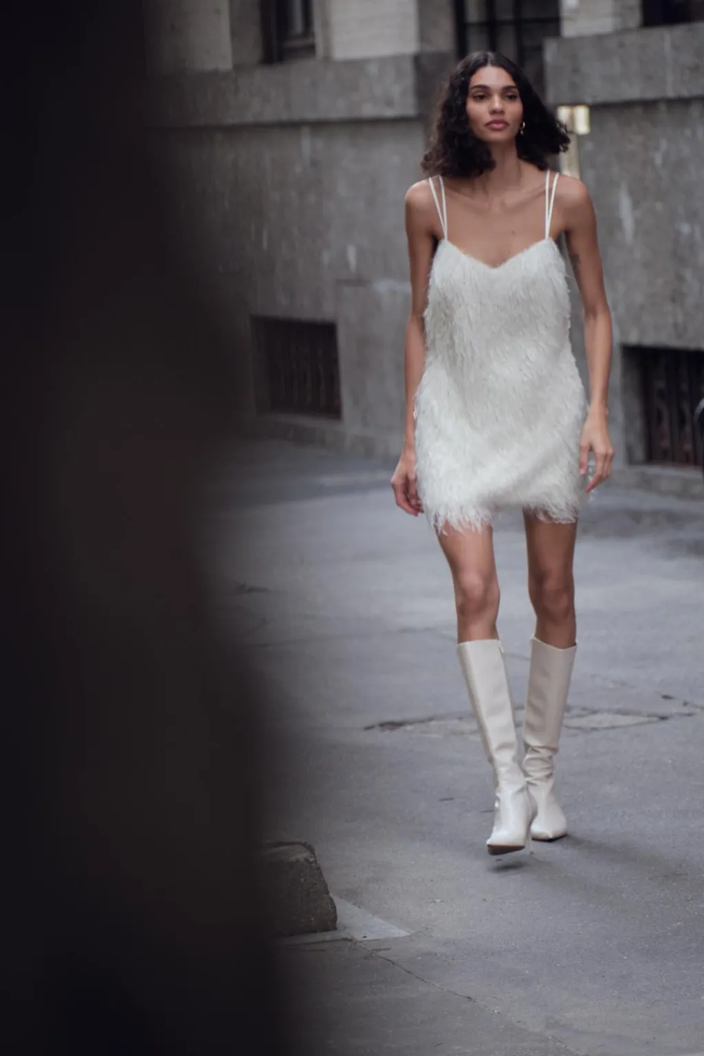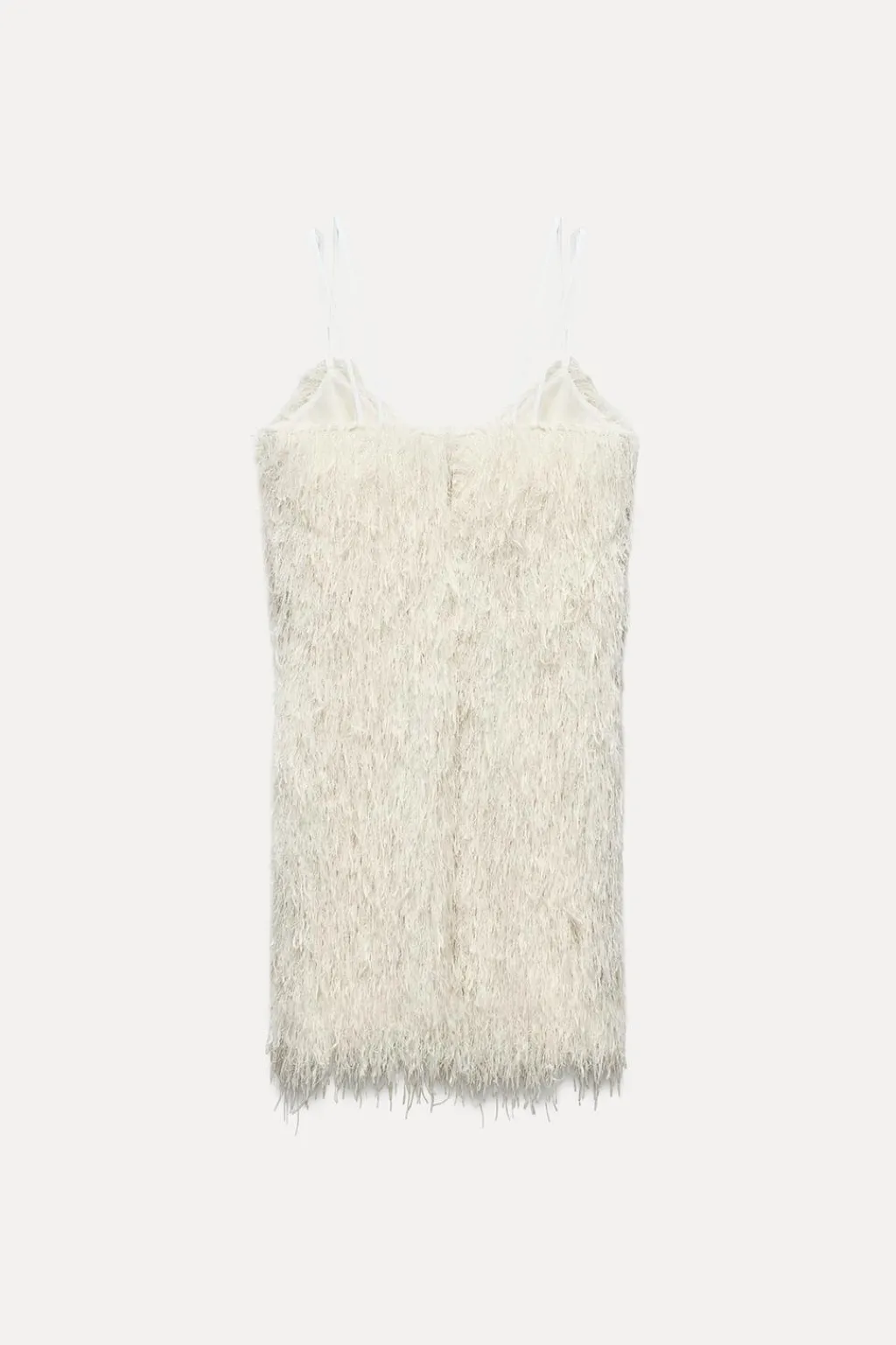 Vestido de escote pico y tirantes finos. Detalle de flecos con hilo metalizado. Cierre en espalda con abertura y botón.