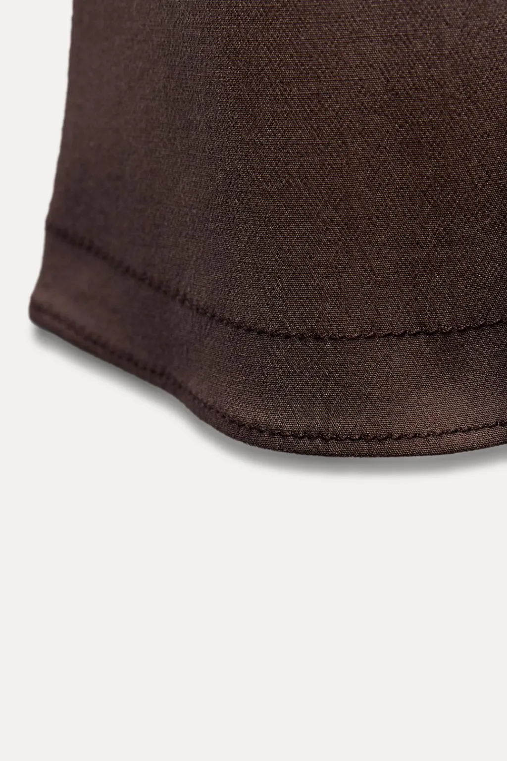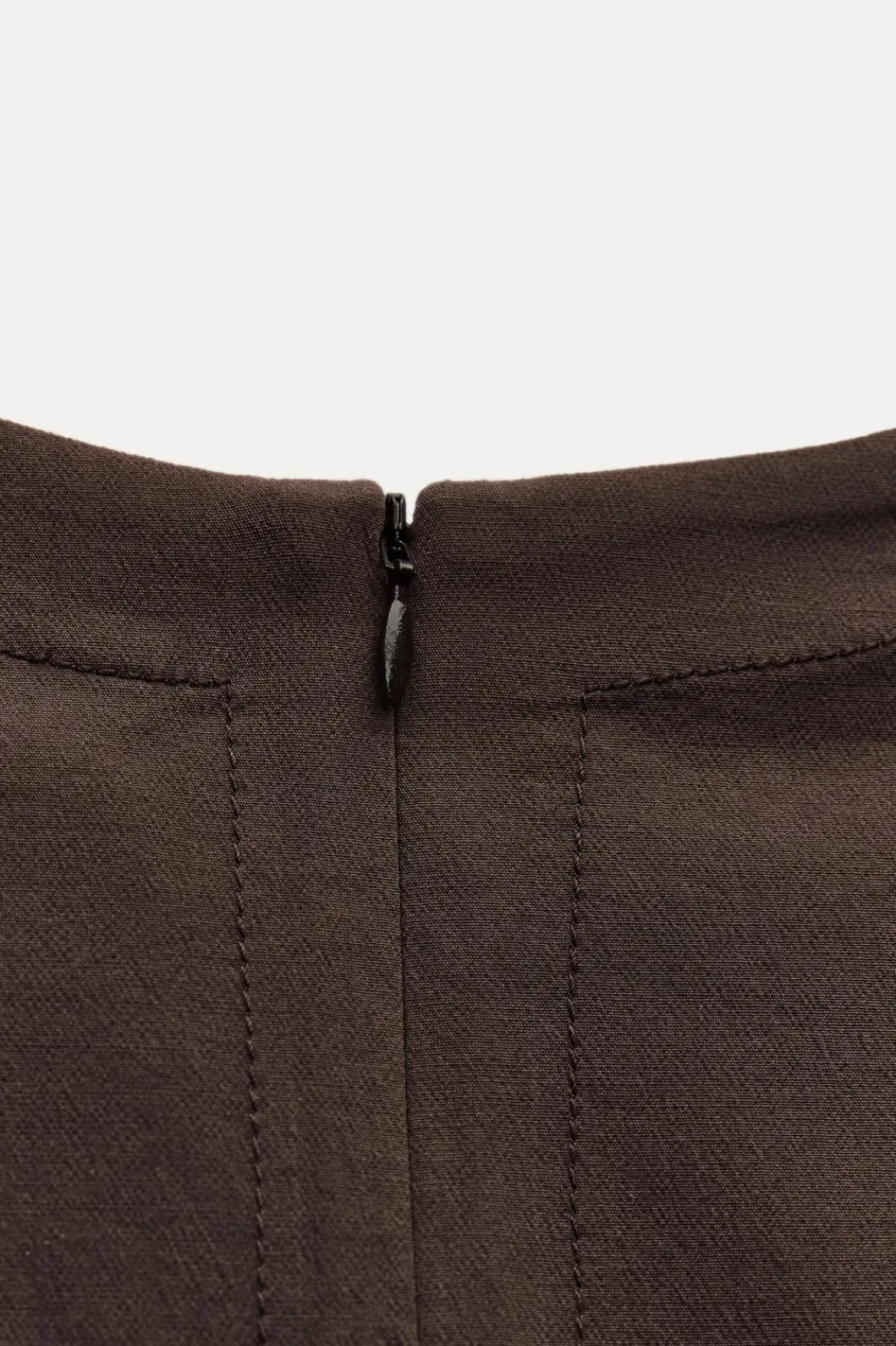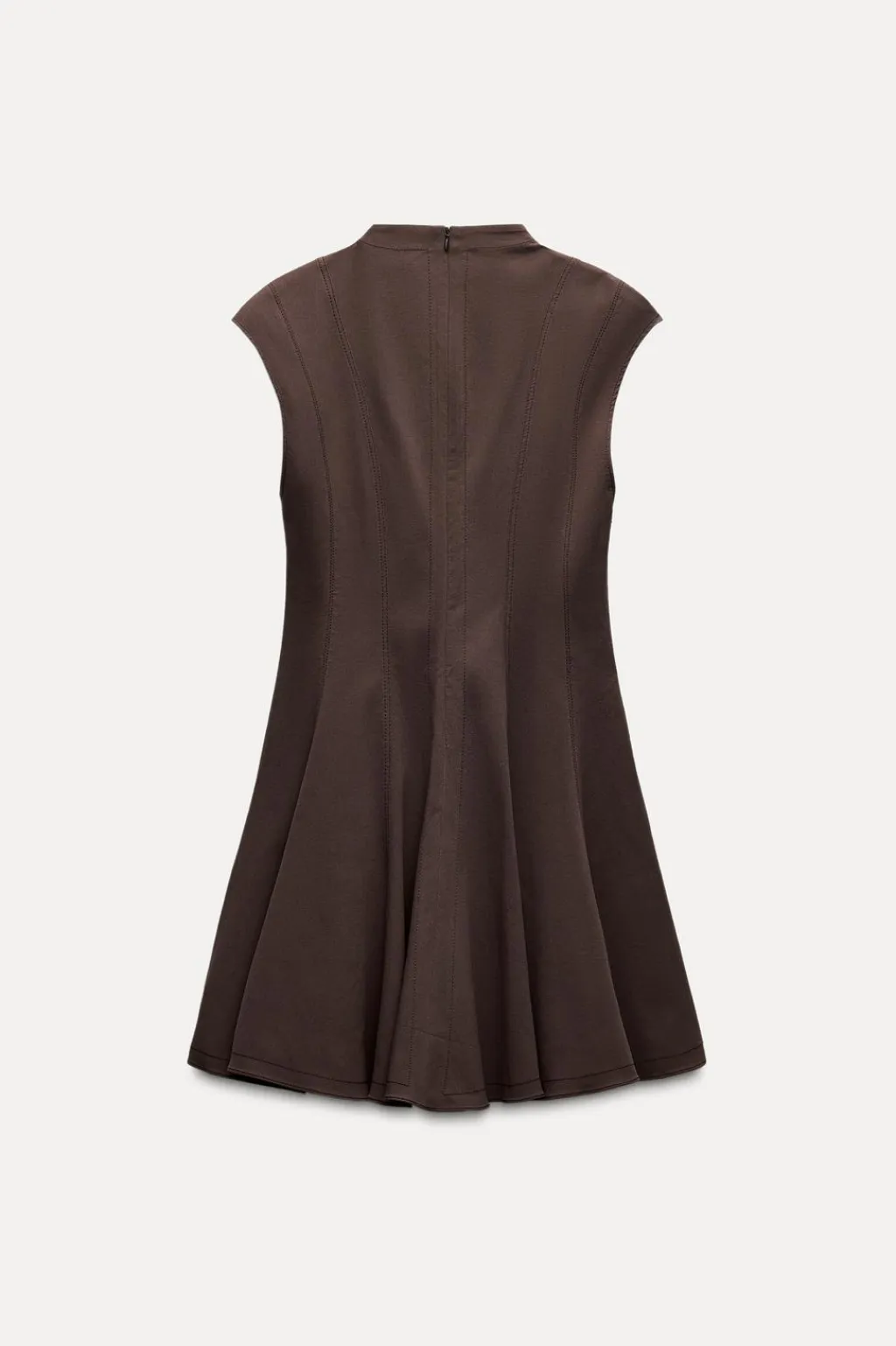 Vestido corto de cuello redondo y manga sisa. Detalle de pespuntes marcados a tono. Bajo acabado en godets. Cierre en espalda con cremallera oculta en costura.