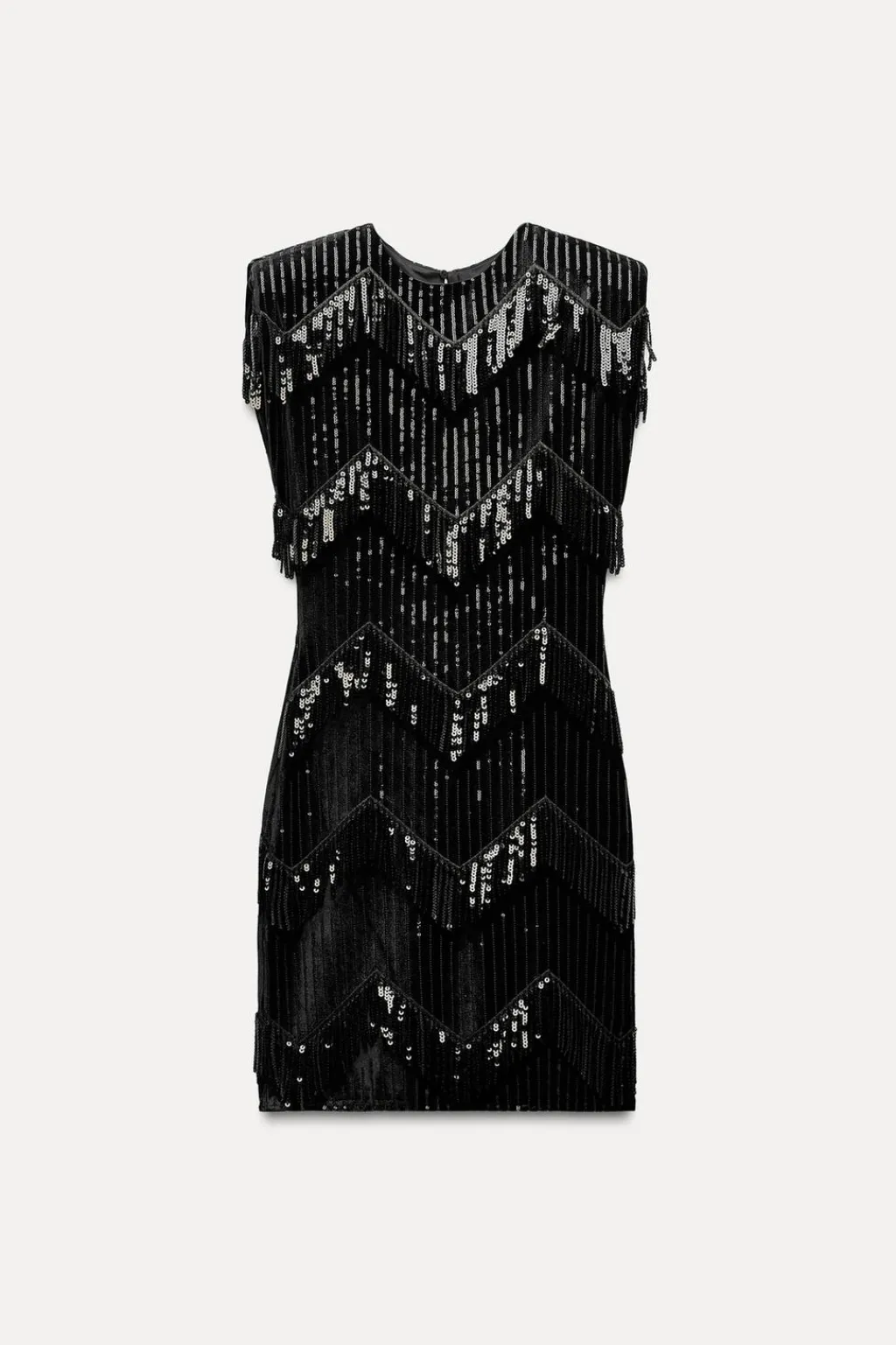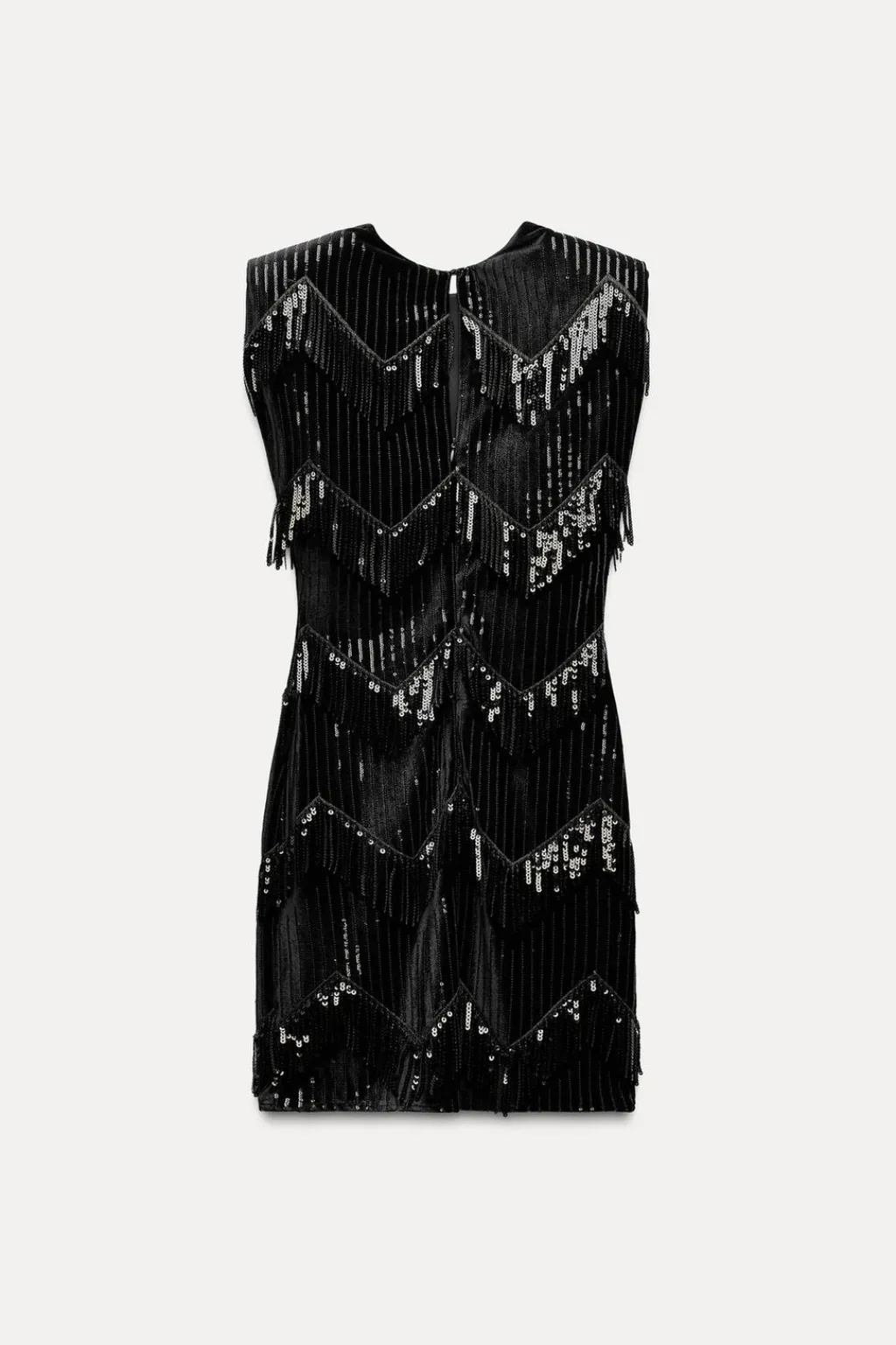 Vestido mini de terciopelo con aplicación de flecos y lentejuelas. Cuello redondo y manga sisa con hombreras. Forro interior. Cierre en espalda con abertura y botón.