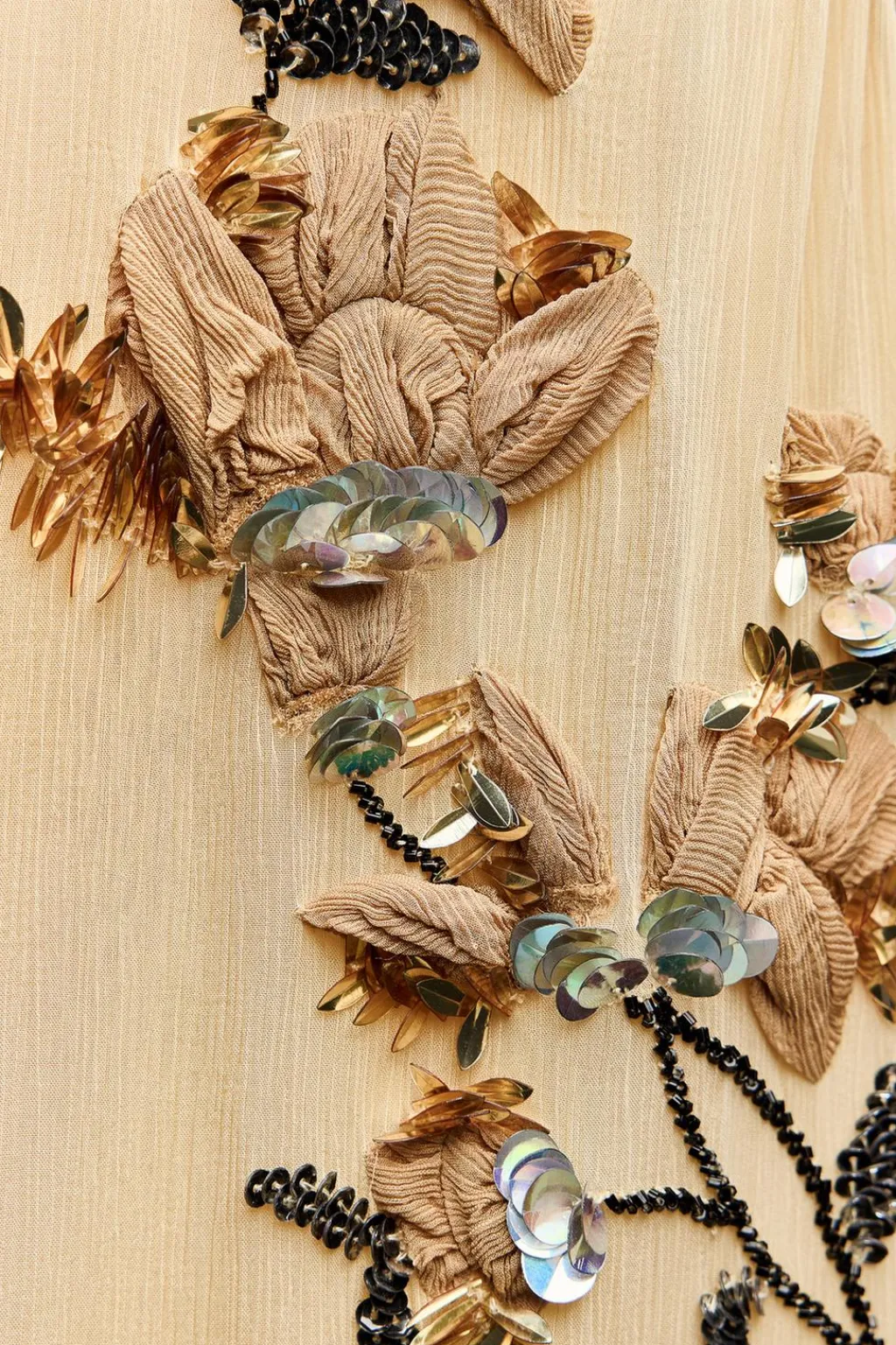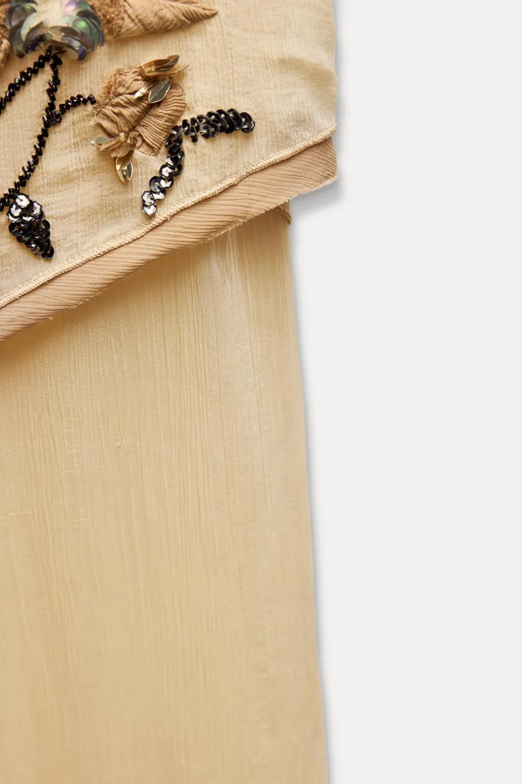 Vestido midi de escote redondo y tirantes. Acabados combinado contraste. Detalle de flores bordadas con aplicación de abalorios.