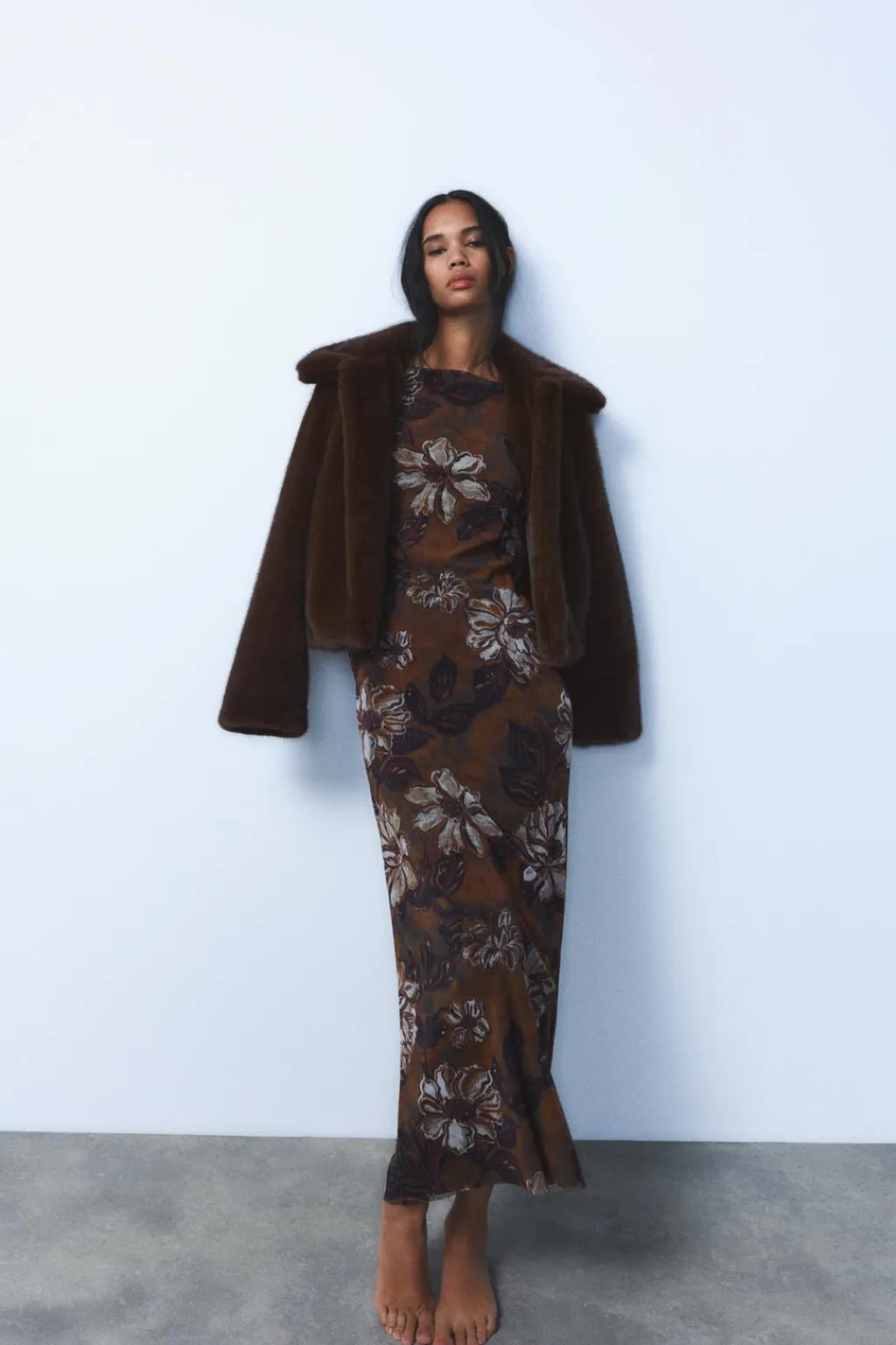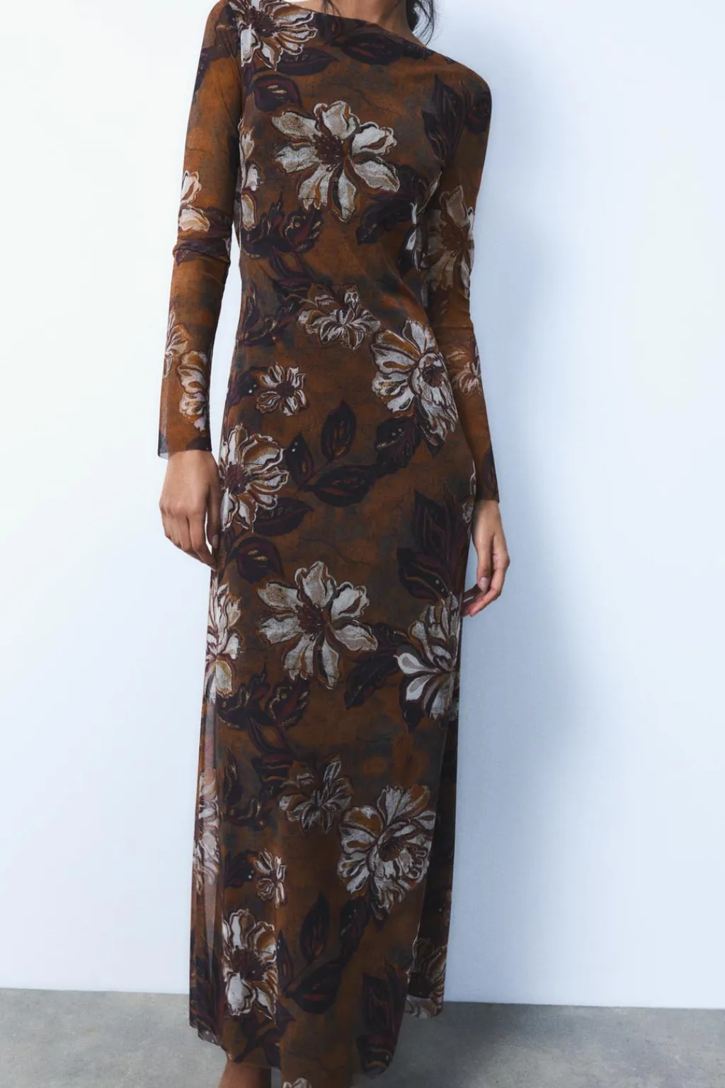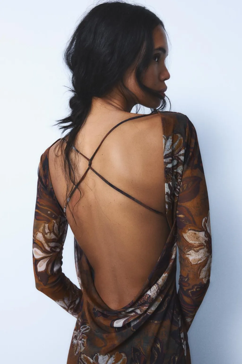 Vestido largo de cuello barco y manga larga. Espalda descubierta con tiras cruzadas. Forro interior combinado.