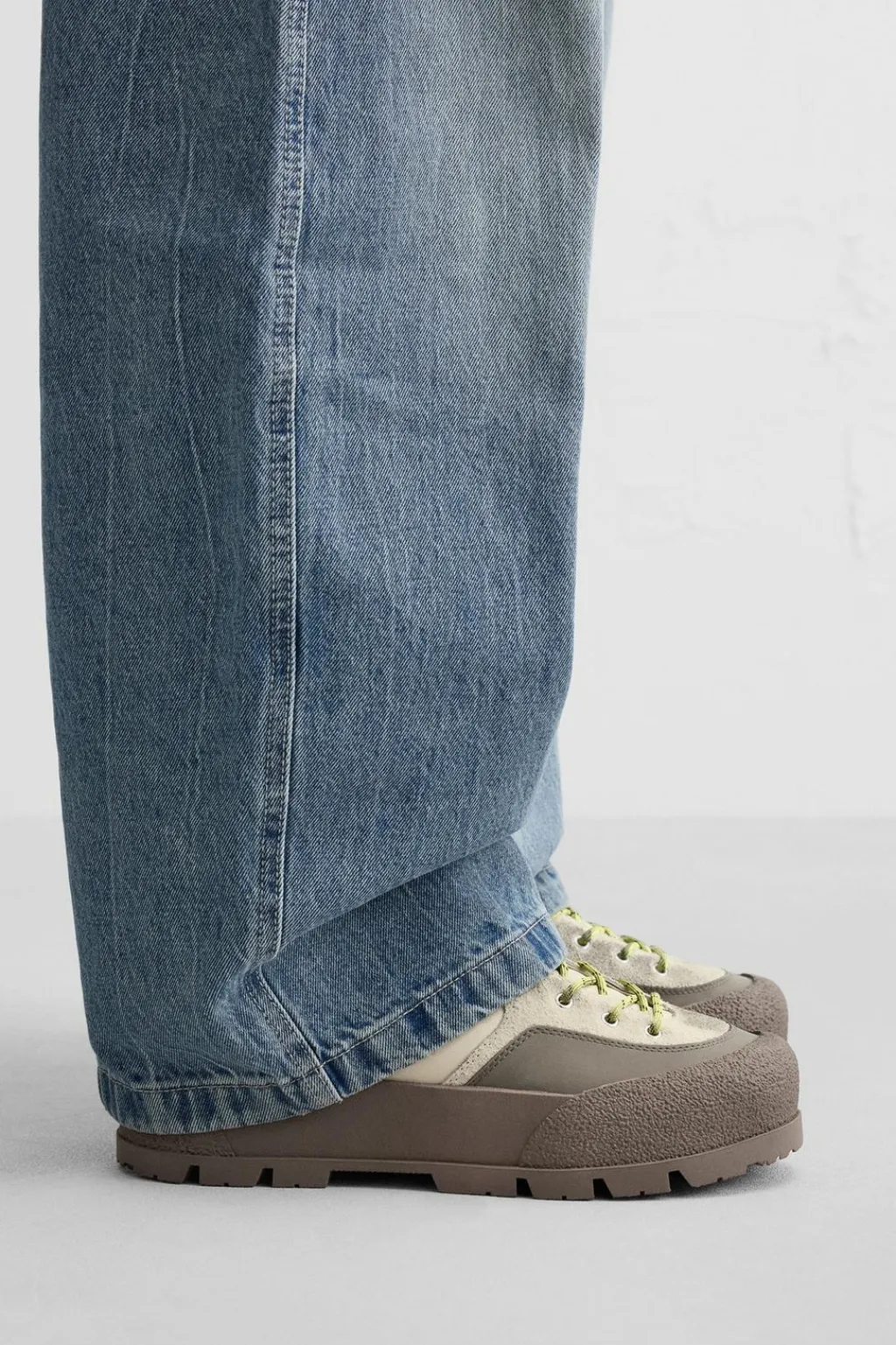 Zapatilla botín. Combinación de piezas de piel con otros materiales en el corte. Cordonera con diez pasados. Suela con volumen. Diseño de inspiración trekking.