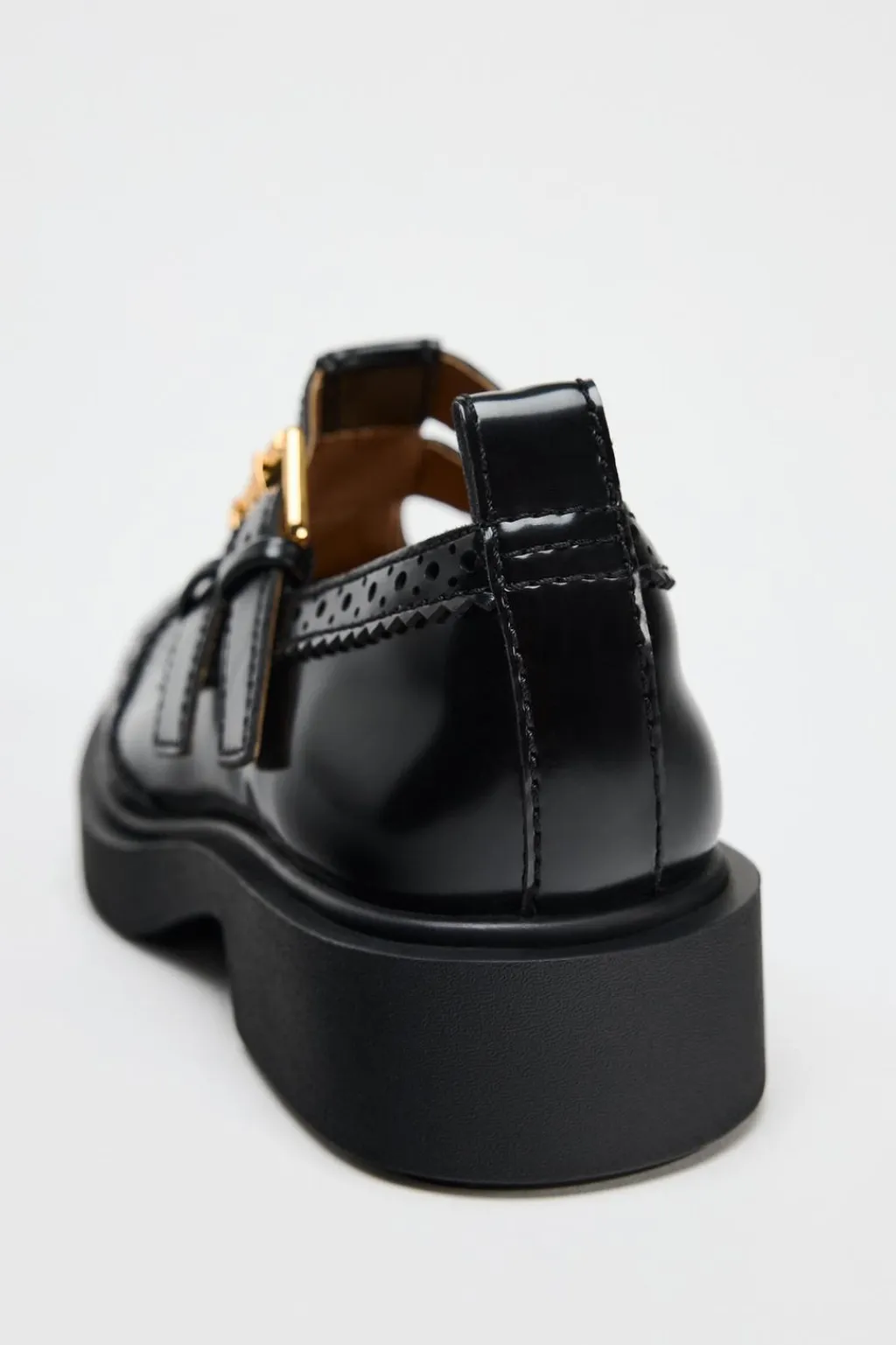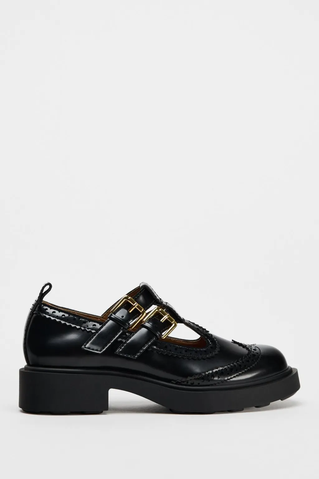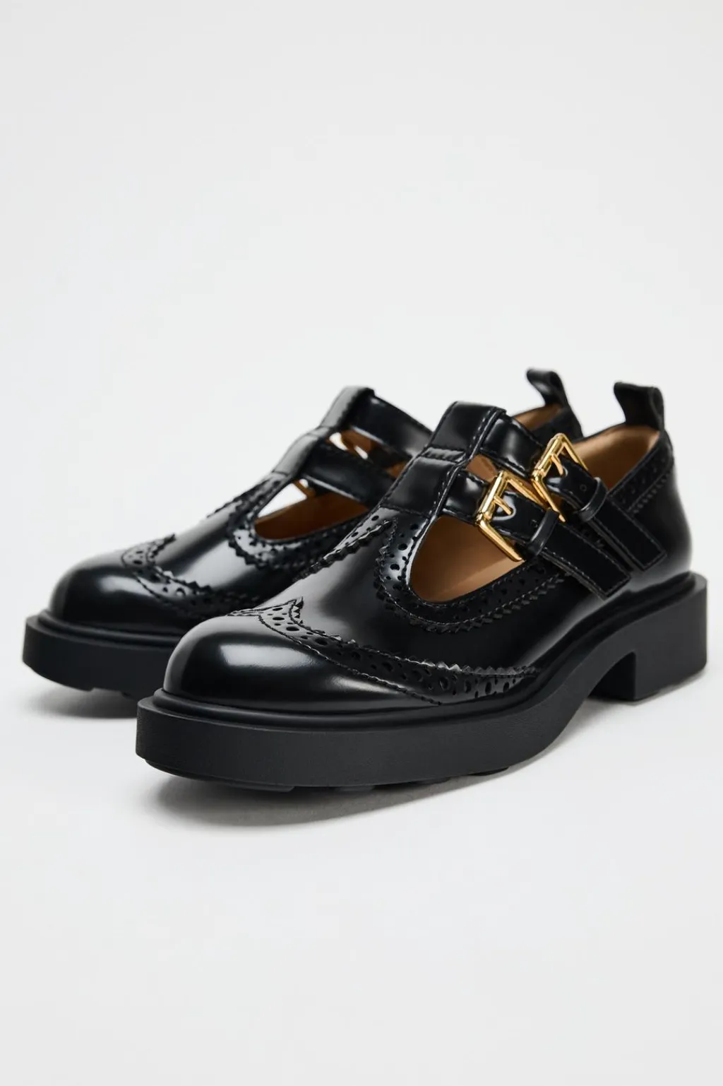 Zapato tipo plano. Detalles en picado en el cuerpo. Doble tira con hebilla en la parte delantera. Tirador trasero. Acabado en punta redonda.