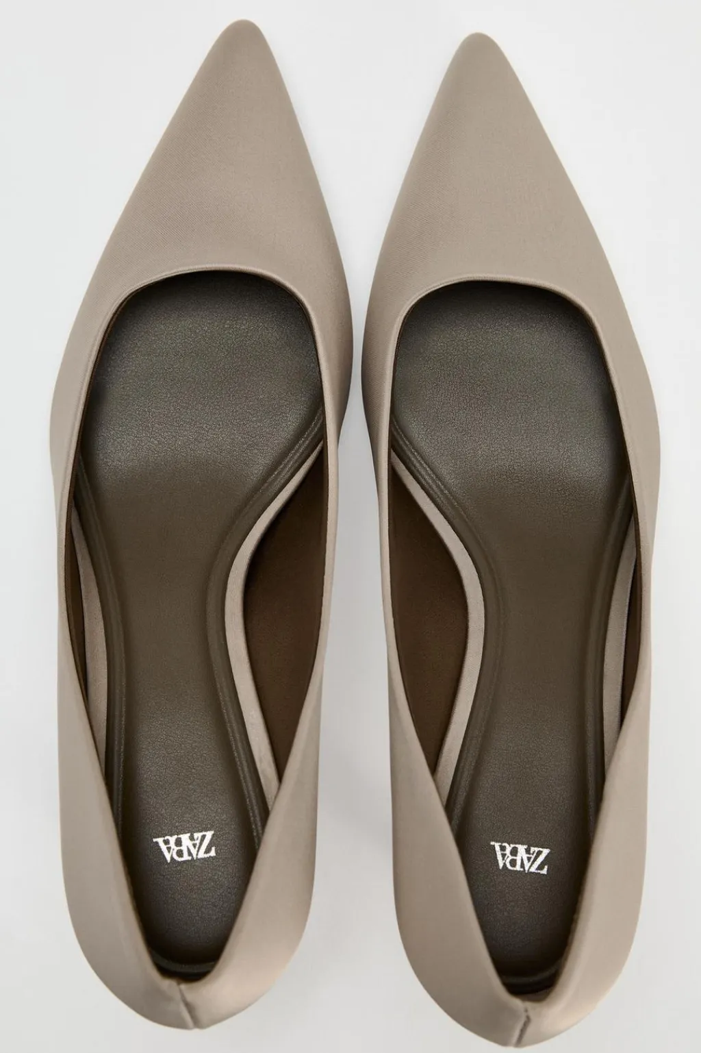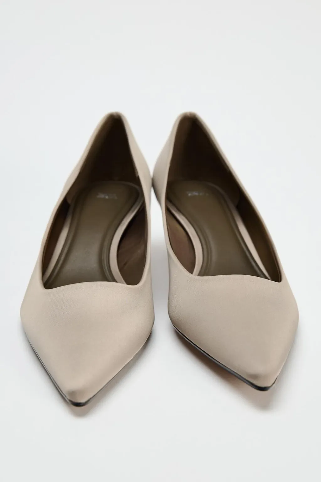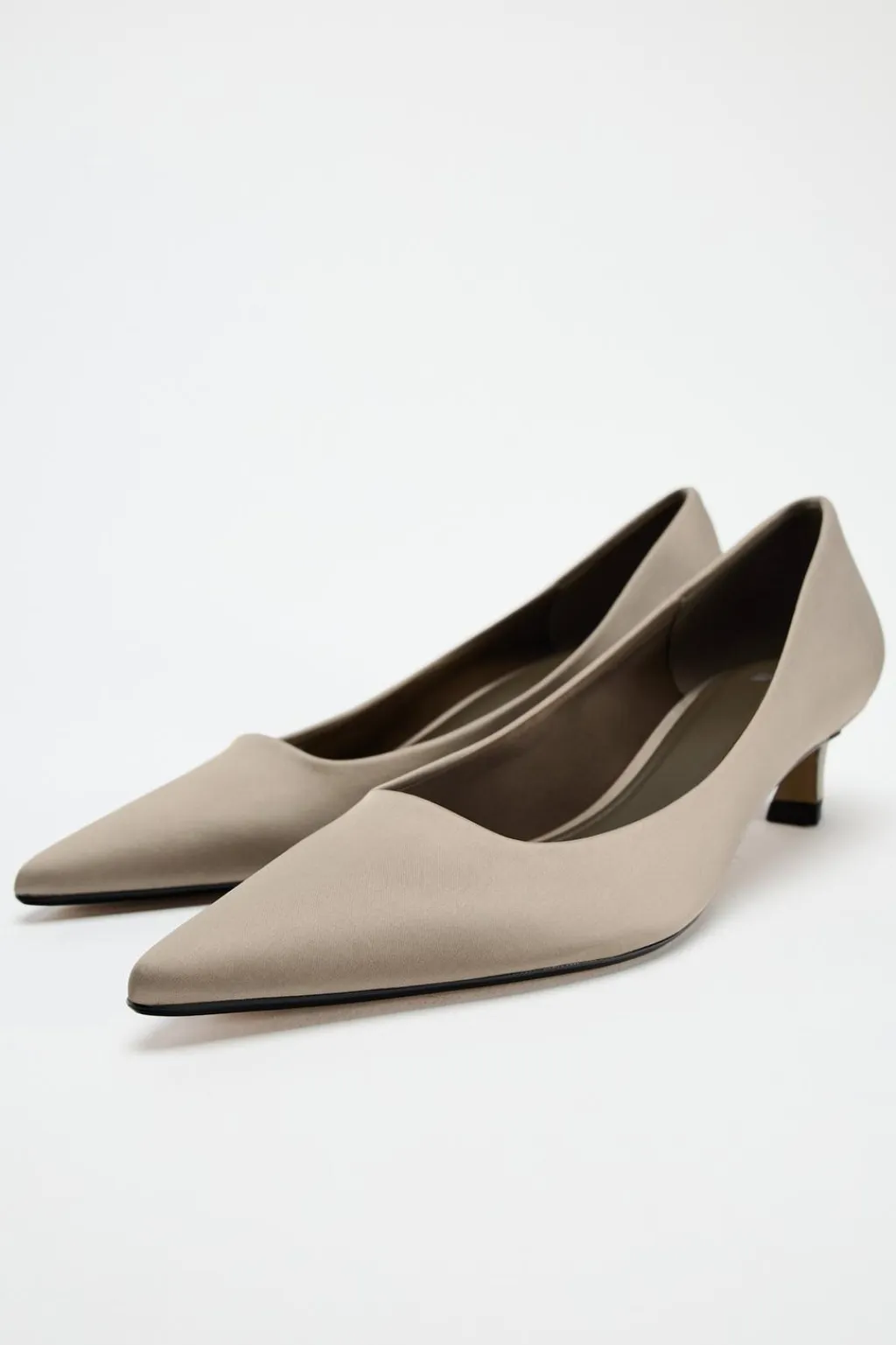 Zapato de tacón kitten curvado. Tejido efecto satinado. Acabado en punta.