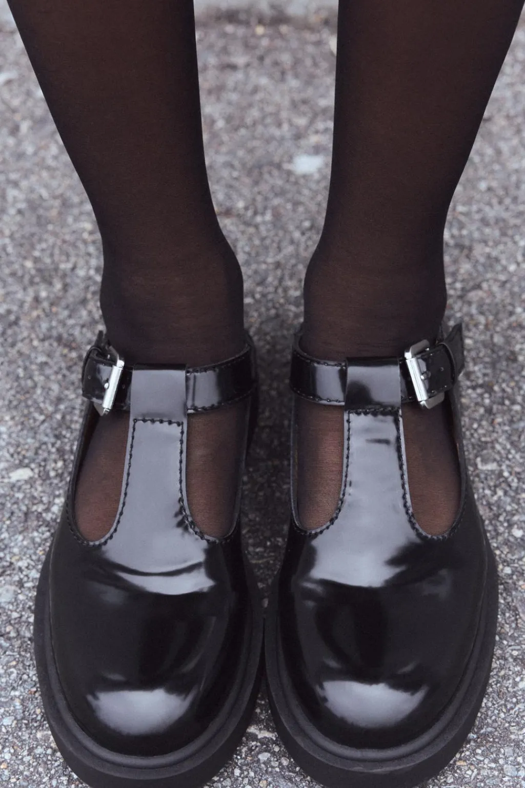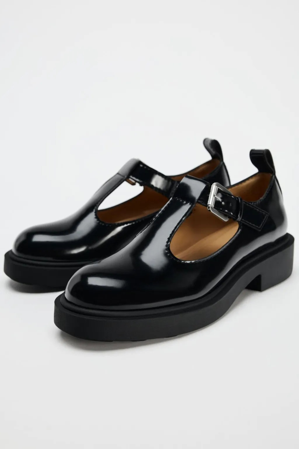 Zapato plano con detalle de tira en la parte delantera. Cierre mediante hebilla en la pulsera del tobillo. Detalle de tirador trasero.