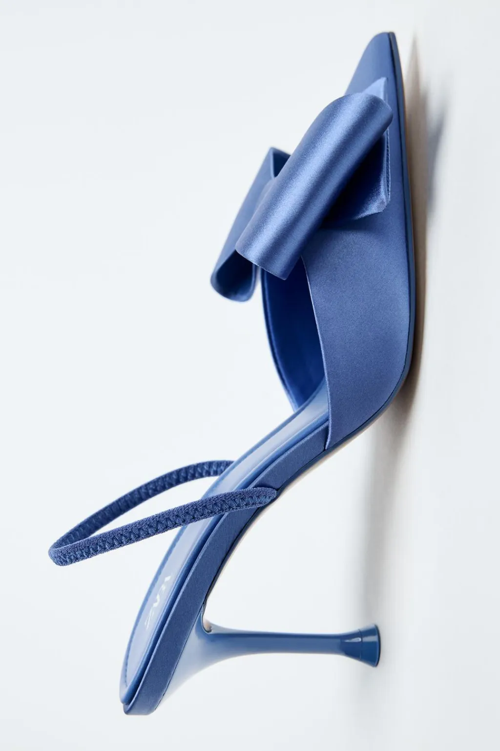 Zapato destalonado de tacón alto y fino con efecto satinado. Detalle de lazo en la parte delantera. Tira trasera con pieza elástica.