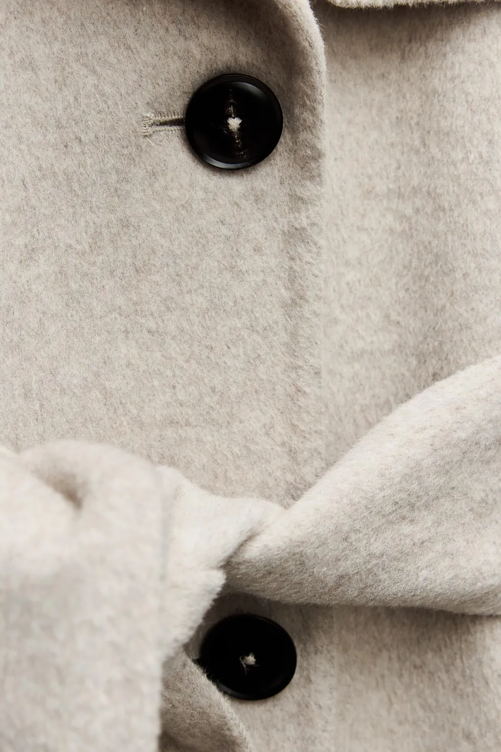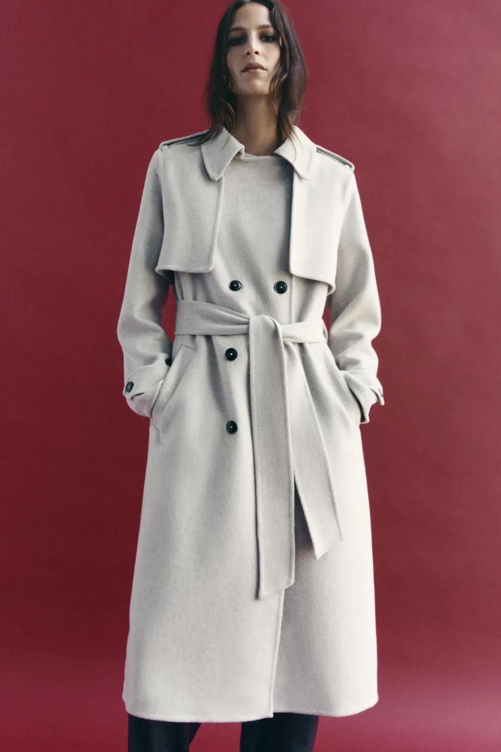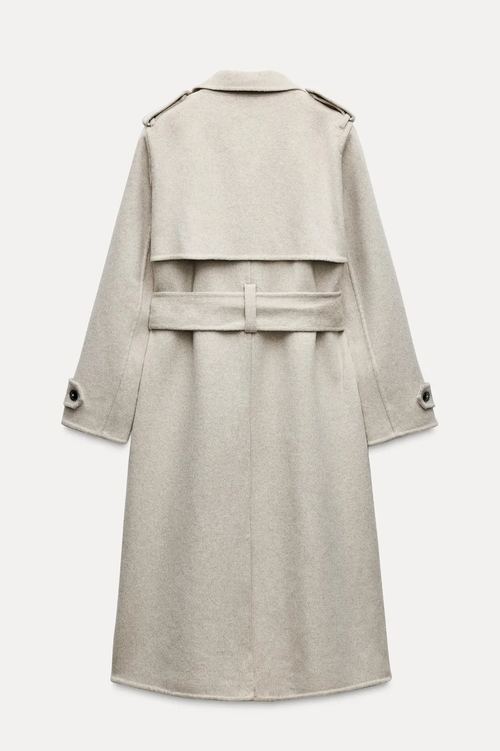 Abrigo confeccionado en hilatura con lana. Cuello solapa y manga larga con trabillas y botón. Bolsillos en delantero. Detalle de trabillas en hombros. Cinturón en mismo tejido ajustable con lazadas. Cierre frontal cruzado con botones.