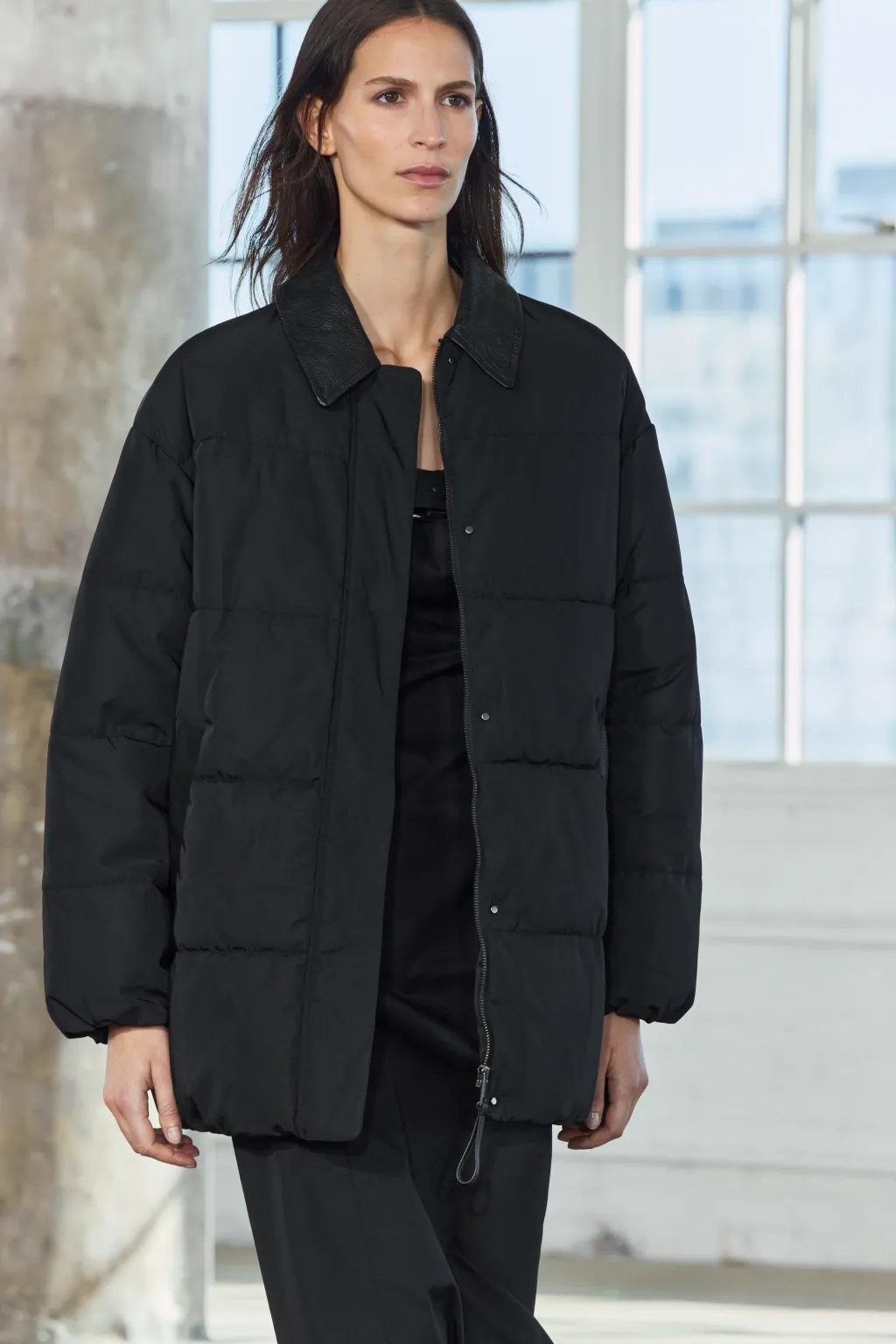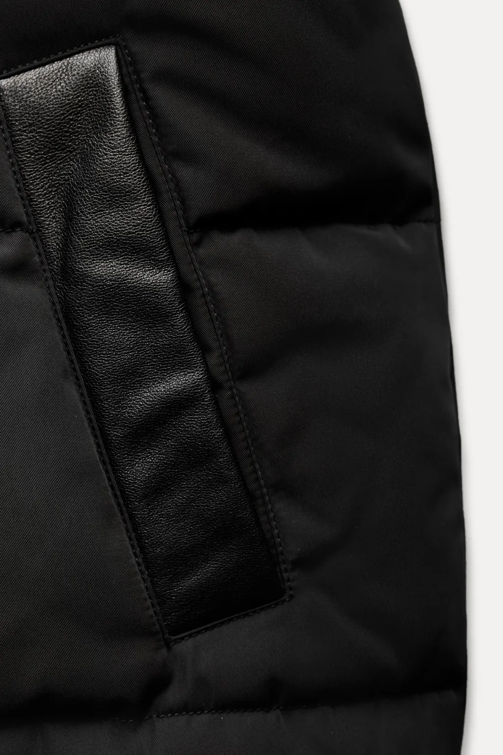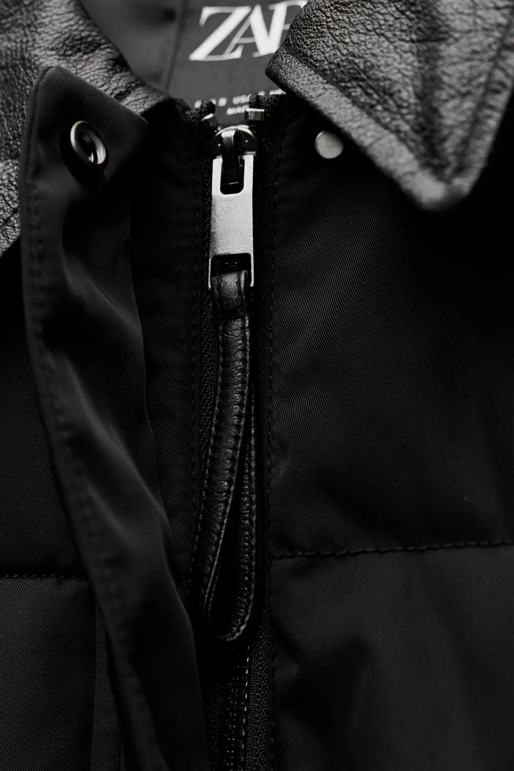 Anorak con cuello solapa y manga larga. Bolsillos en delantero. Detalle de aplicación de tejido en piel a tono. Cierre frontal con cremallera y botones a presión ocultos por solapa.