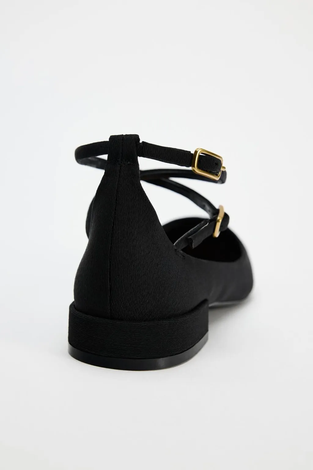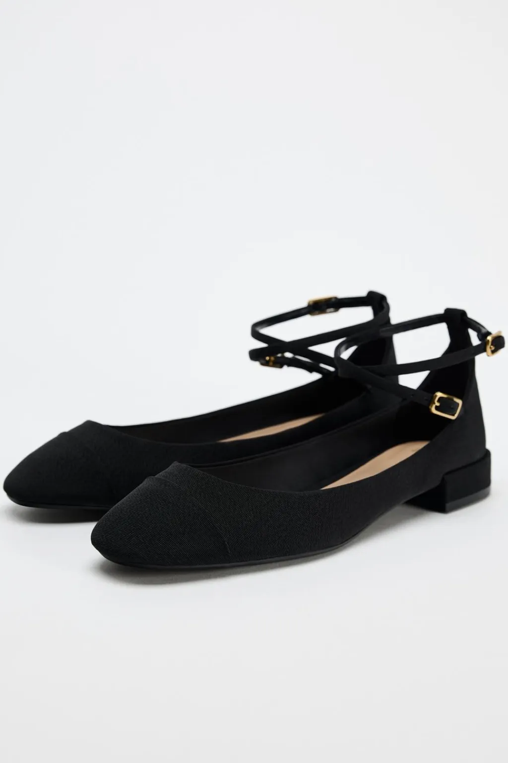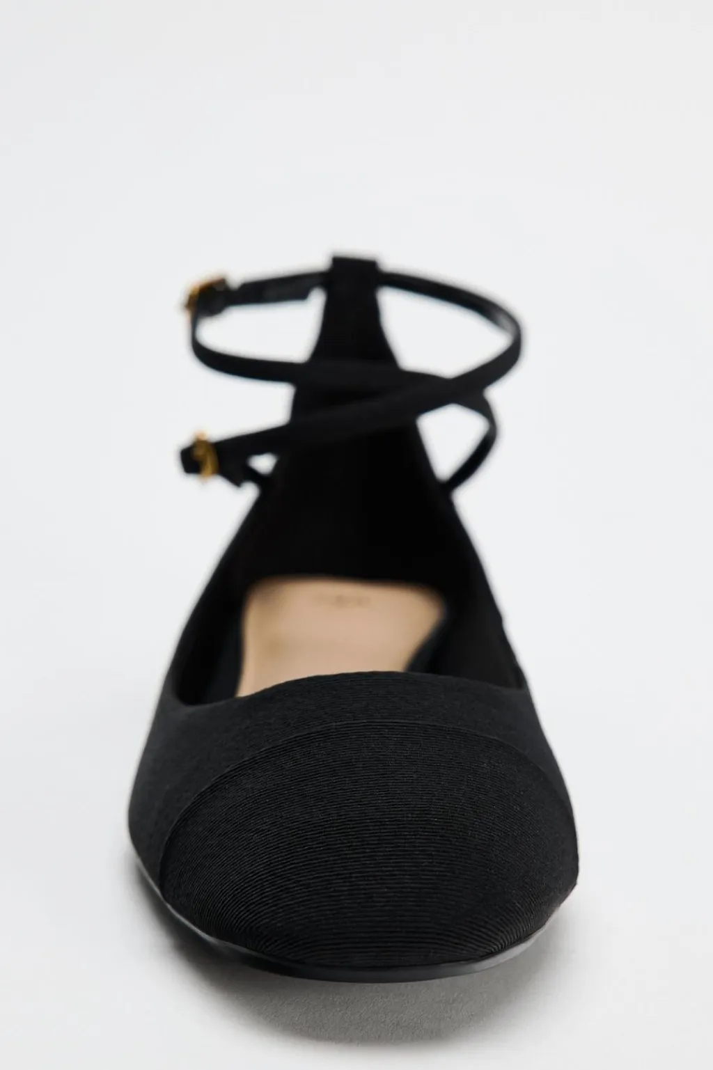Zapato plano tipo bailarina en tejido. Cierre mediante doble tira con hebilla en la pulsera al tobillo.