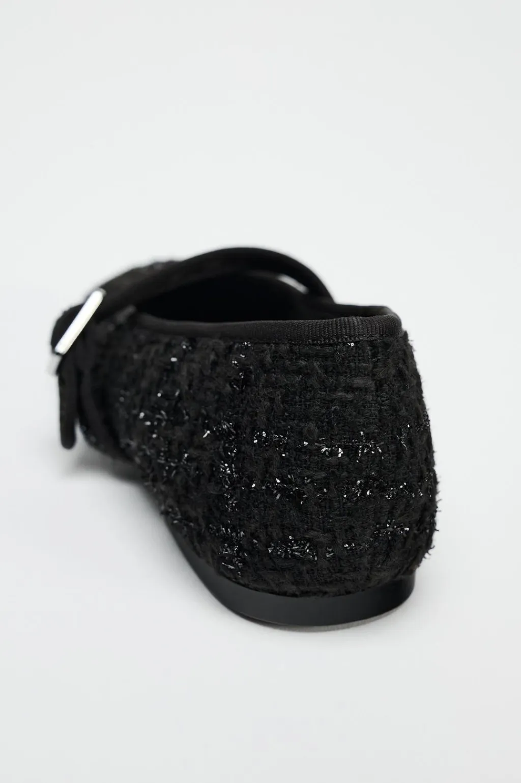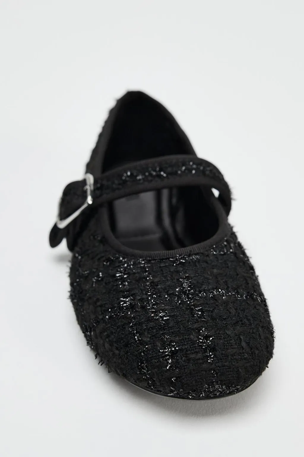 Zapato plano tipo bailarina en tejido con detalles en brillo. Tira con hebilla en la parte delantera. Acabada en punta redonda.
