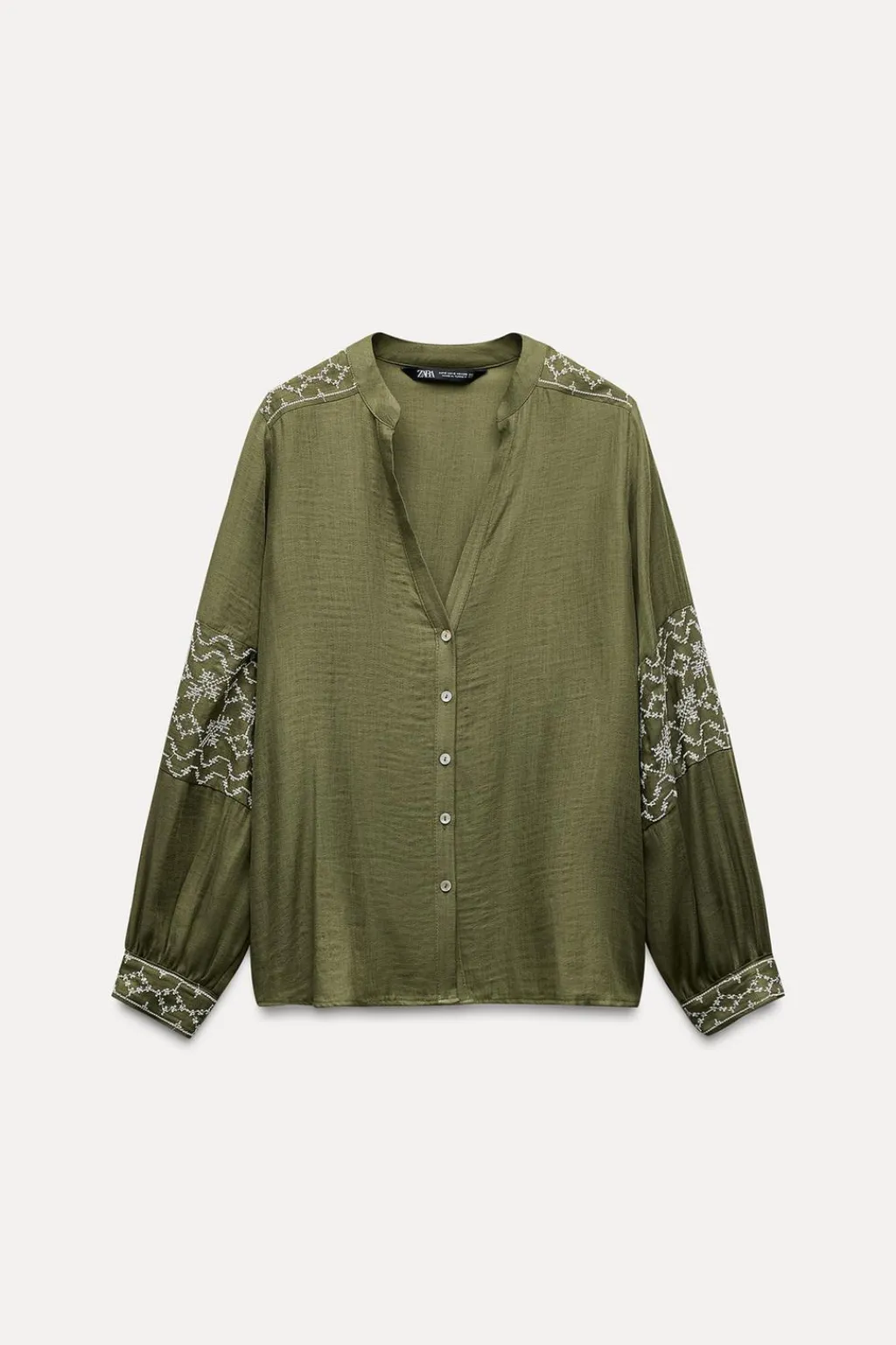 Blusa de cuello redondo con escote pico y manga larga con bordados a contraste. Cierre frontal con botones.