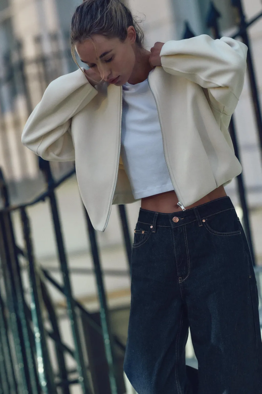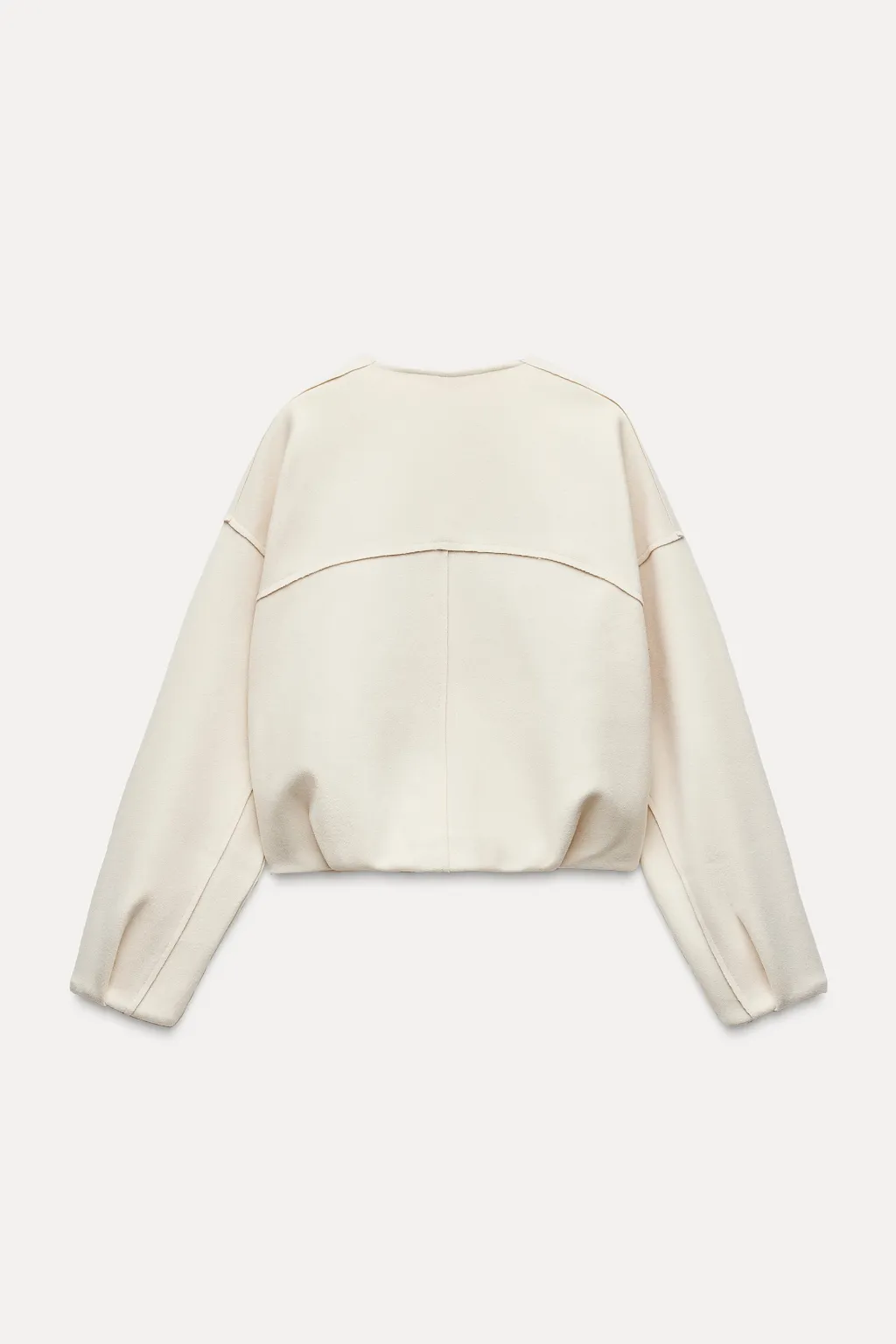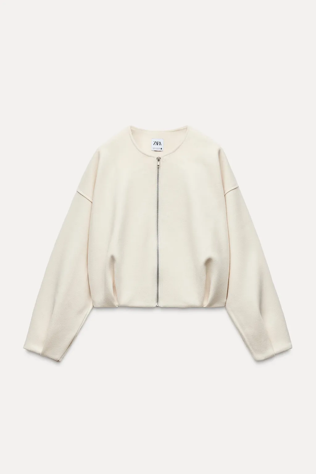 Bomber de cuello redondo y manga larga. Bajo abullonado con pliegues. Cierre frontal con cremallera metálica.