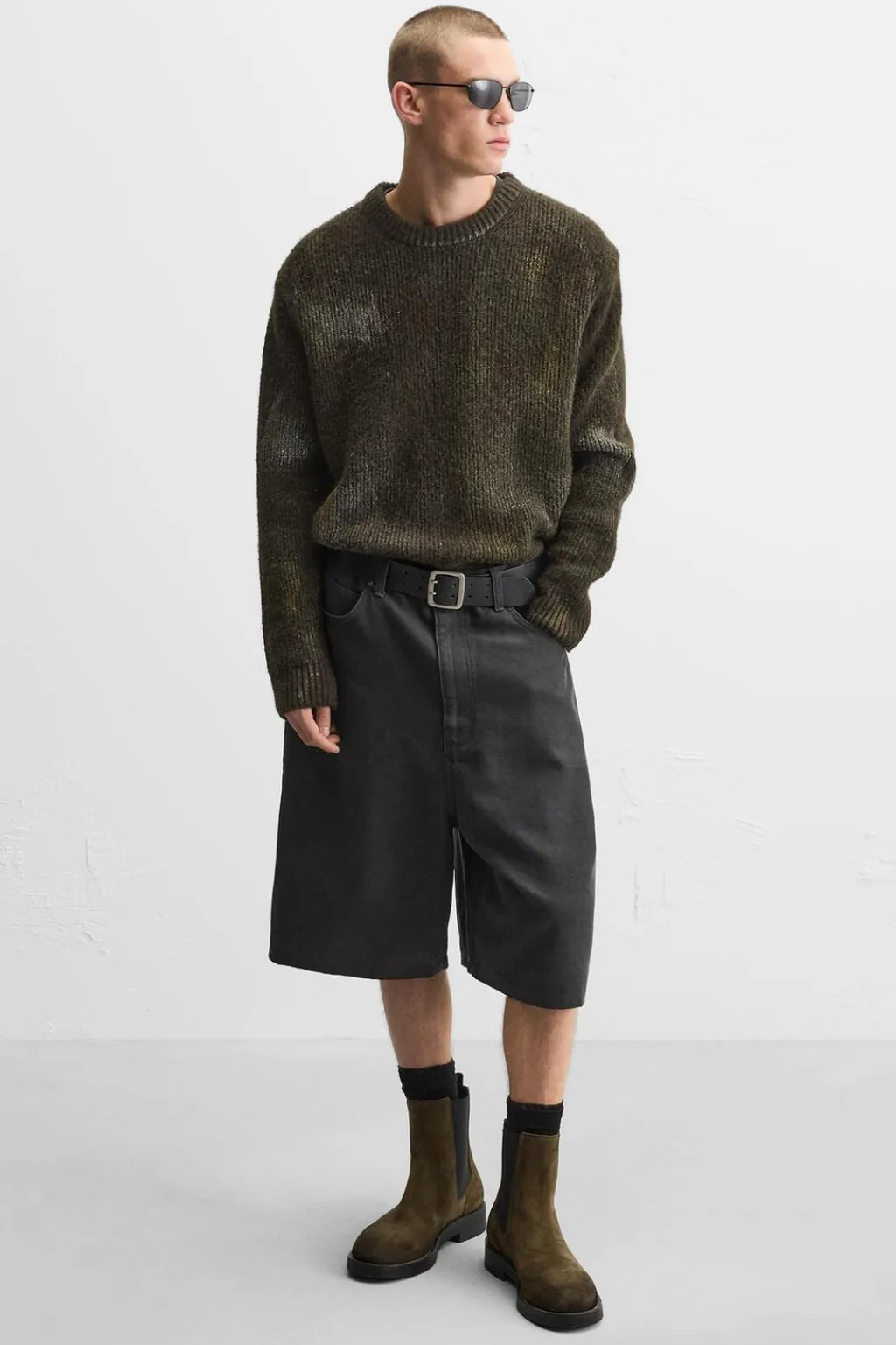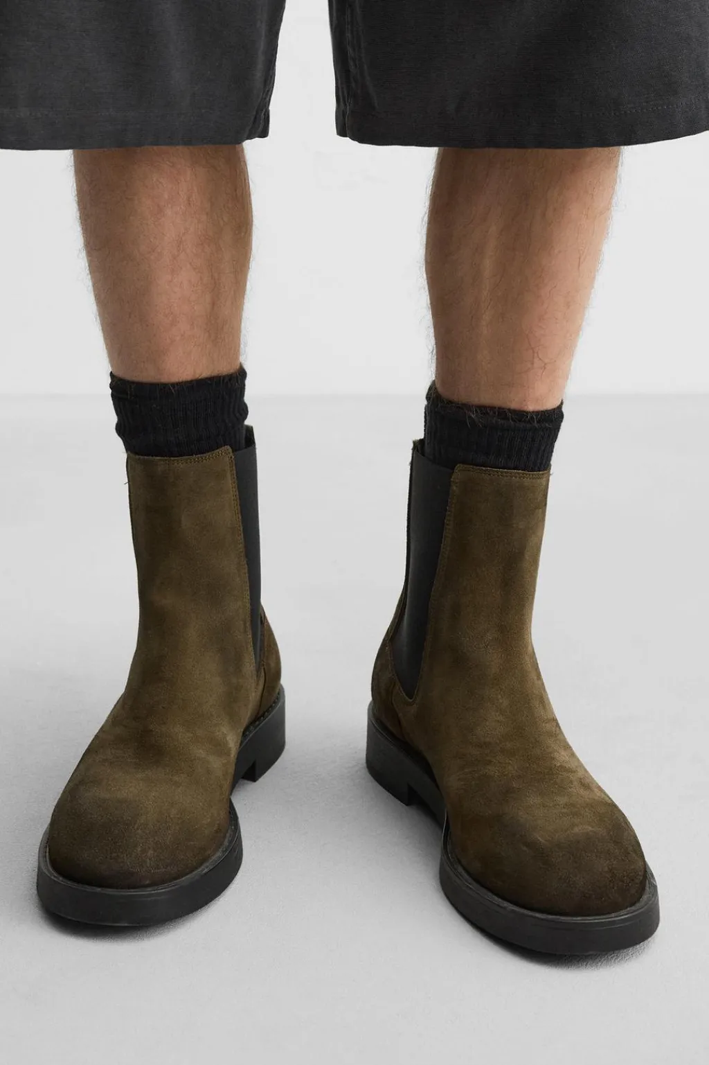 Bota tipo chelsea. Parte superior fabricada en piel con acabado serraje y efecto desgastado. Piezas elásticas laterales y tirador trasero para facilitar el calce. Horma redonda.