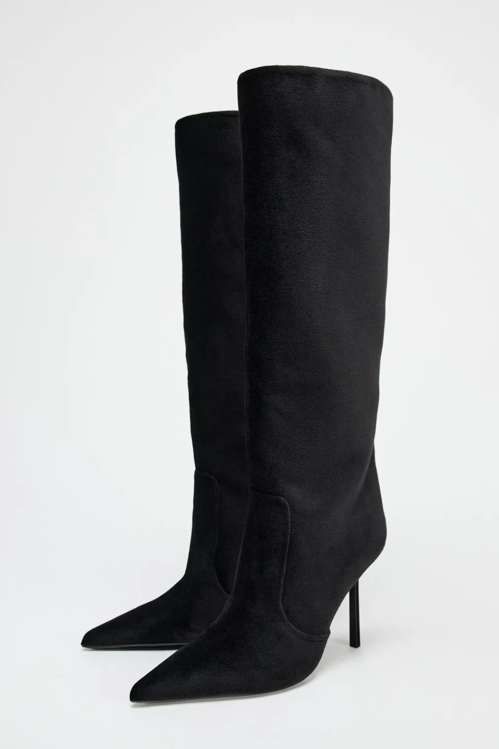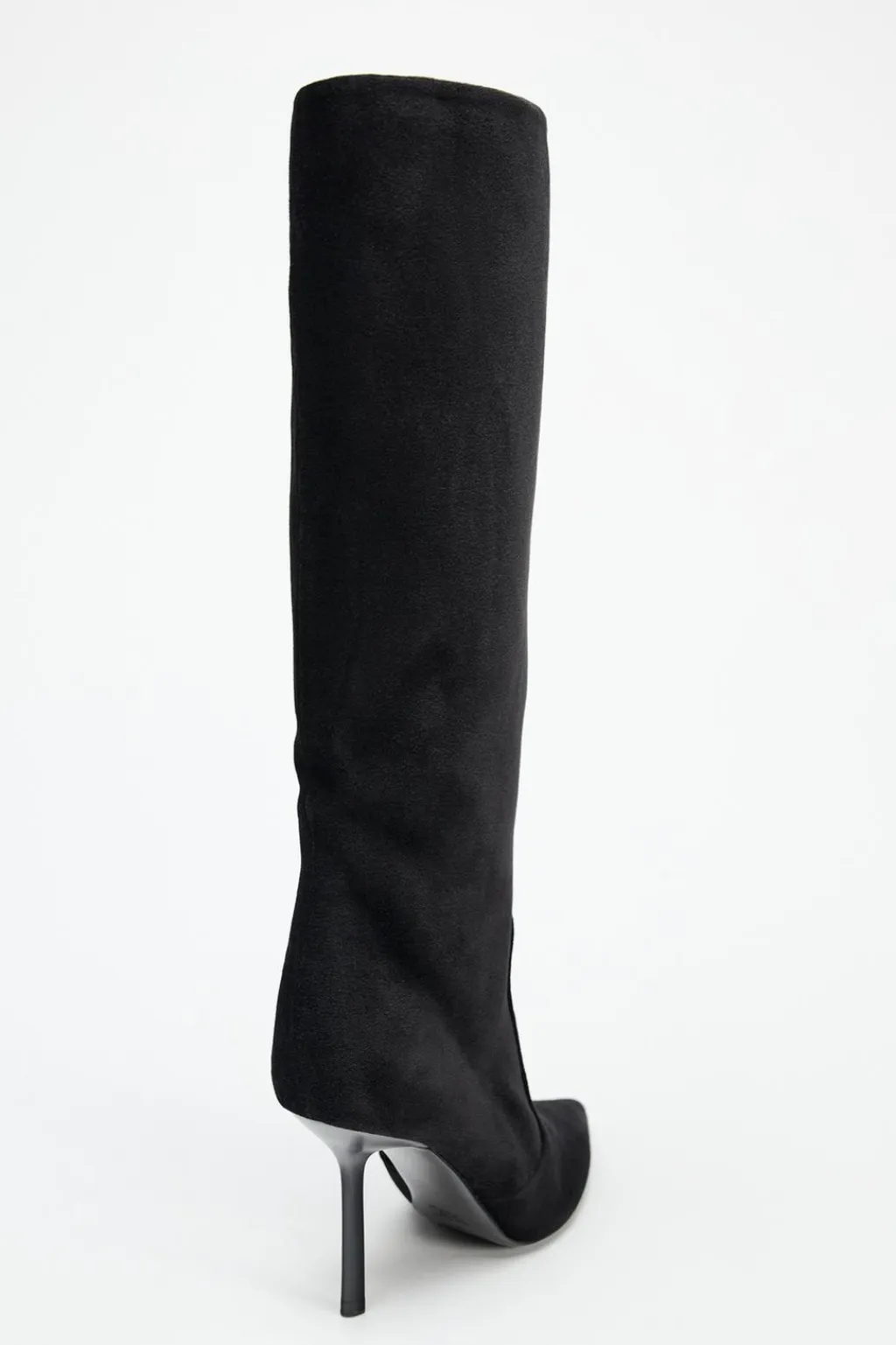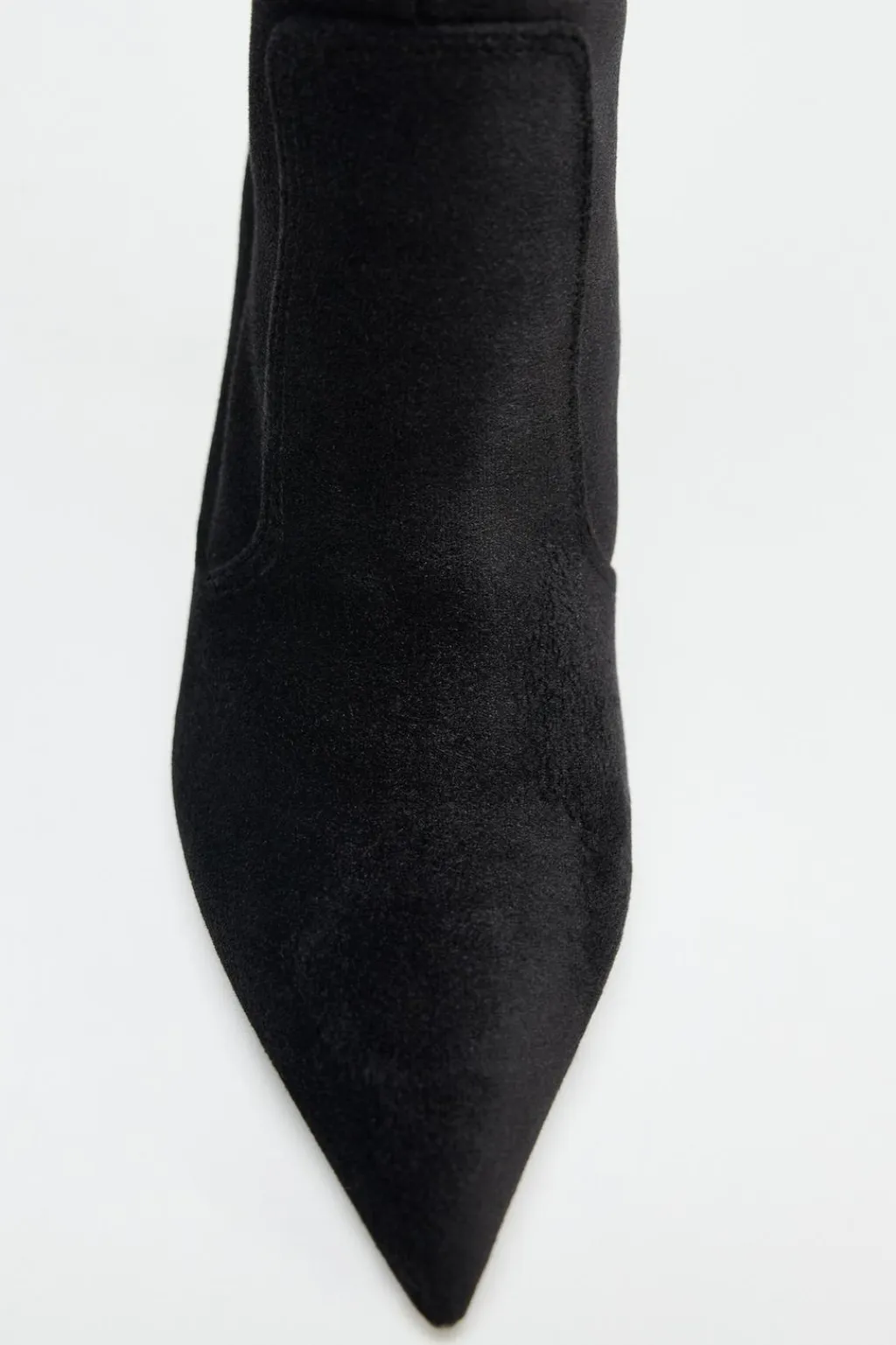 Zapato tipo bota con tacón fino. Efecto terciopelo en el cuerpo. Caña alta. Acabado en punta.