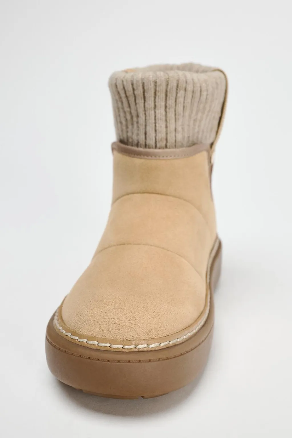 Zapato tipo botín con calcetín en la caña. Detalle de pespunte en contraste en el corte. Tiradores laterales con aplique metálico. Acabado en punta redonda.