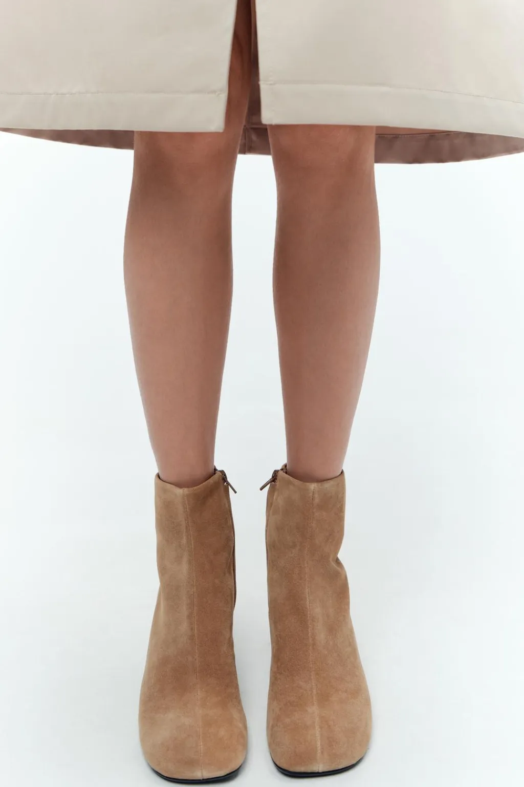 Zapato tipo botín en piel. Tacón fino. Acabado en punta redonda. Cierre mediante cremallera.