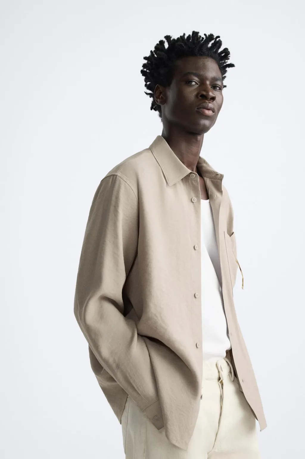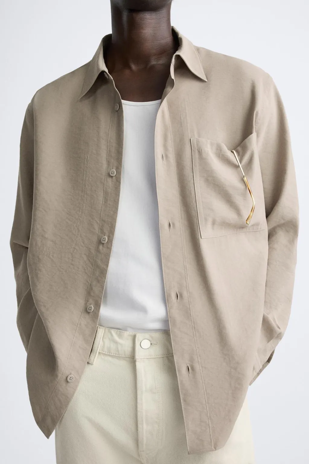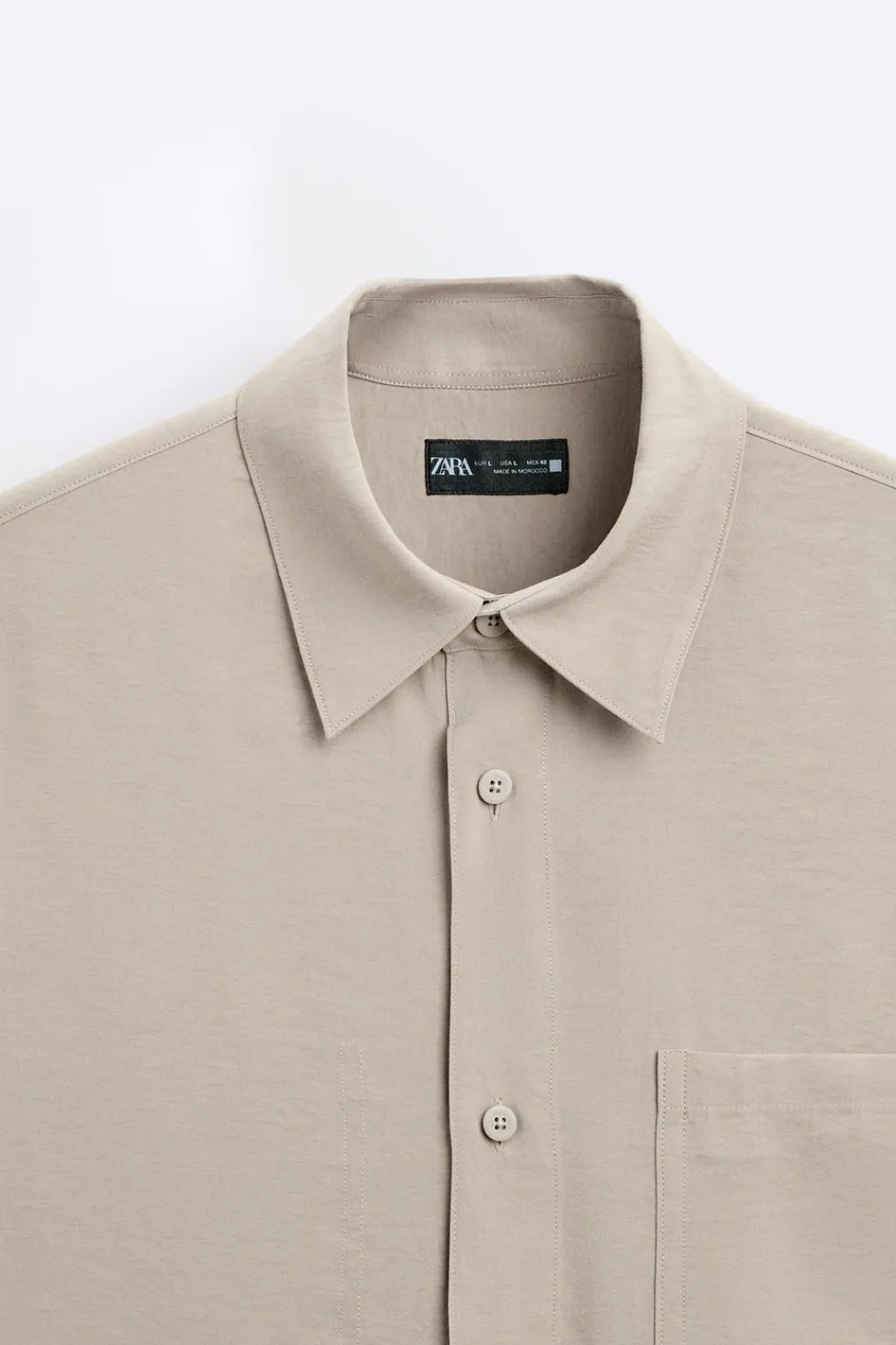 Camisa relaxed fit confeccionada en tejido ligero con mezcla de modal. Cuello solapa y manga larga acabada en puño con botón. Cierre frontal de botonadura.