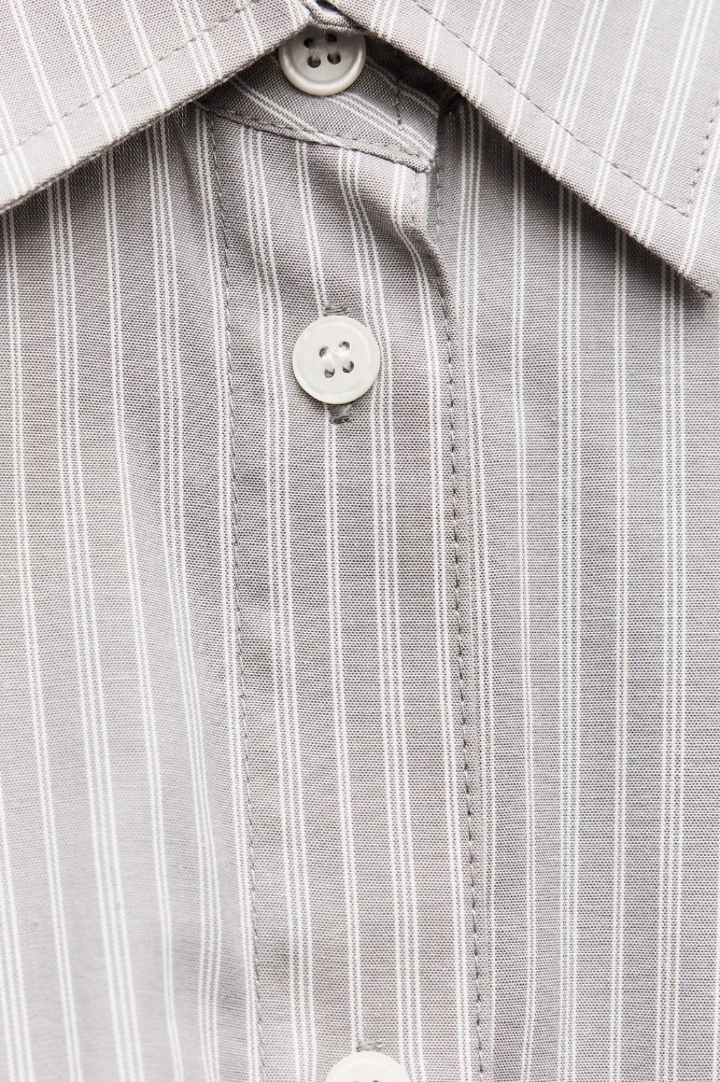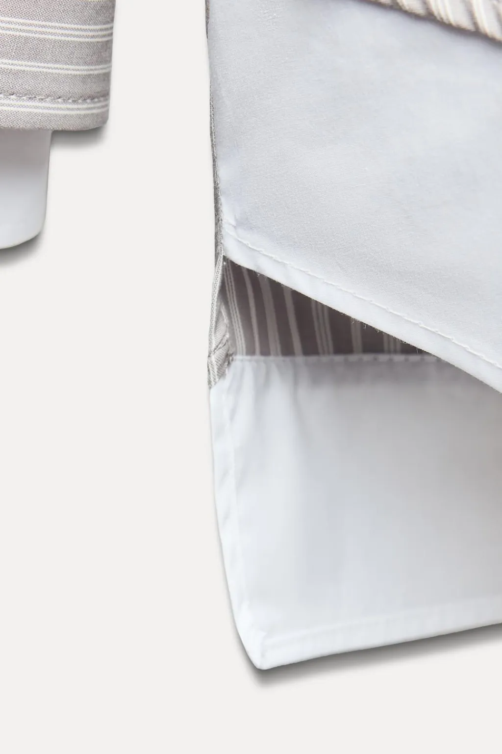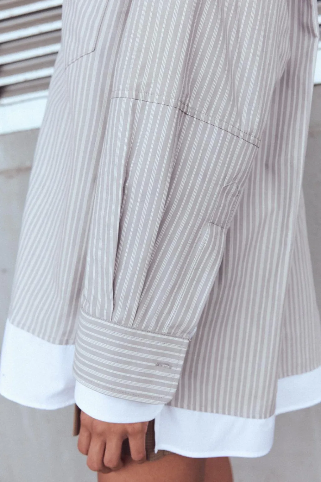 Camisa de cuello solapa. Manga larga con hombro caído acabada en puño doble combinado a contraste. Bolsillo de plastrón en pecho. Detalle de pinza y trabilla en espalda. Bajo acabado asimétrico y combinado. Cierre frontal con botones.