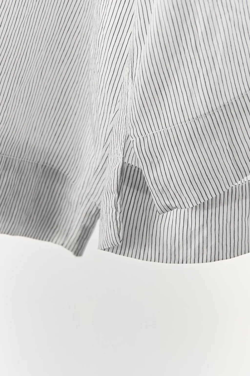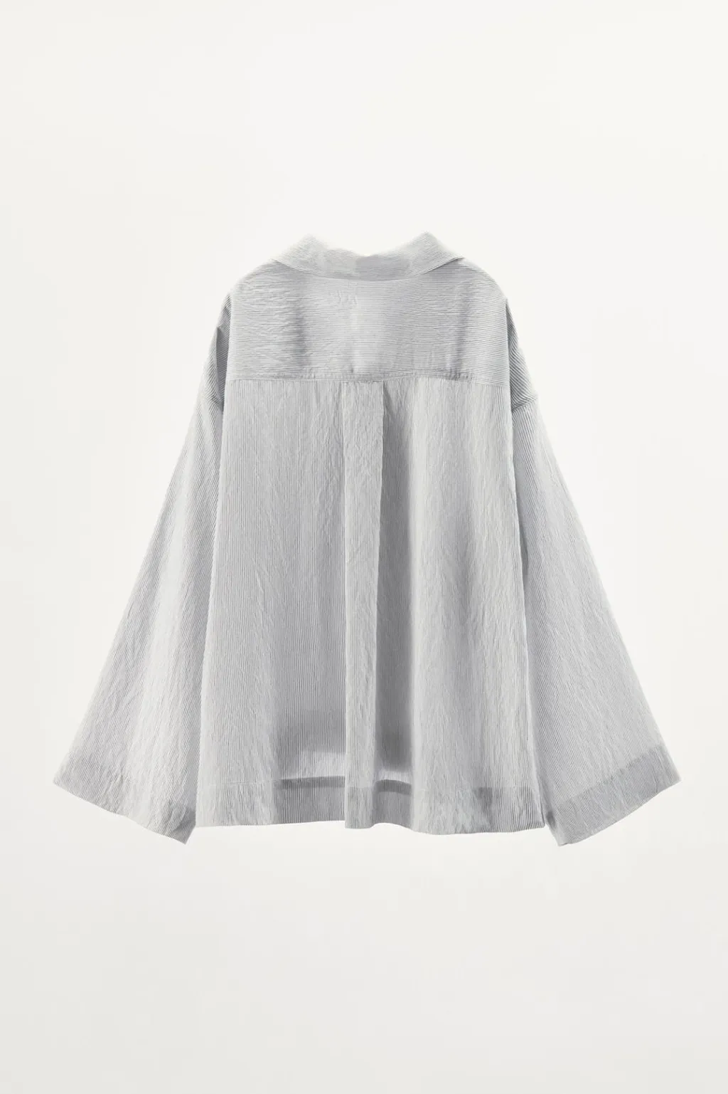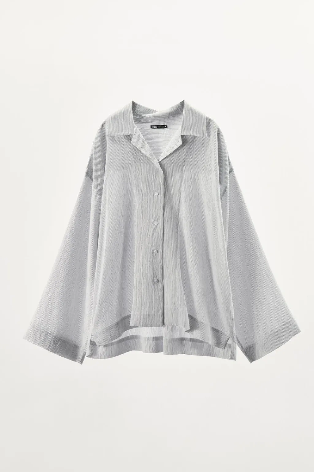 Camisa de corte amplio confeccionada en mezcla de viscosa y 16% poliamida. Cuello solapa y manga larga amplia acabada en puño. Bajo asimétrico. Cierre frontal con botones.