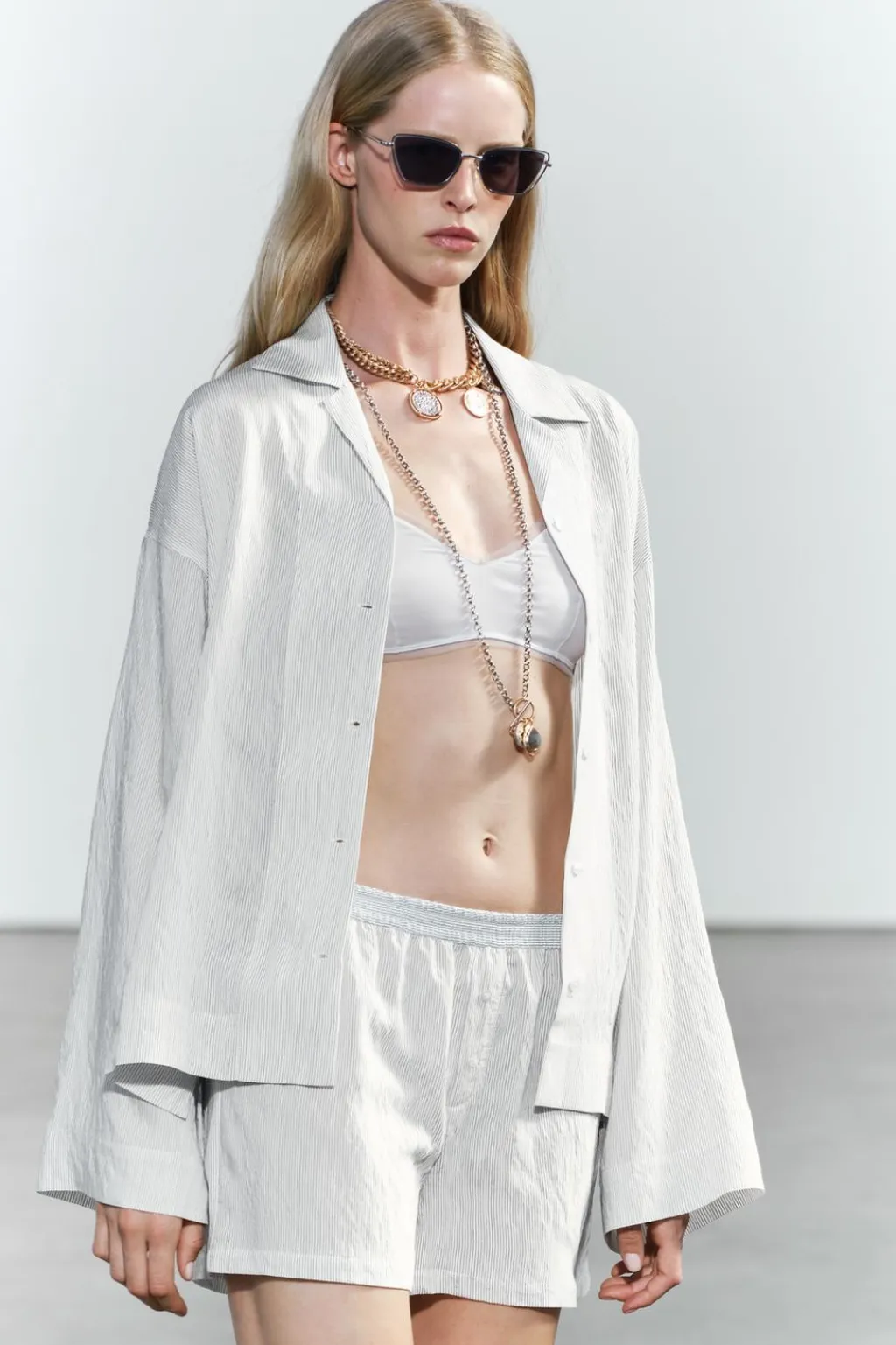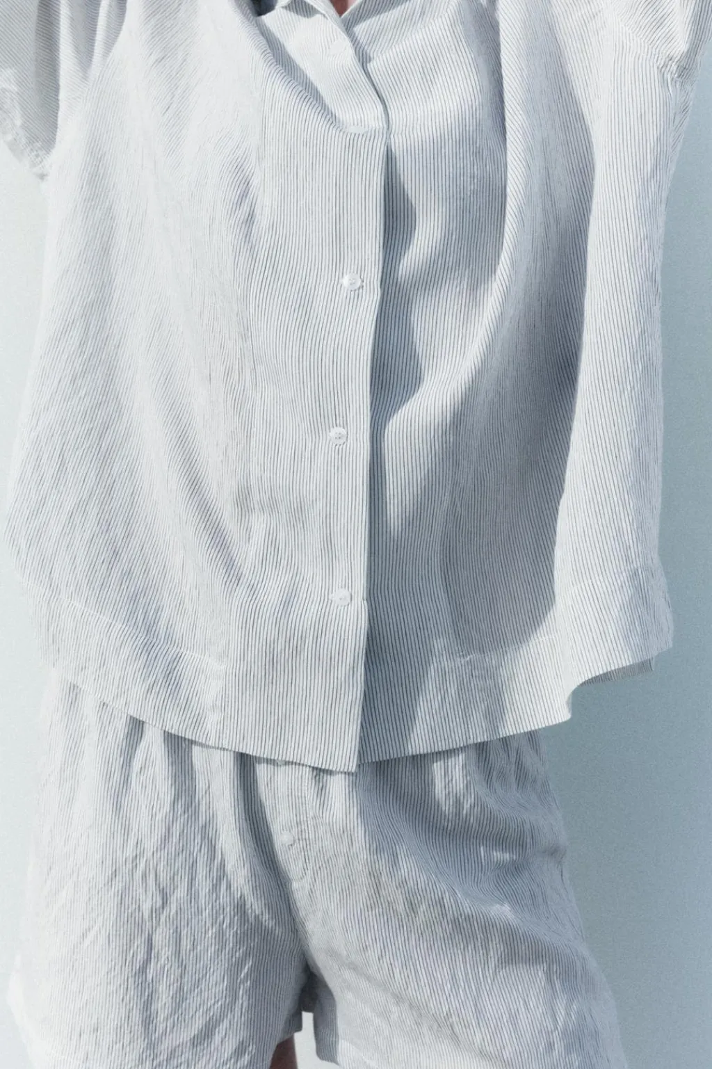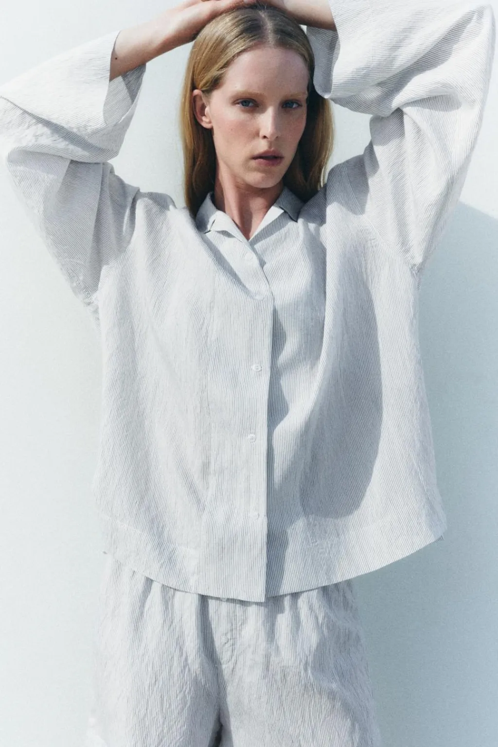 Camisa de corte amplio confeccionada en mezcla de viscosa y 16% poliamida. Cuello solapa y manga larga amplia acabada en puño. Bajo asimétrico. Cierre frontal con botones.