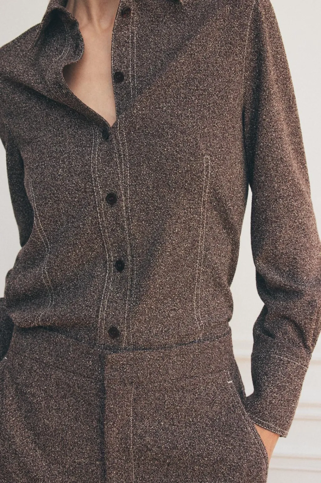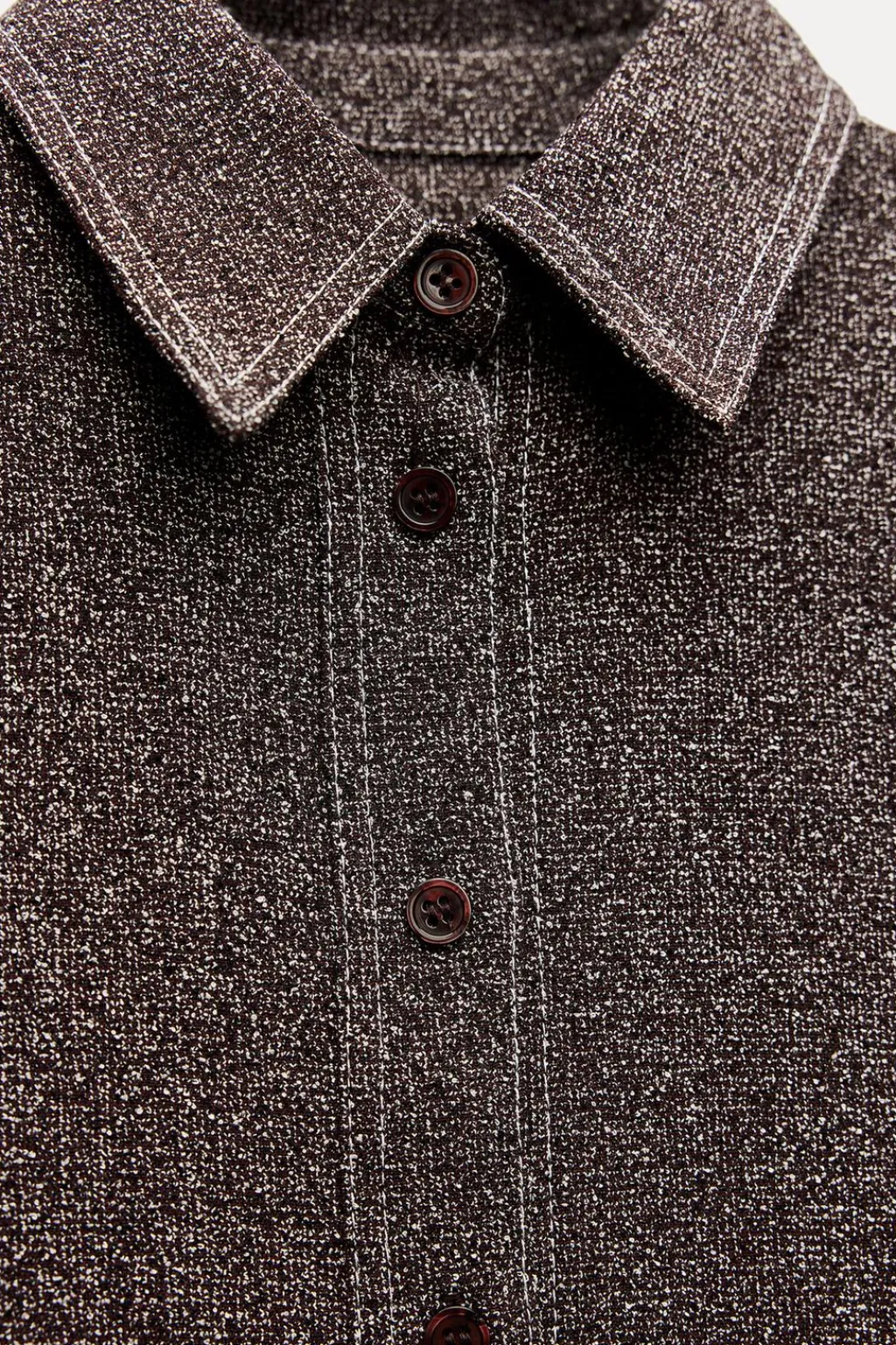 Camisa confeccionada en hilatura con viscosa 30%. Cuello solapa y manga larga acabada en puño y botones. Detalle de pespuntes marcados combinados a contraste. Cierre frontal con botones.