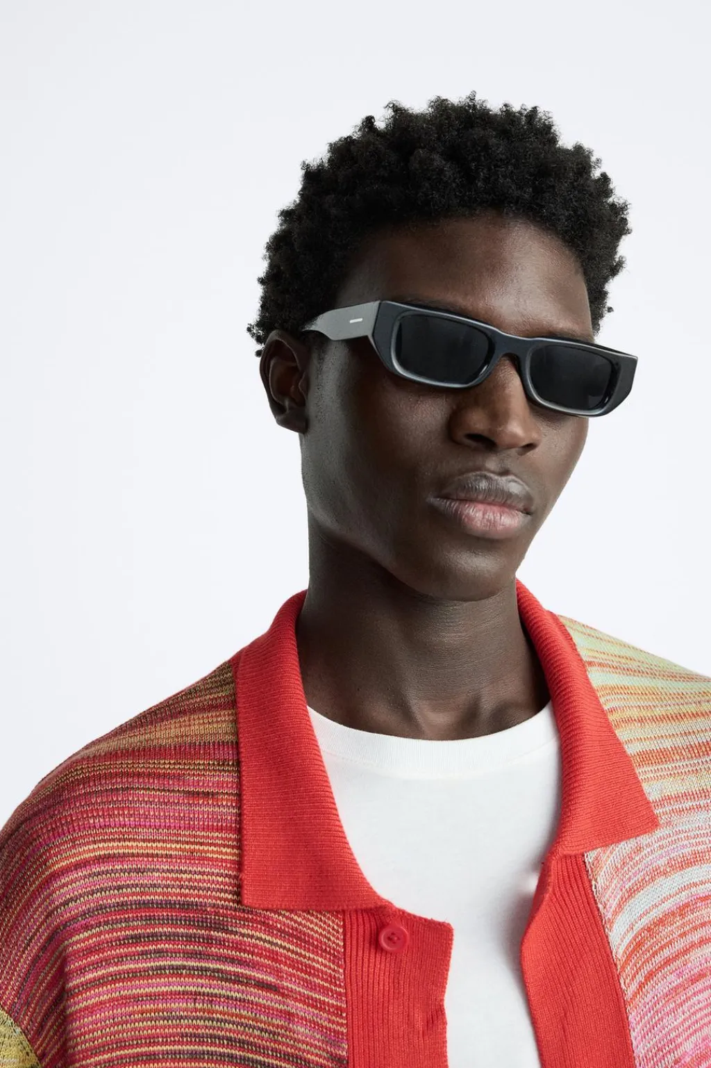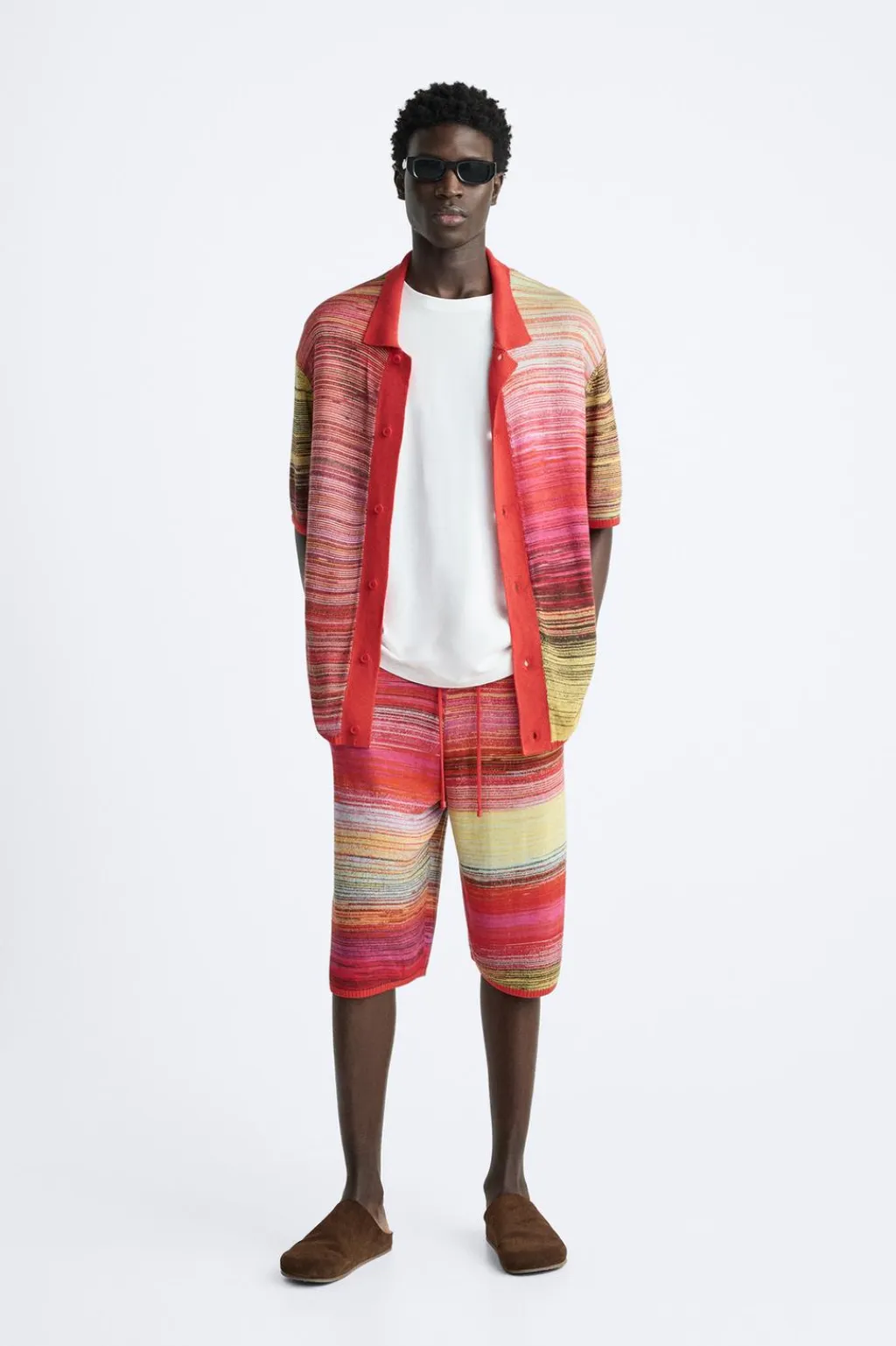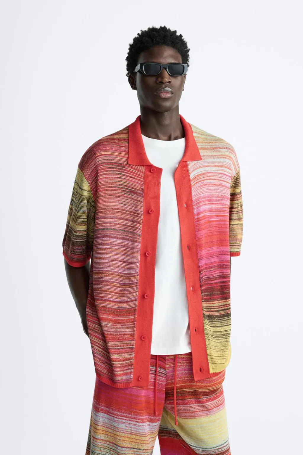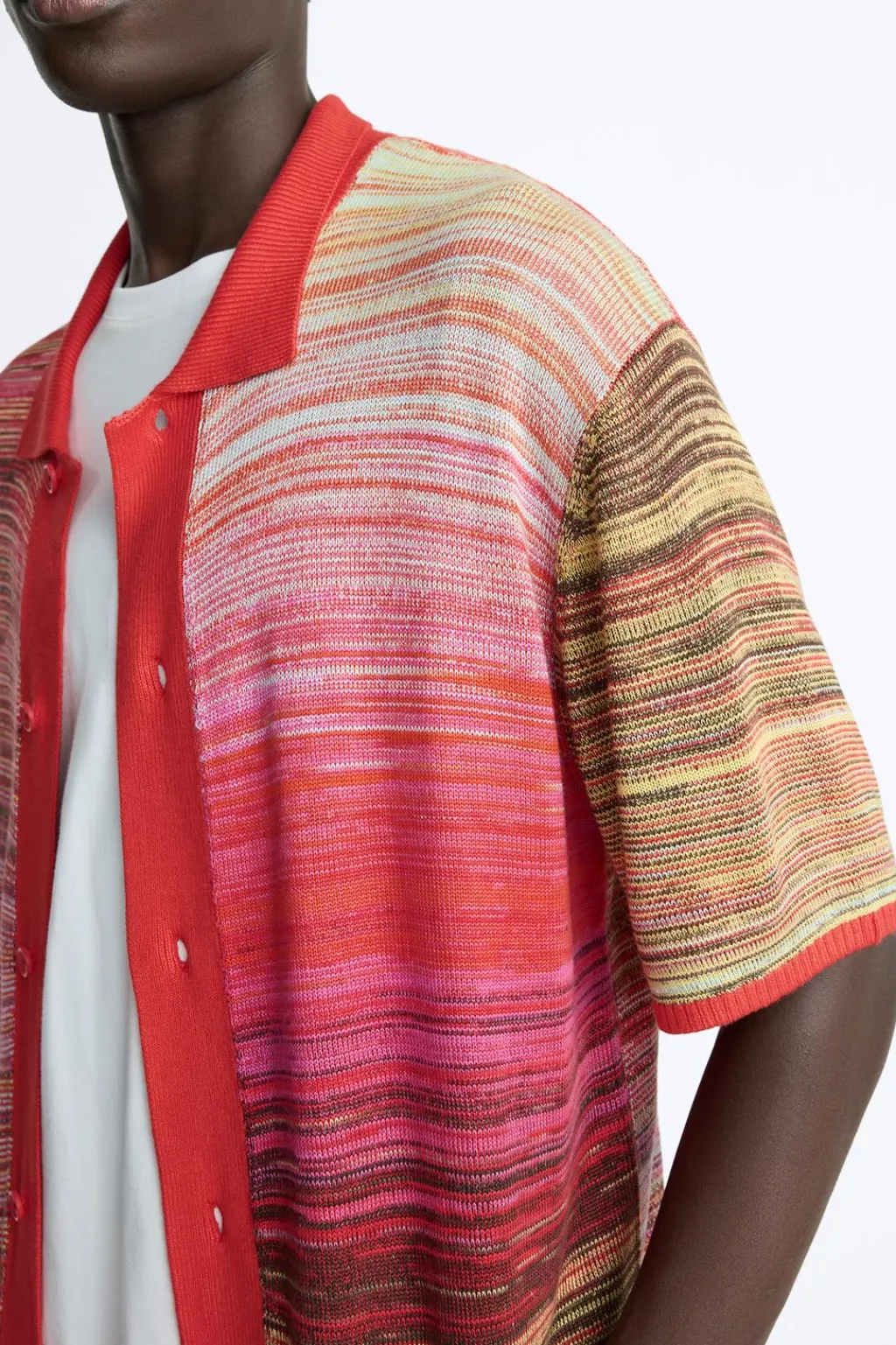 Camisa de punto tejida en hilatura con mezcla de viscosa y seda. Cuello solapa y manga corta. Cierre frontal de botonadura.