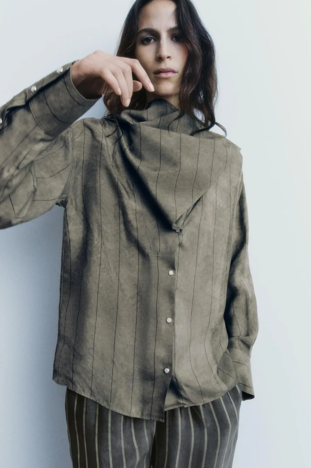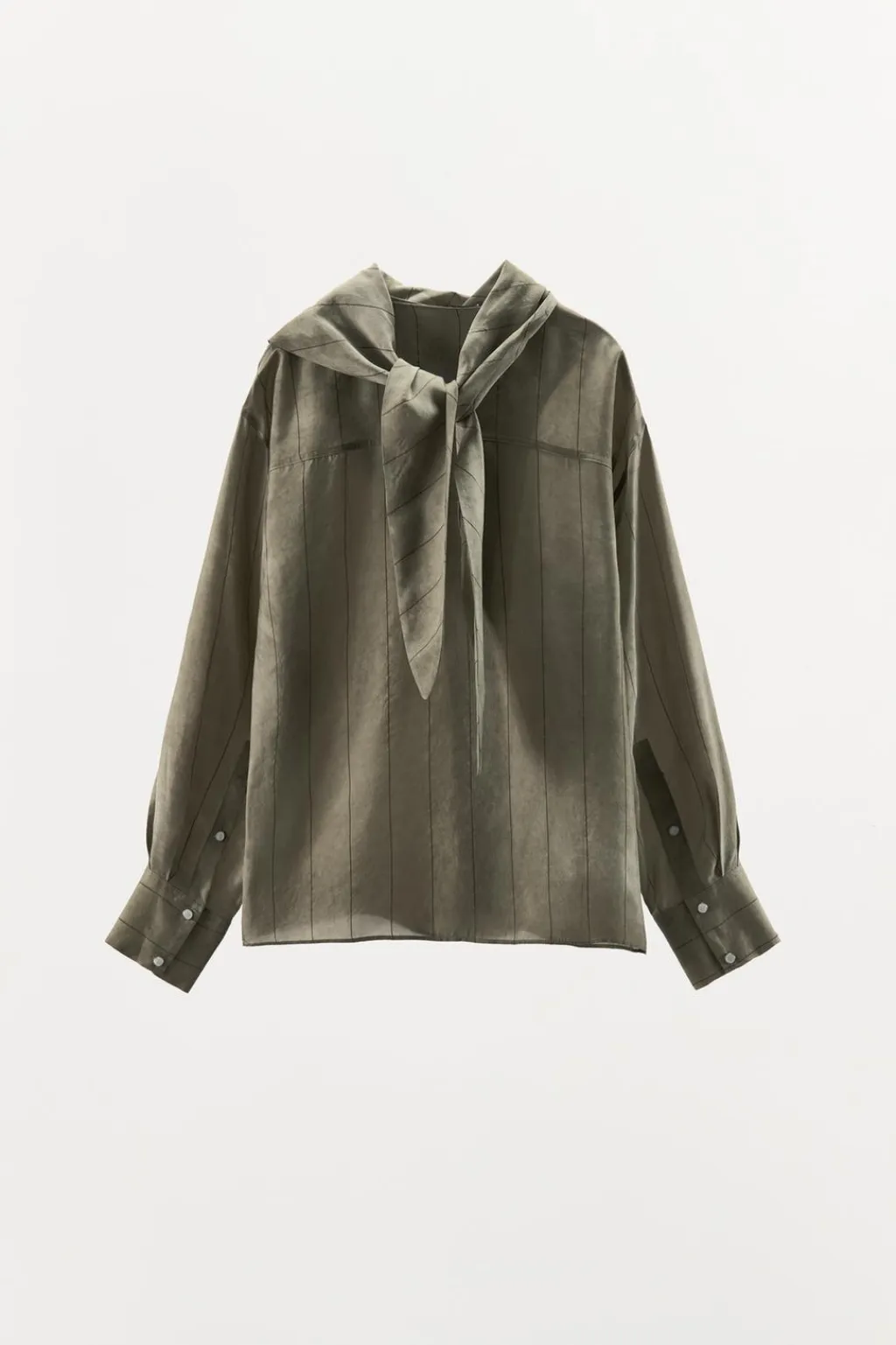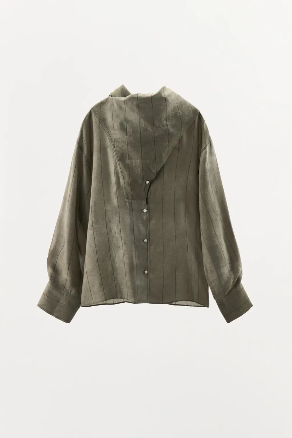 Camisa confeccionada en hilatura de cupro 100%. Cuello cruzado con bandana en mismo tejido ajustable con lazada. Manga larga acabada en puño con pliegues. Cierre frontal con botones a presión.