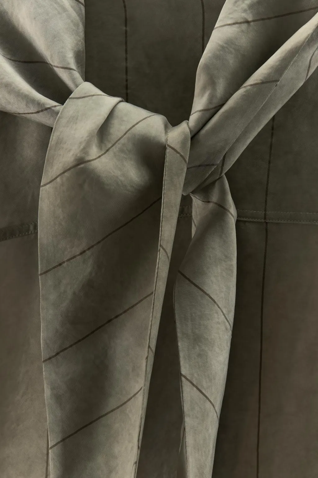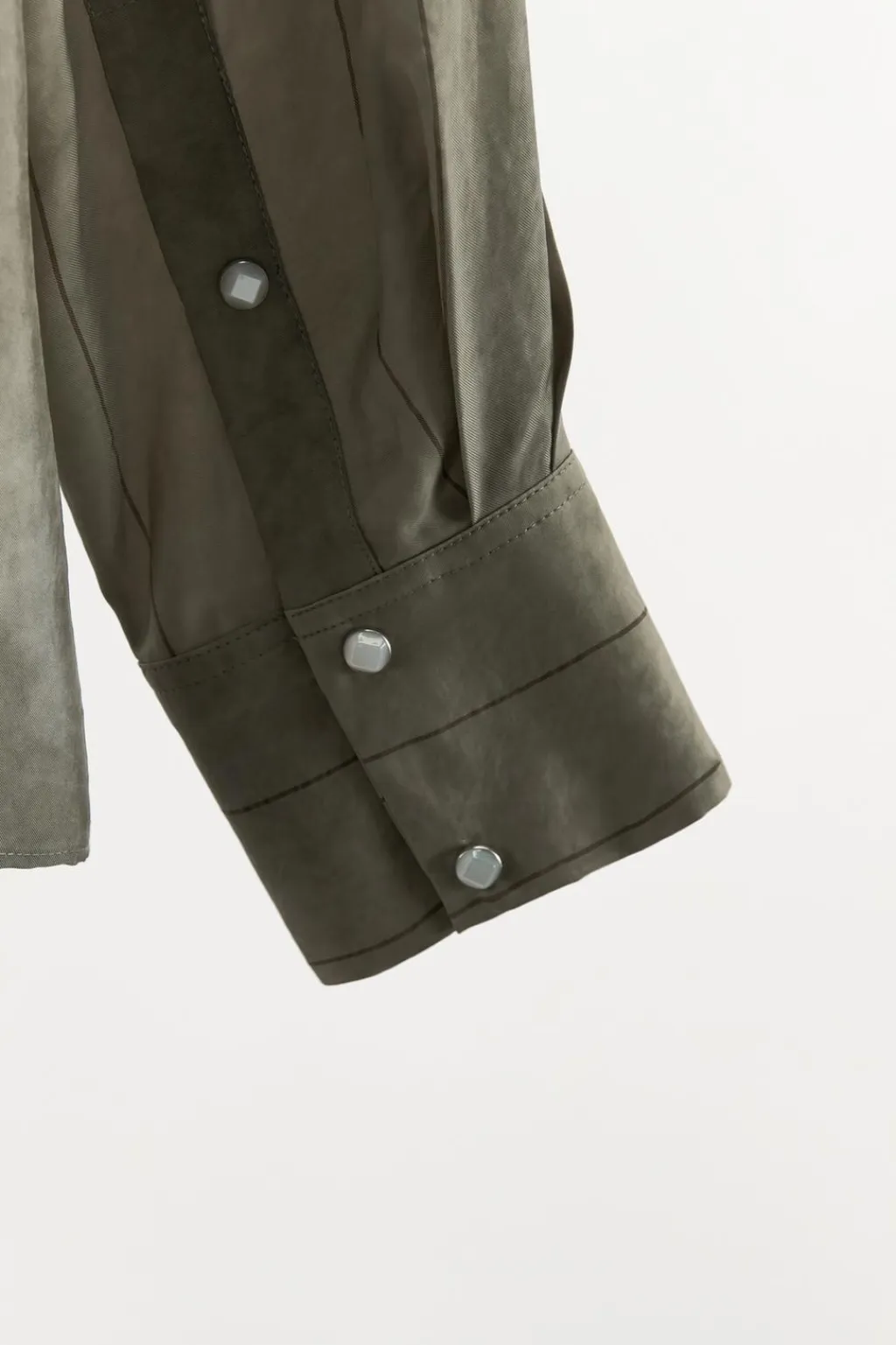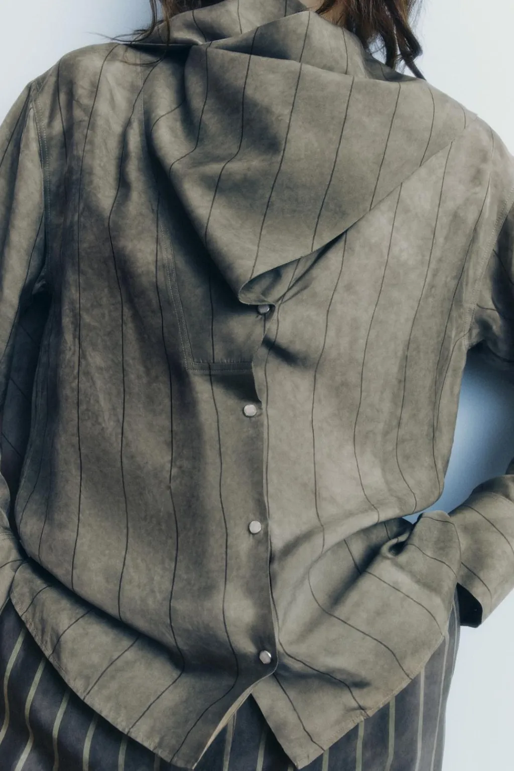 Camisa confeccionada en hilatura de cupro 100%. Cuello cruzado con bandana en mismo tejido ajustable con lazada. Manga larga acabada en puño con pliegues. Cierre frontal con botones a presión.