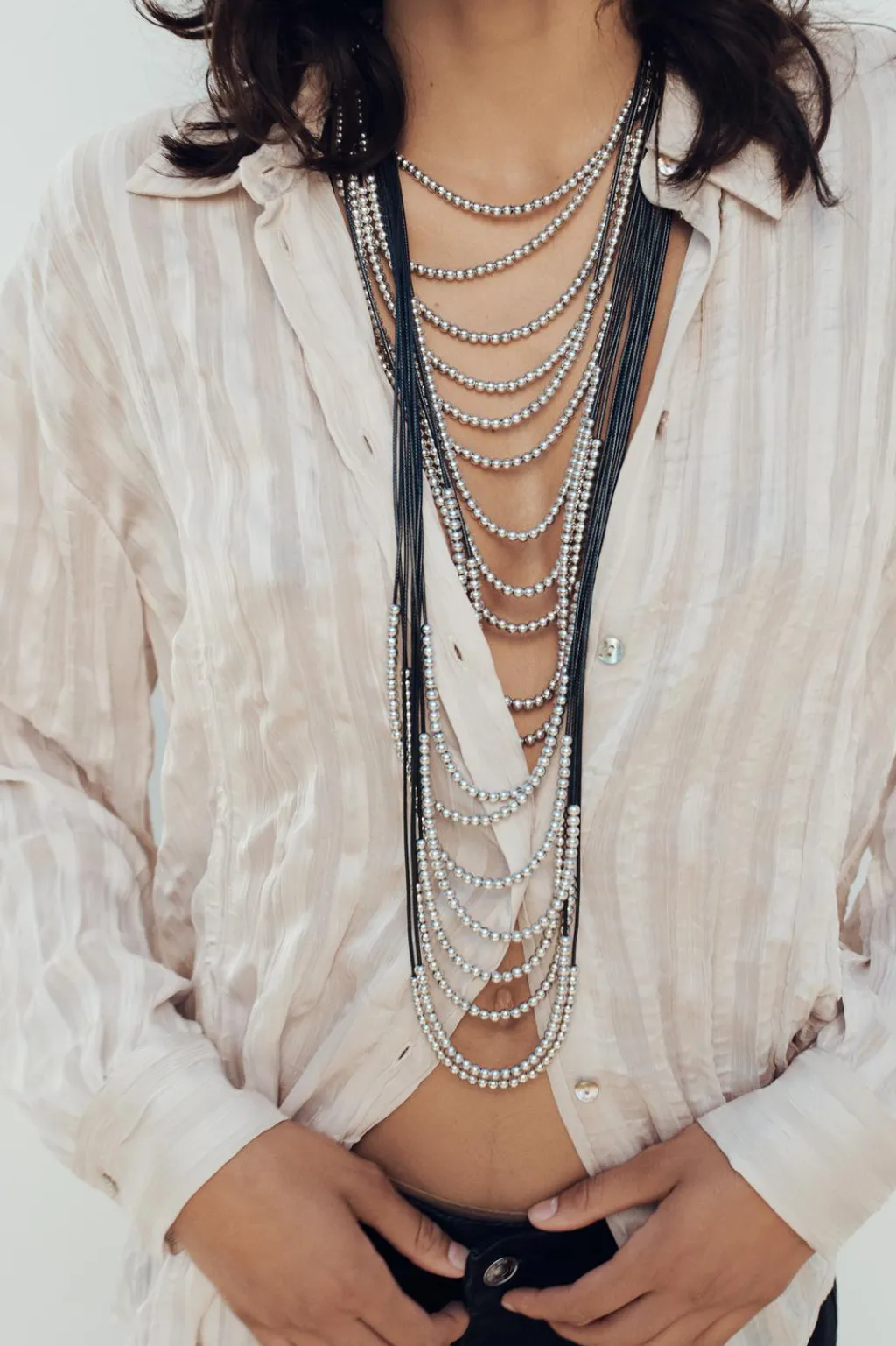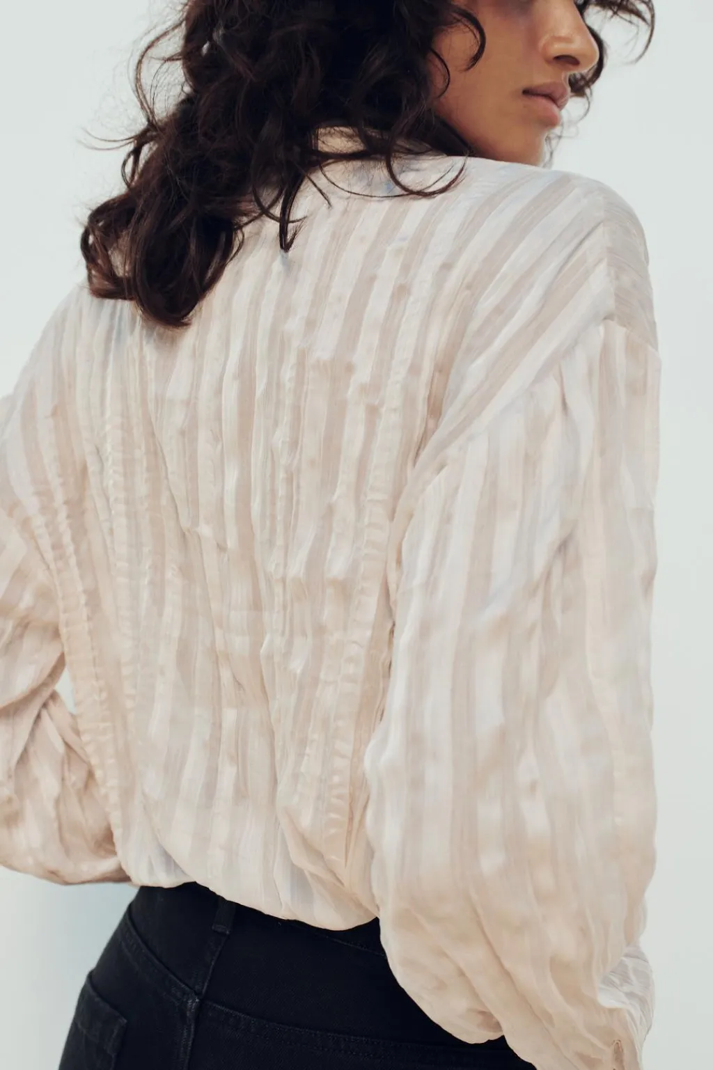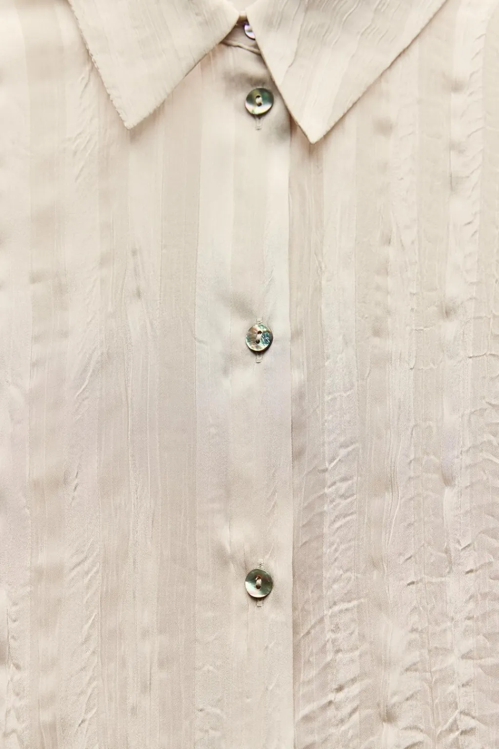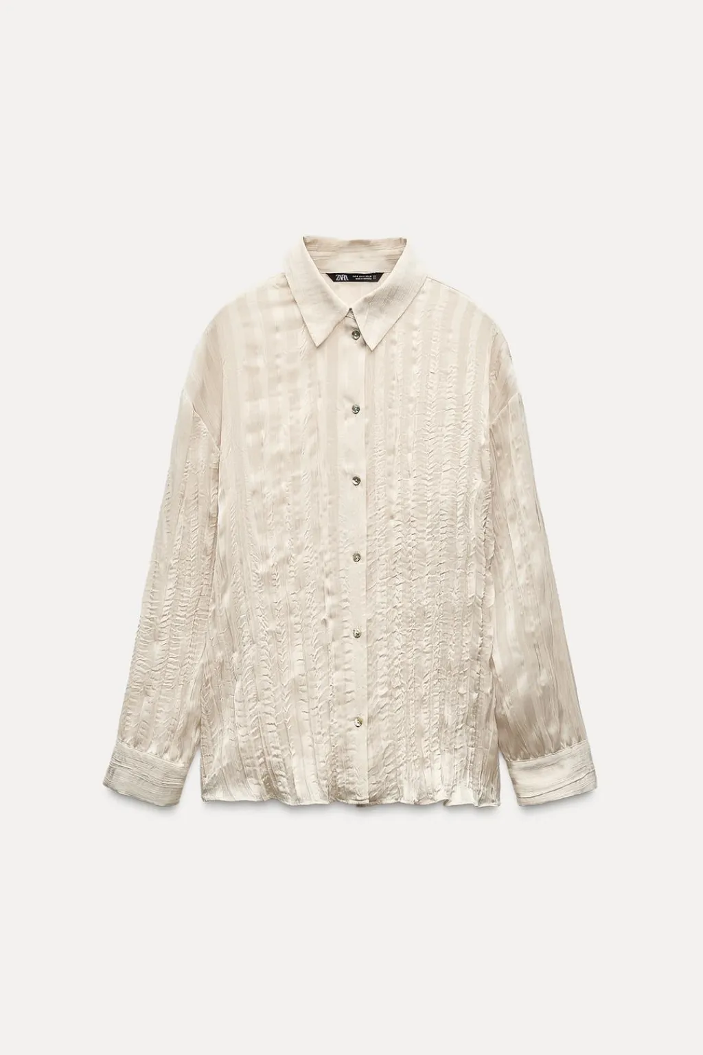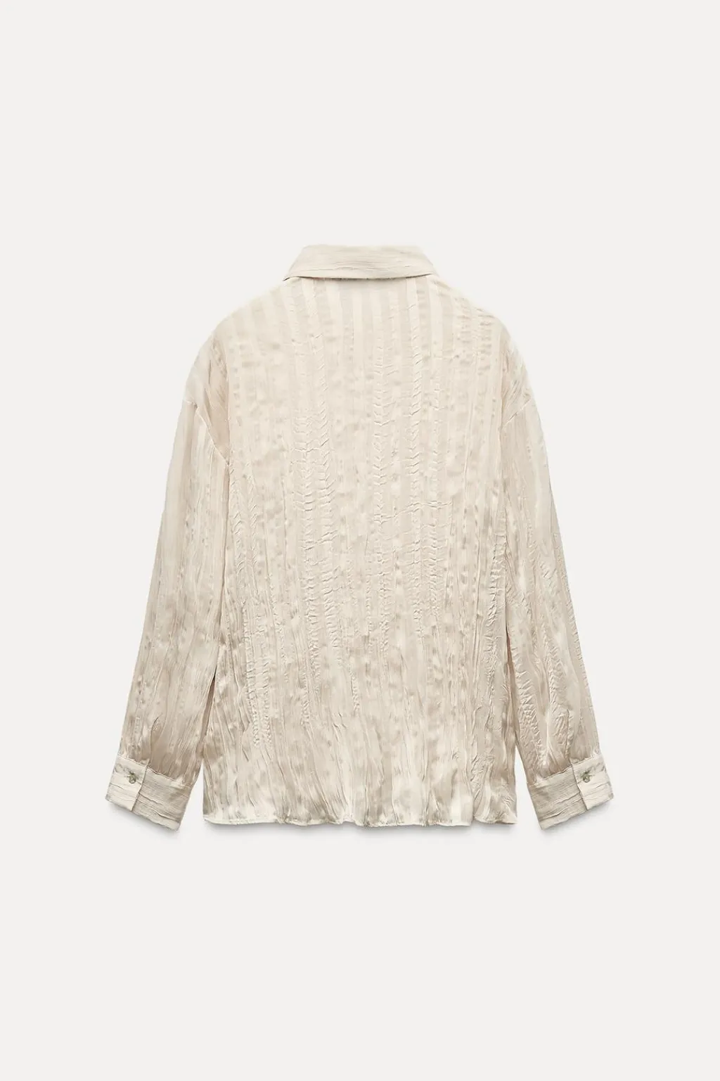Camisa de cuello solapa y manga larga. Cierre frontal con botones. Detalle de tejido efecto arrugado.