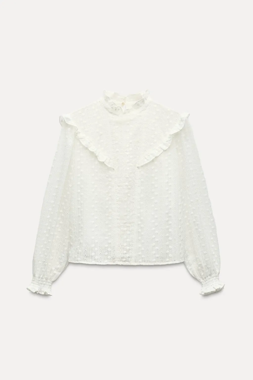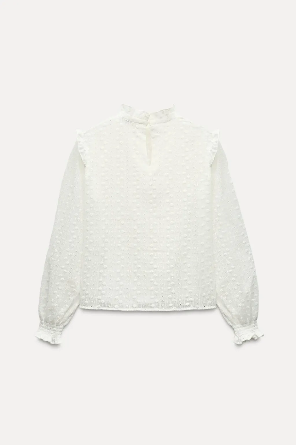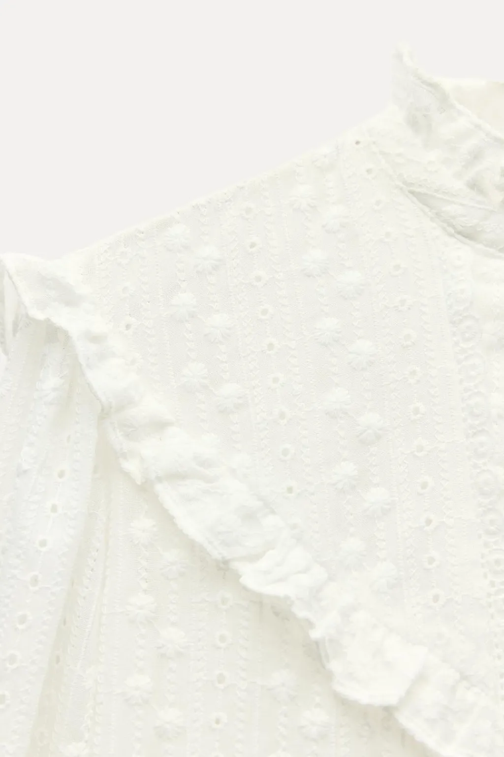 Camisa de cuello subido y manga larga acabada en puño elástico. Detalle de acabados con volantes y bordados perforados a tono. Cierre en espalda con abertura y botón.