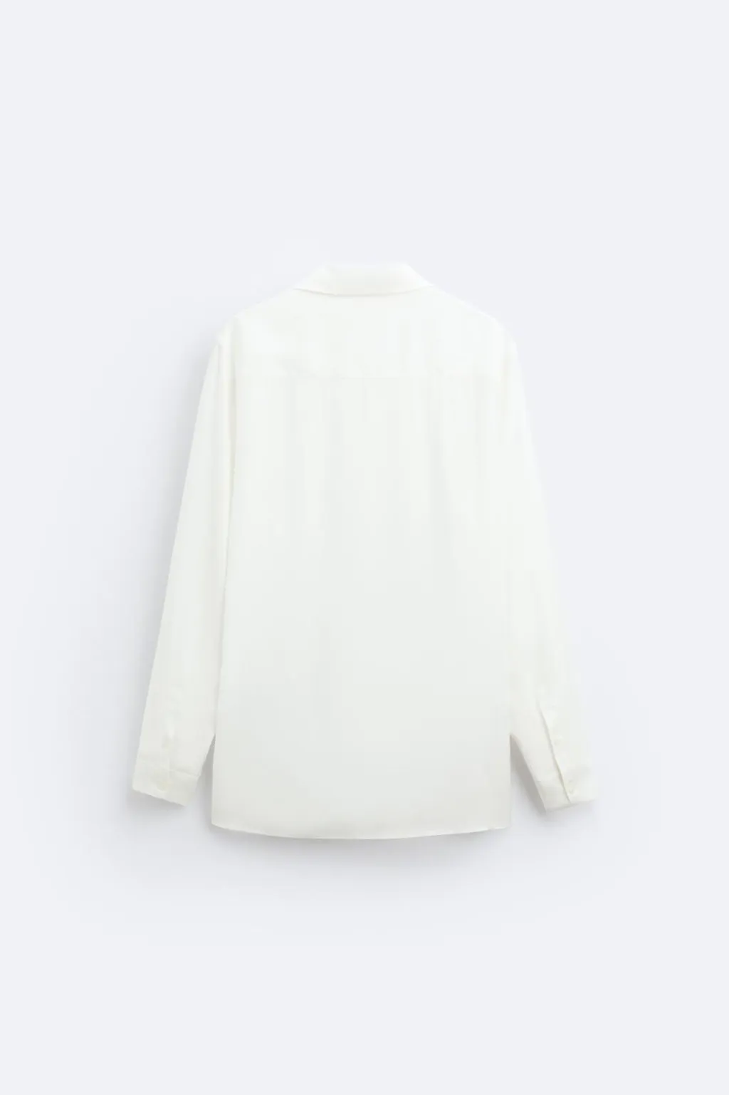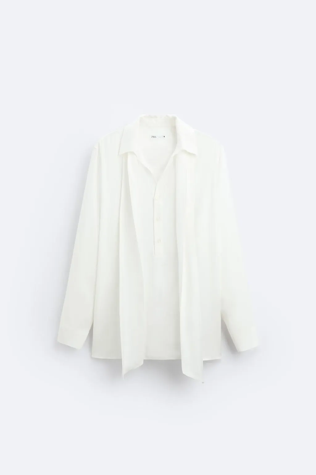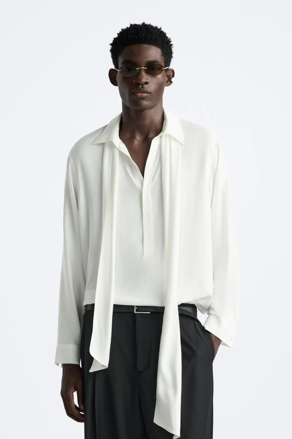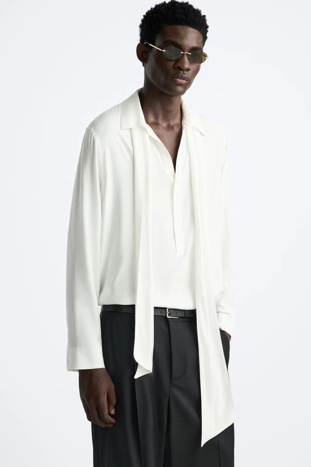 Camisa relaxed fit confeccionada en tejido de viscosa satinada. Cuello polo con abertura frontal y cierre de botonadura. Detalle de lazo en el mismo tejido. Manga larga acabada en puño con botones. Bajo asimétrico con aberturas laterales.