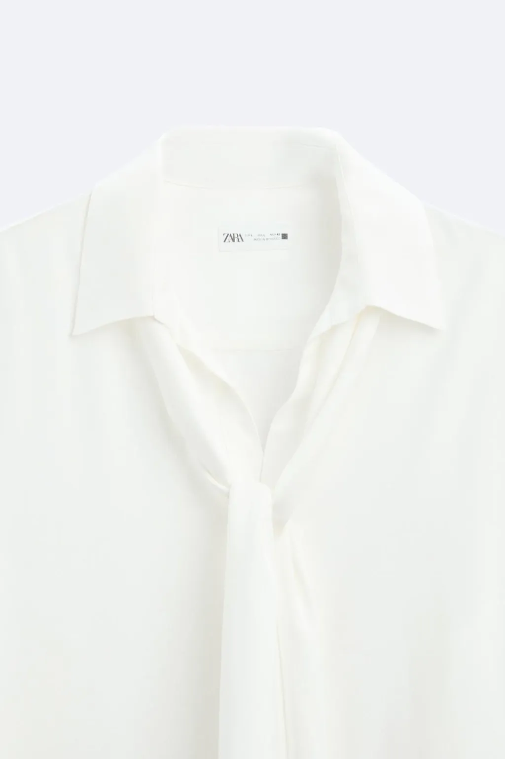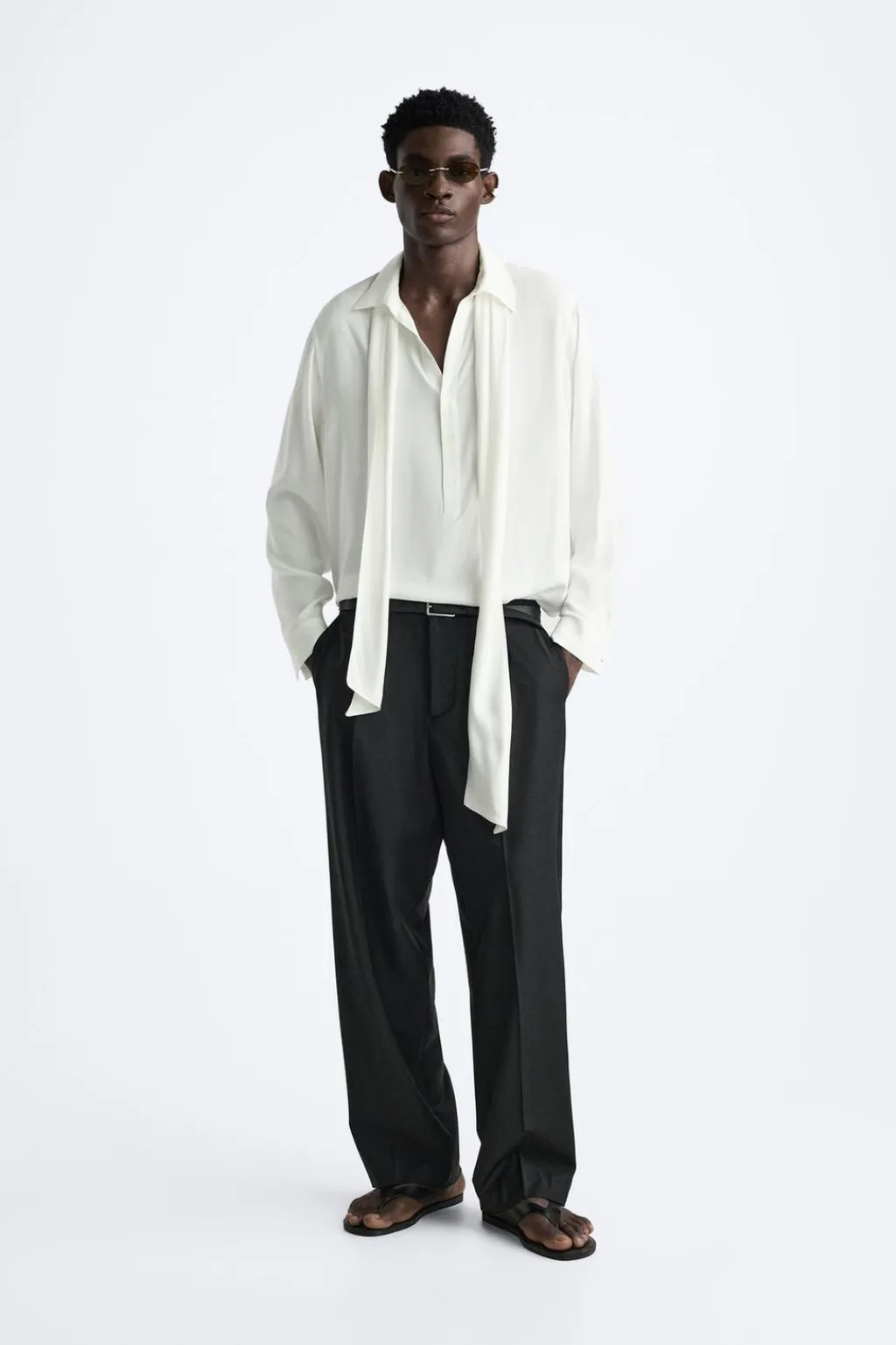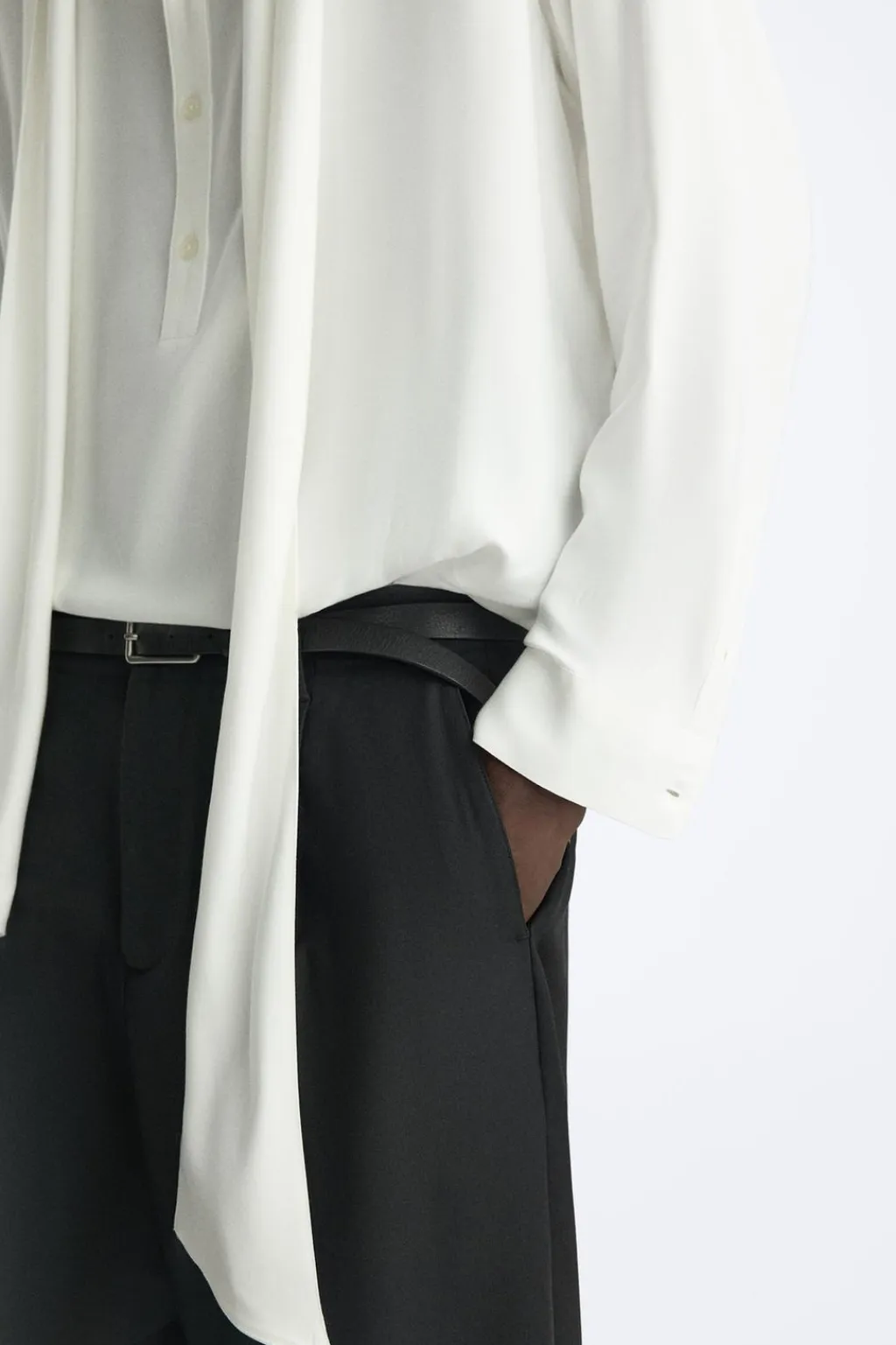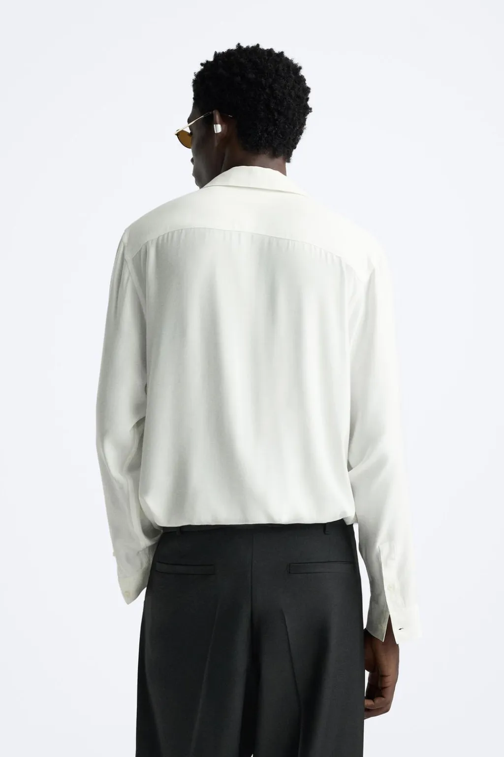 Camisa relaxed fit confeccionada en tejido de viscosa satinada. Cuello polo con abertura frontal y cierre de botonadura. Detalle de lazo en el mismo tejido. Manga larga acabada en puño con botones. Bajo asimétrico con aberturas laterales.