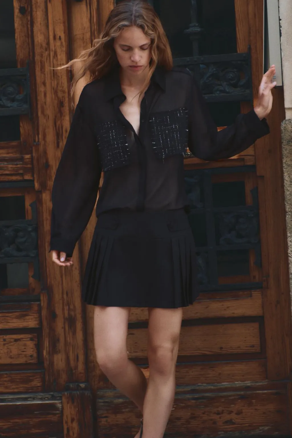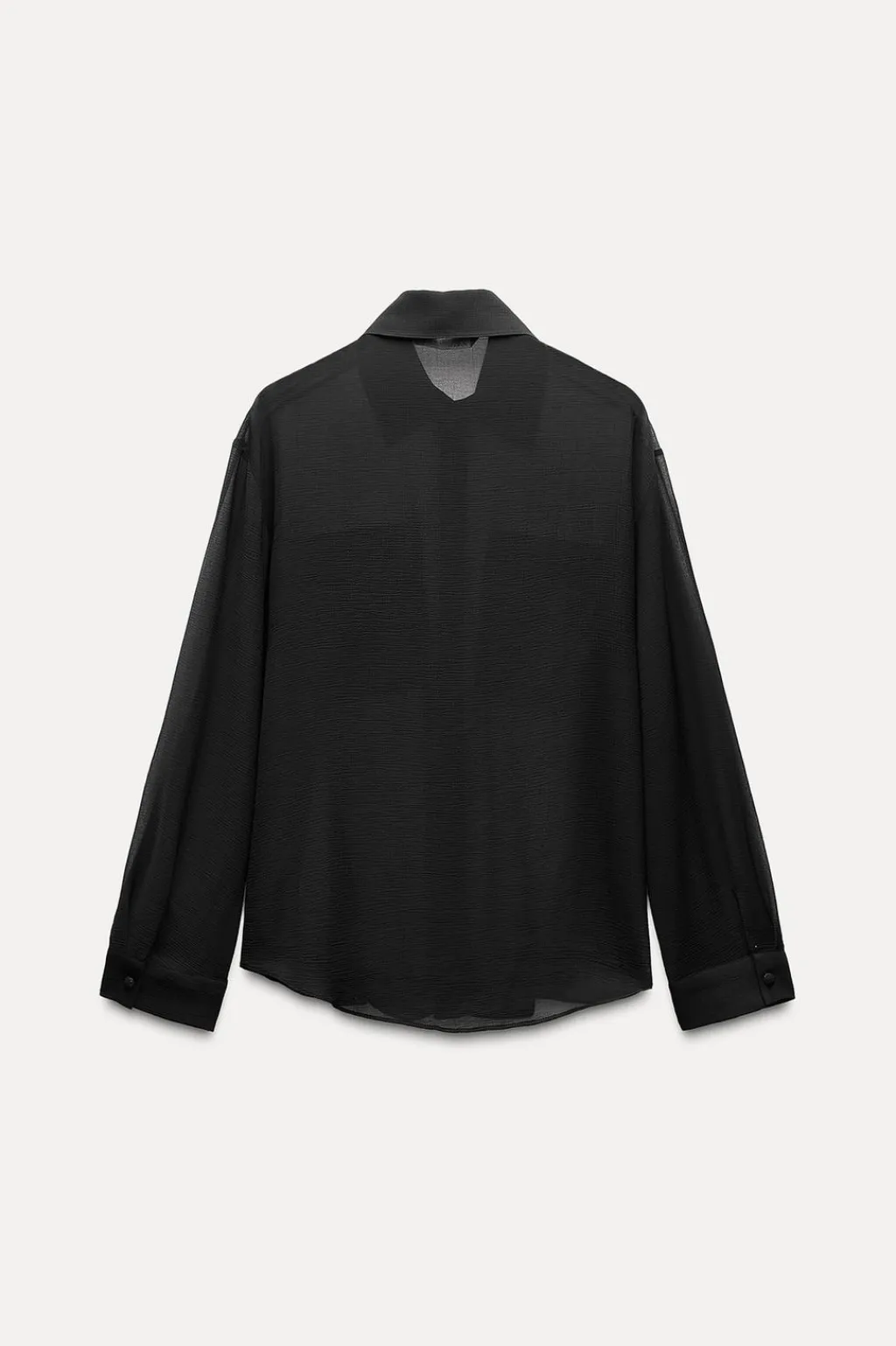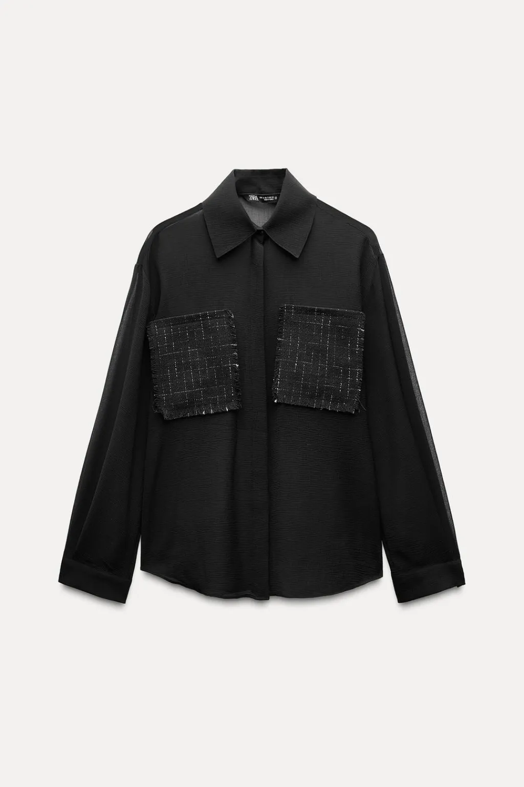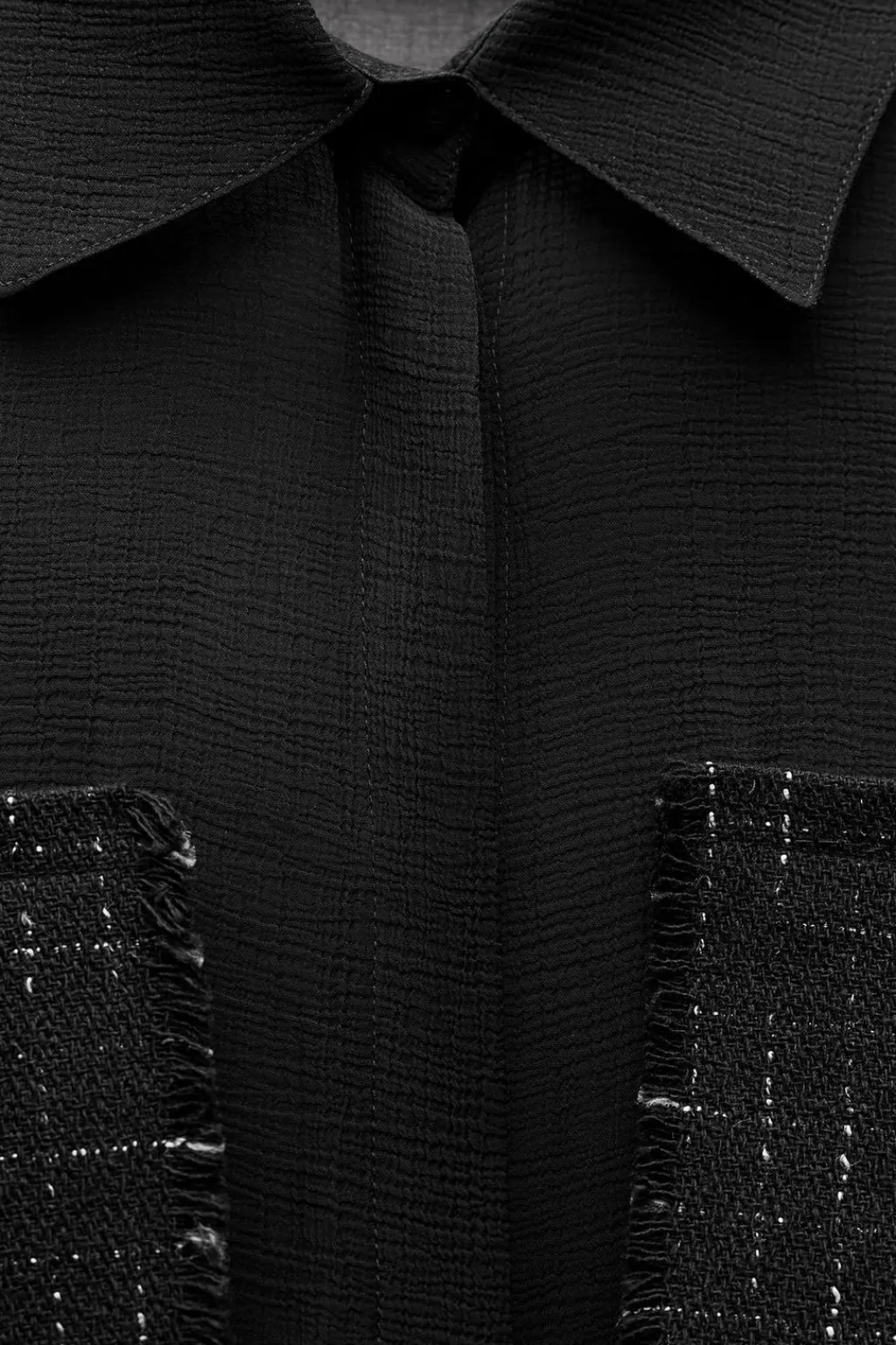 Camisa con tejido combinado semitransparente y bolsillos delanteros en estructura. Cuello solapa y manga larga. Cierre frontal con botones ocultos por solapa.