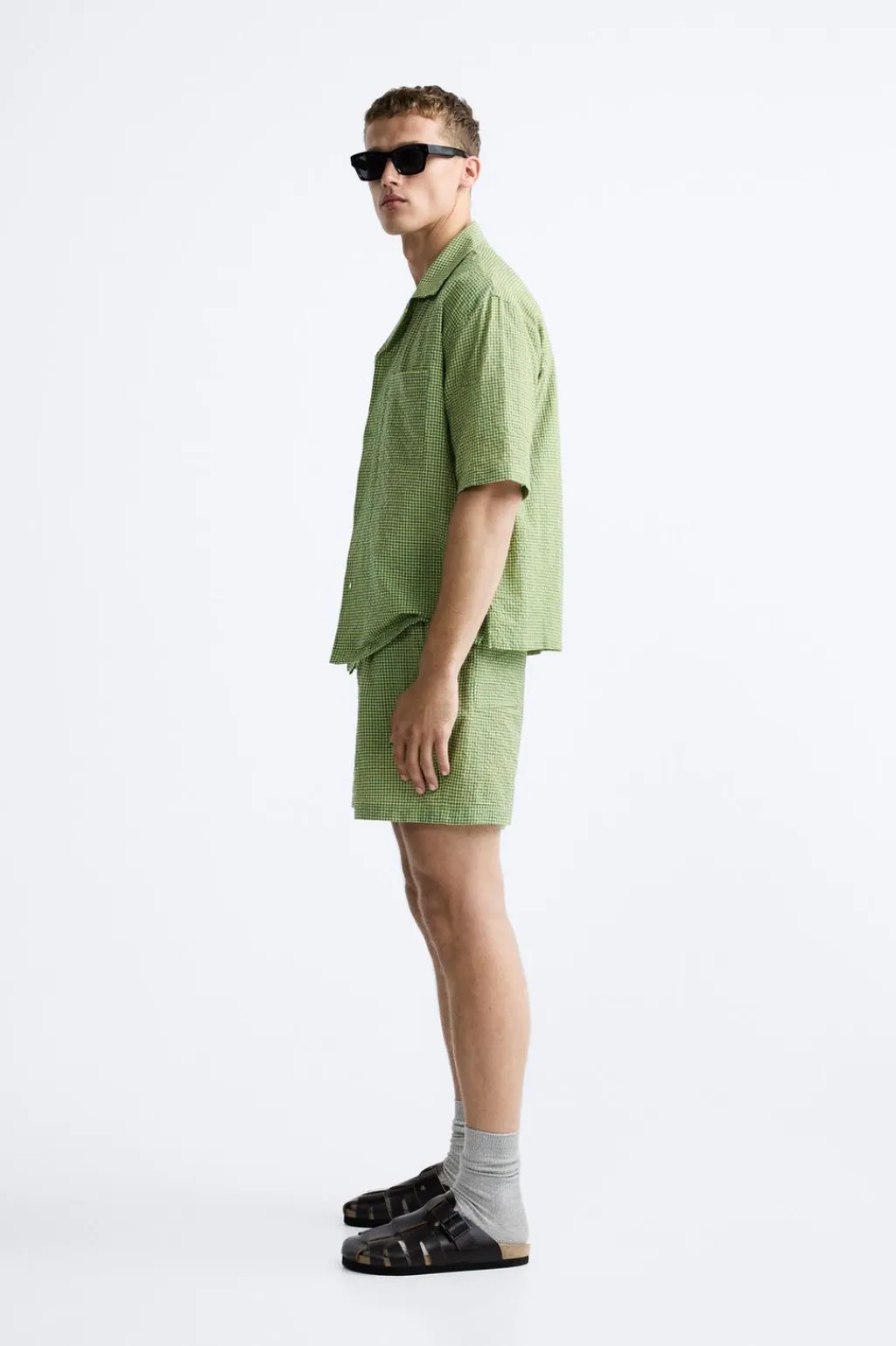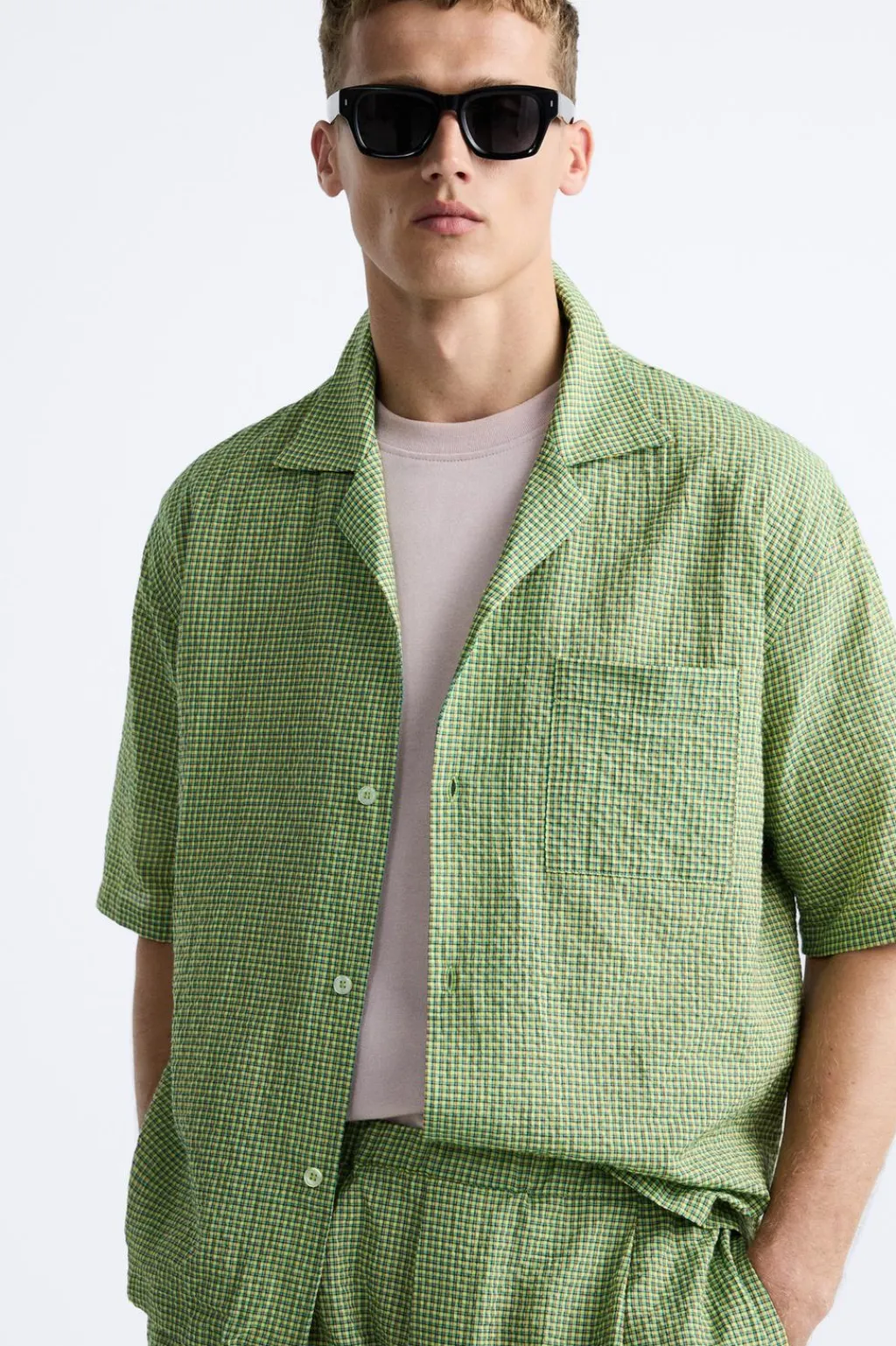 Camisa relaxed fit confeccionada en tejido ligero. Cuello bowling y manga corta. Bajo con aberturas laterales. Cierre frontal de botonadura.