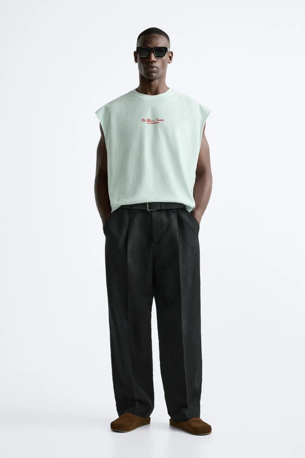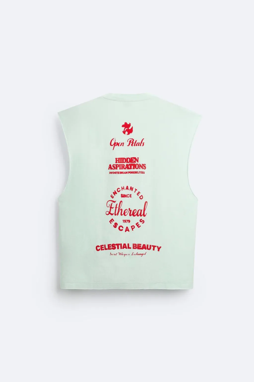Camiseta relaxed fit. Cuello redondo y manga sisa. Estampaciones combinadas a contraste en delantero y espalda. Acabados irregulares.