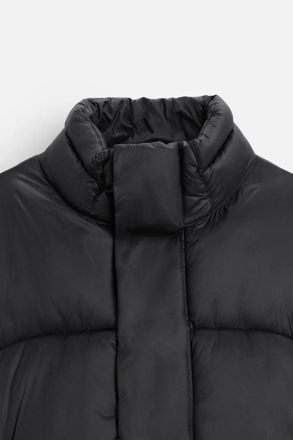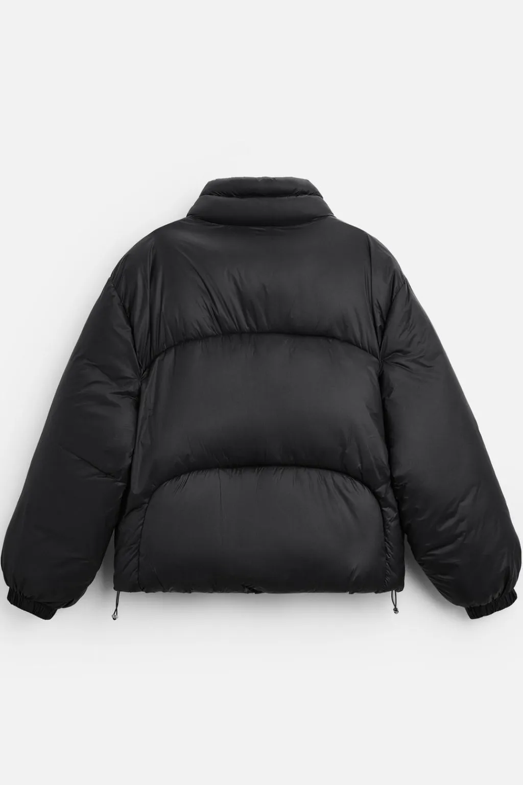Cazadora boxy fit confeccionada en tejido técnico. Cuello subido y manga larga acabada en puño con elástico. Bolsillos de vivo en cadera y detalle de bolsillo interior. Bajo ajustable con elásticos en laterales. Cierre frontal de cremallera oculta por solapa con botones a presión.