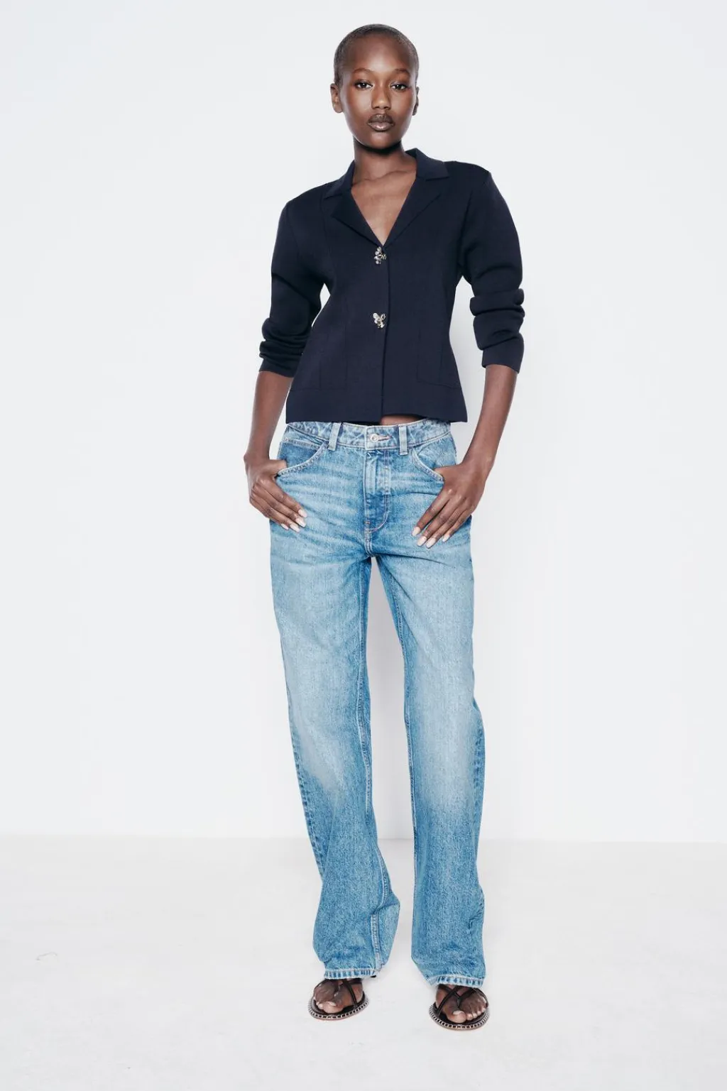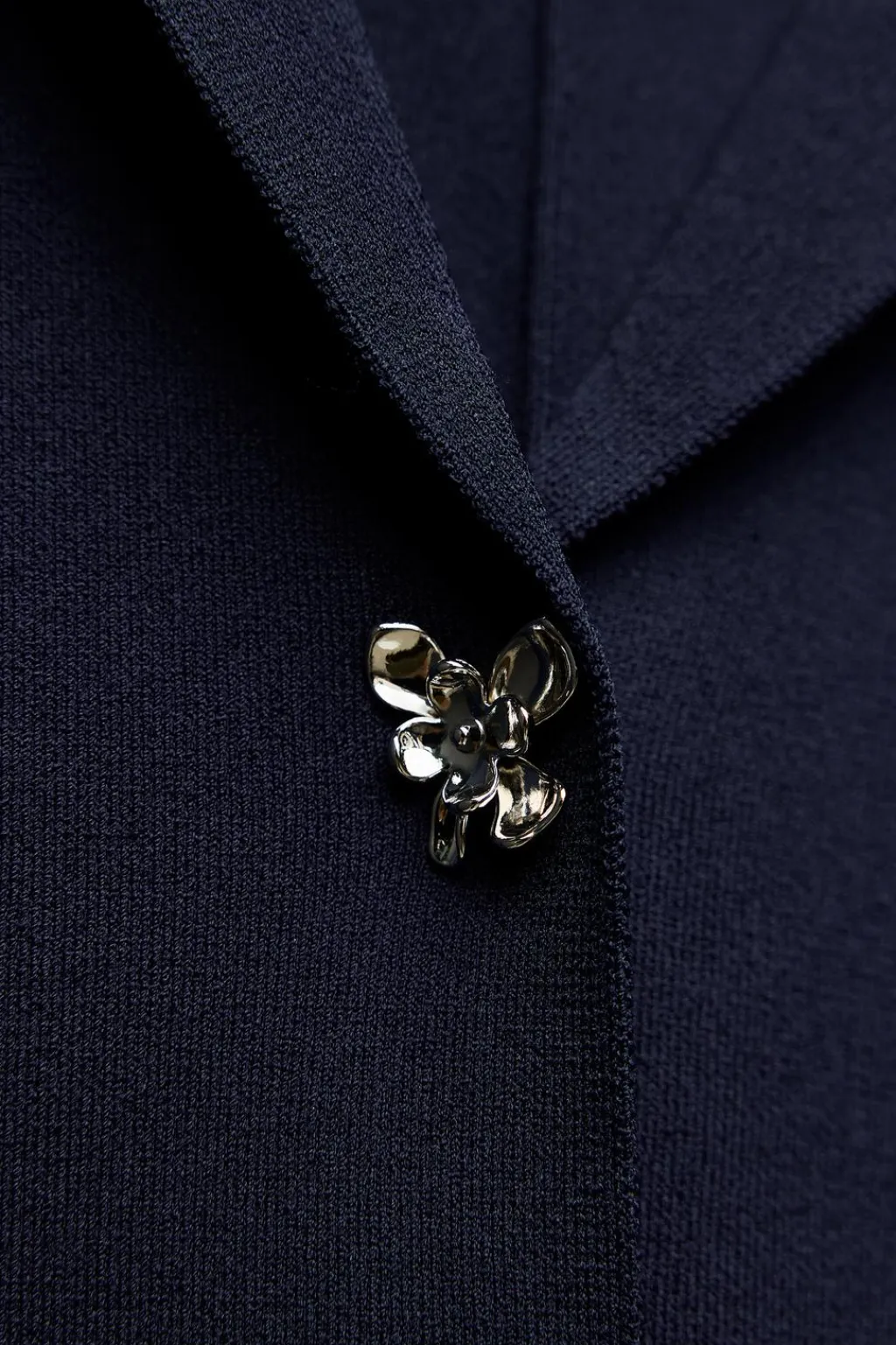 Chaqueta entallada de cuello solapa y manga larga. Cierre frontal con botones metálicos con forma de flor.