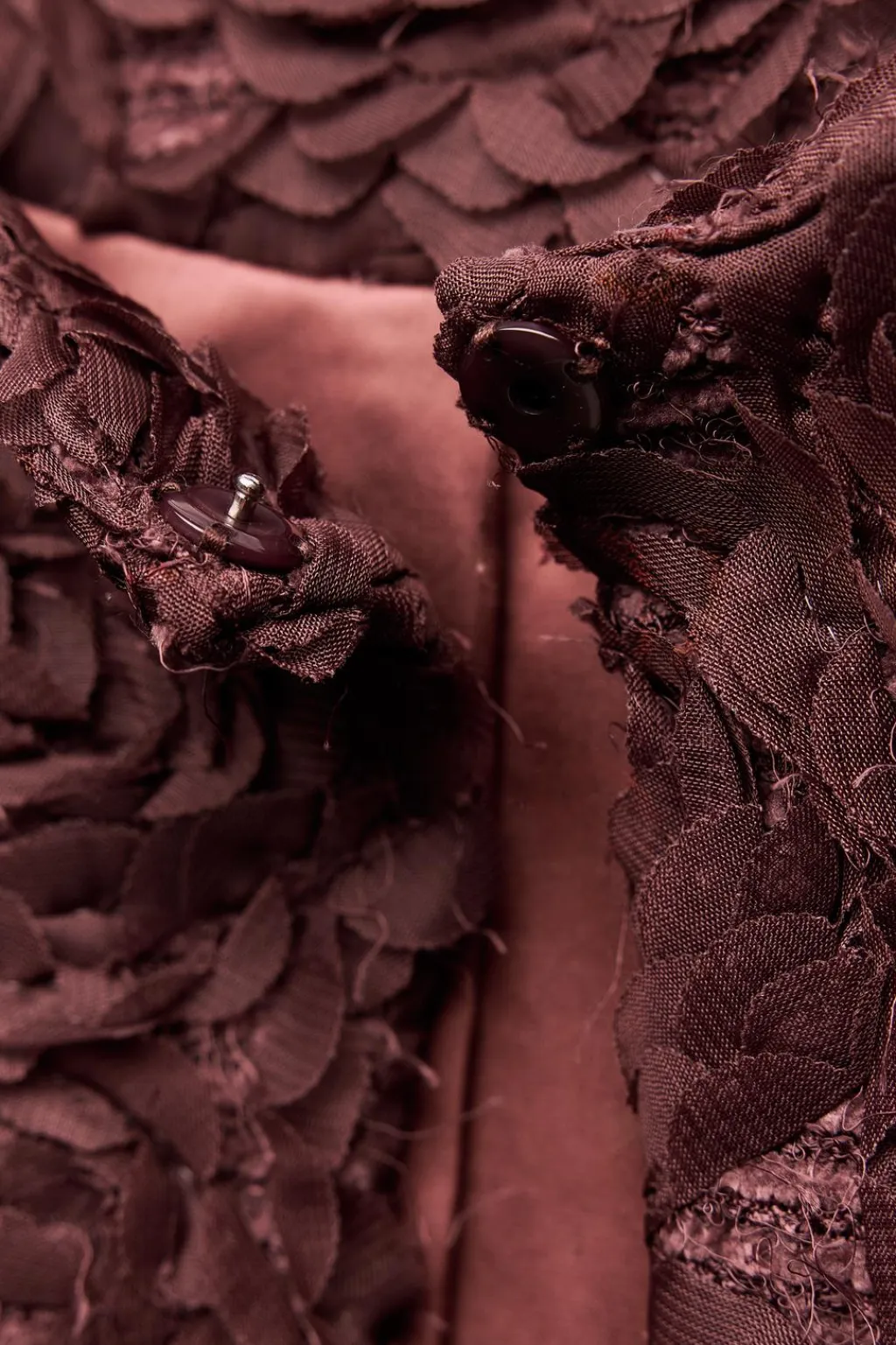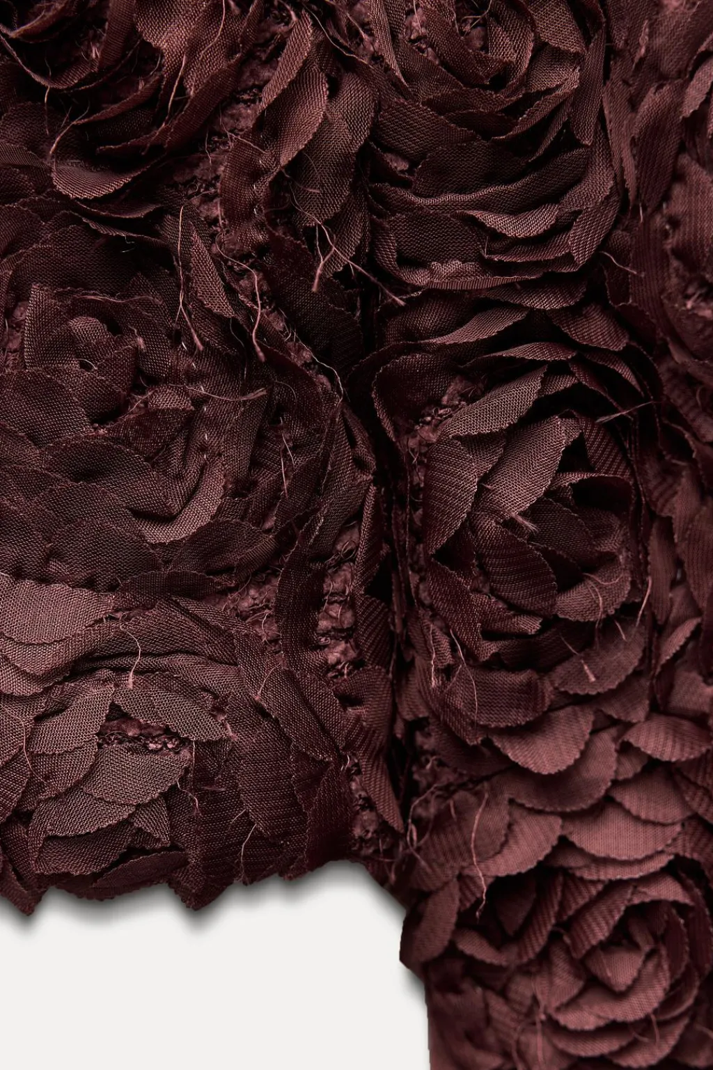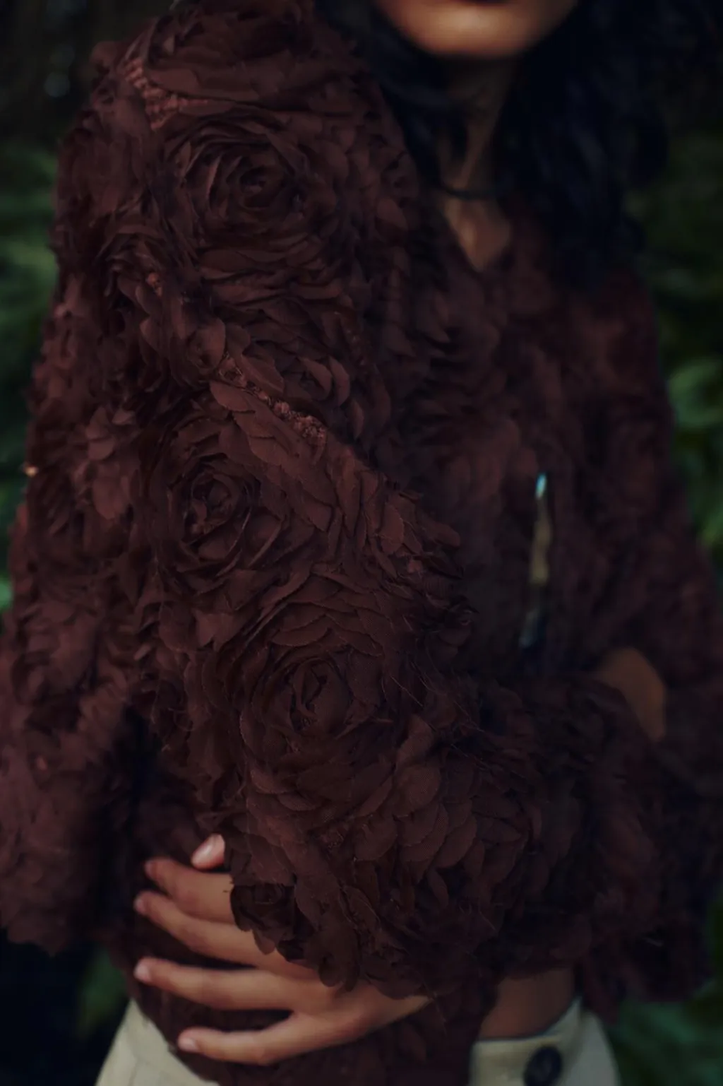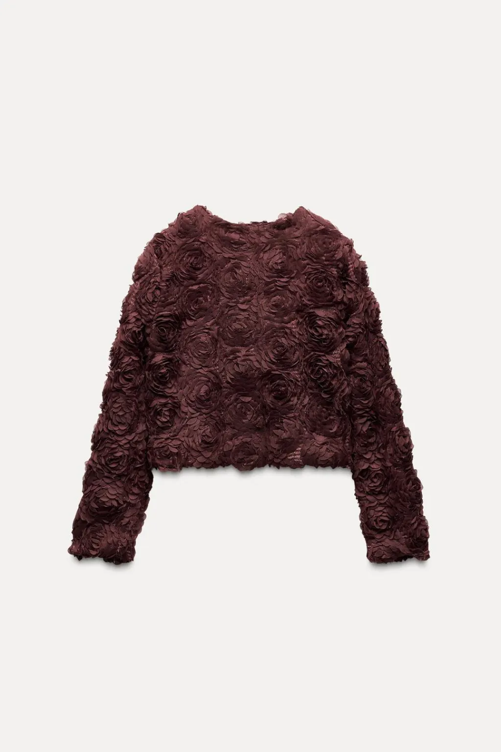 Chaqueta de cuello redondo y manga larga. Detalle de tejido en estructura en forma de flor. Cierre frontal con botón a presión.